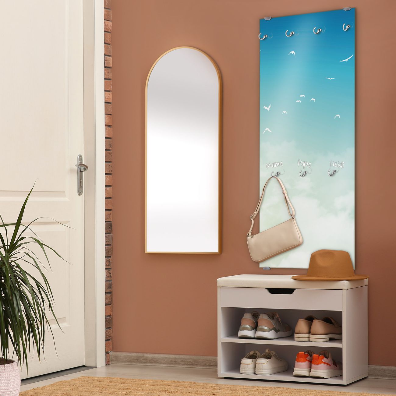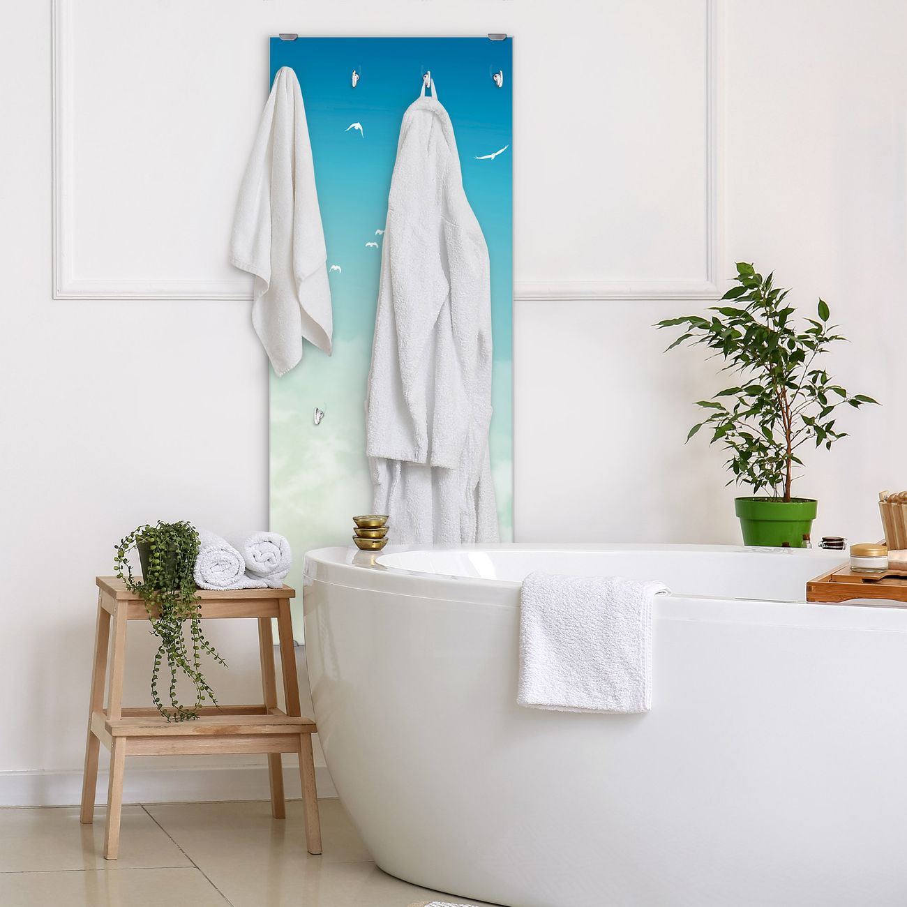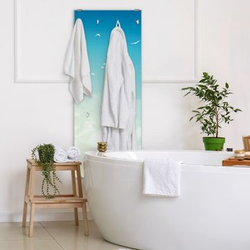 FUNKTION: Die banjado Wandgarderobe mit Motiv Wolken 8 ist Ihr täglicher Begleiter. Zuverlässig hängen hier Ihre Jacken und Mäntel griffbereit. Das Echtglas ist Ihr Paneel auch beschreibbar und wieder abwischbar. DESIGN: Sie erhalten eine Garderobenleiste aus elegantem Echtglas mit dem Farbbrillanten Motiv Wolken 8 hinterklebt. Das Design ist zeitlos klassisch, ohne dabei auf Funktionalität zu verzichten. Suchen Sie aus einer Vielzahl von Motiven das für Ihre Einrichtung Passende aus. DETAILS: Die Flurgarderobe besteht aus 4mm gehärtetem Sicherheitsglas. Sie ist 50cm breit, 125cm hoch und 6cm tief. Die Garderobenhaken zur Selbstmontage präsentieren sich in Edelstahl-Optik, ebenso die Abstandshalter für die Wandmontage. Ihre neue Garderobe ist sofort einsatzbereit. NUTZEN: Ihre neue Garderobe hält nicht nur zuverlässig Ihre Kleidung, sie ist auch optisch ein Blickfang. Durch das Glas können Sie an der Garderobe mit wasserlöslichen Kreidestiften oder Whiteboard-Markern auch Nachrichten hinterlassen. BANJADO: Wir sind ein kleines kreatives Team aus Sachsen und entwickeln Produkte die Design und Funktionalität verbinden sollen. Viel Freude mit Ihrer neuen Garderobe wünscht das banjado-Team!