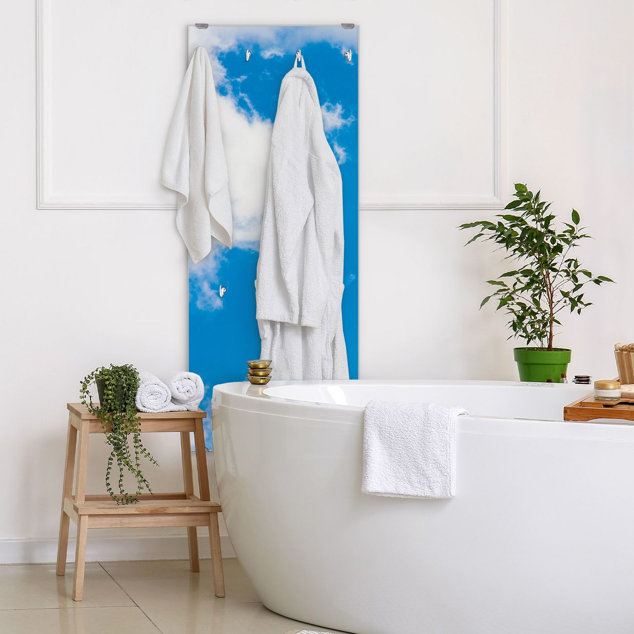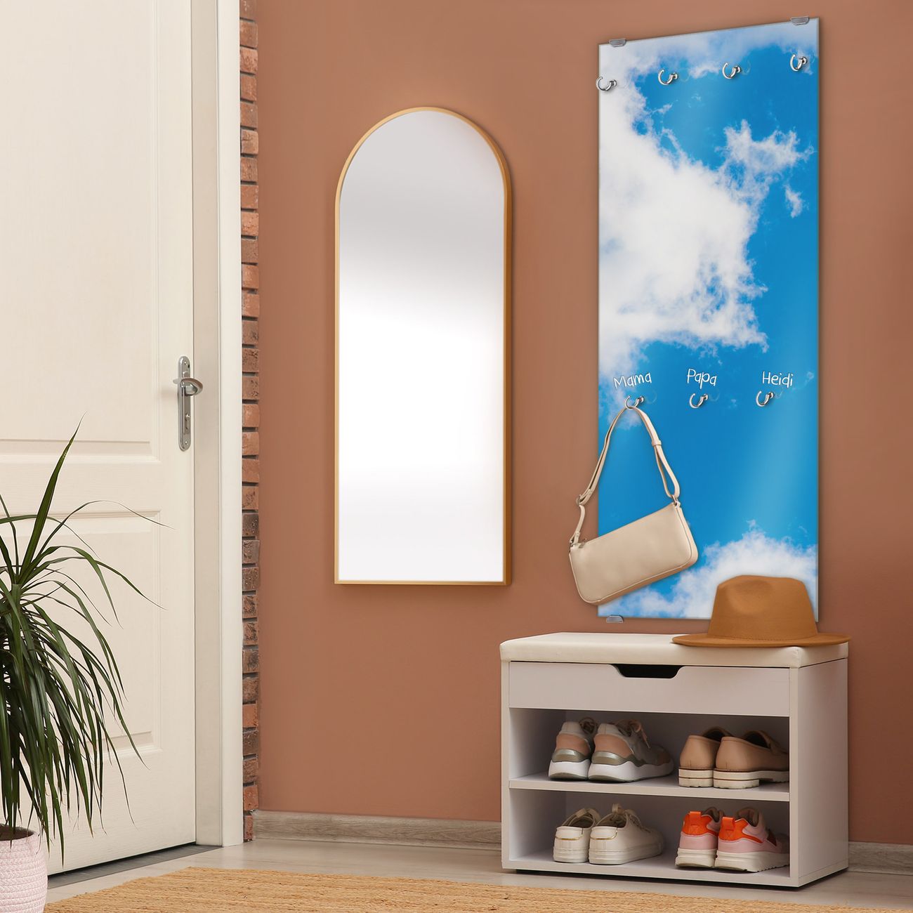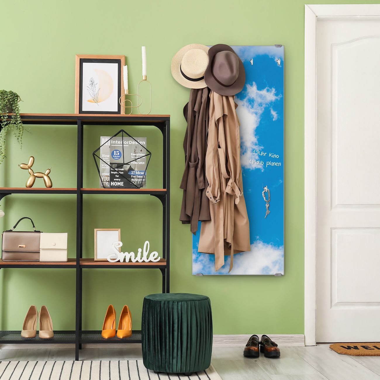 FUNKTION: Die banjado Wandgarderobe mit Motiv Wolken 9 ist Ihr täglicher Begleiter. Zuverlässig hängen hier Ihre Jacken und Mäntel griffbereit. Das Echtglas ist Ihr Paneel auch beschreibbar und wieder abwischbar. DESIGN: Sie erhalten eine Garderobenleiste aus elegantem Echtglas mit dem Farbbrillanten Motiv Wolken 9 hinterklebt. Das Design ist zeitlos klassisch, ohne dabei auf Funktionalität zu verzichten. Suchen Sie aus einer Vielzahl von Motiven das für Ihre Einrichtung Passende aus. DETAILS: Die Flurgarderobe besteht aus 4mm gehärtetem Sicherheitsglas. Sie ist 50cm breit, 125cm hoch und 6cm tief. Die Garderobenhaken zur Selbstmontage präsentieren sich in Edelstahl-Optik, ebenso die Abstandshalter für die Wandmontage. Ihre neue Garderobe ist sofort einsatzbereit. NUTZEN: Ihre neue Garderobe hält nicht nur zuverlässig Ihre Kleidung, sie ist auch optisch ein Blickfang. Durch das Glas können Sie an der Garderobe mit wasserlöslichen Kreidestiften oder Whiteboard-Markern auch Nachrichten hinterlassen. BANJADO: Wir sind ein kleines kreatives Team aus Sachsen und entwickeln Produkte die Design und Funktionalität verbinden sollen. Viel Freude mit Ihrer neuen Garderobe wünscht das banjado-Team!