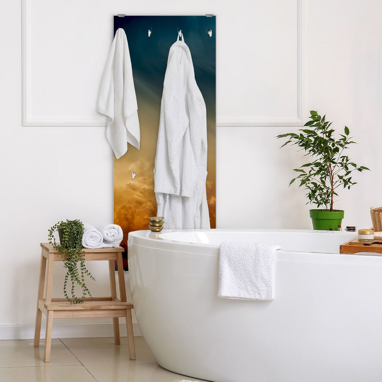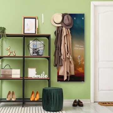 FUNKTION: Die banjado Wandgarderobe mit Motiv Wolken in der Dämmerung ist Ihr täglicher Begleiter. Zuverlässig hängen hier Ihre Jacken und Mäntel griffbereit. Das Echtglas ist Ihr Paneel auch beschreibbar und wieder abwischbar. DESIGN: Sie erhalten eine Garderobenleiste aus elegantem Echtglas mit dem Farbbrillanten Motiv Wolken in der Dämmerung hinterklebt. Das Design ist zeitlos klassisch, ohne dabei auf Funktionalität zu verzichten. Suchen Sie aus einer Vielzahl von Motiven das für Ihre Einrichtung Passende aus. DETAILS: Die Flurgarderobe besteht aus 4mm gehärtetem Sicherheitsglas. Sie ist 50cm breit, 125cm hoch und 6cm tief. Die Garderobenhaken zur Selbstmontage präsentieren sich in Edelstahl-Optik, ebenso die Abstandshalter für die Wandmontage. Ihre neue Garderobe ist sofort einsatzbereit. NUTZEN: Ihre neue Garderobe hält nicht nur zuverlässig Ihre Kleidung, sie ist auch optisch ein Blickfang. Durch das Glas können Sie an der Garderobe mit wasserlöslichen Kreidestiften oder Whiteboard-Markern auch Nachrichten hinterlassen. BANJADO: Wir sind ein kleines kreatives Team aus Sachsen und entwickeln Produkte die Design und Funktionalität verbinden sollen. Viel Freude mit Ihrer neuen Garderobe wünscht das banjado-Team!
