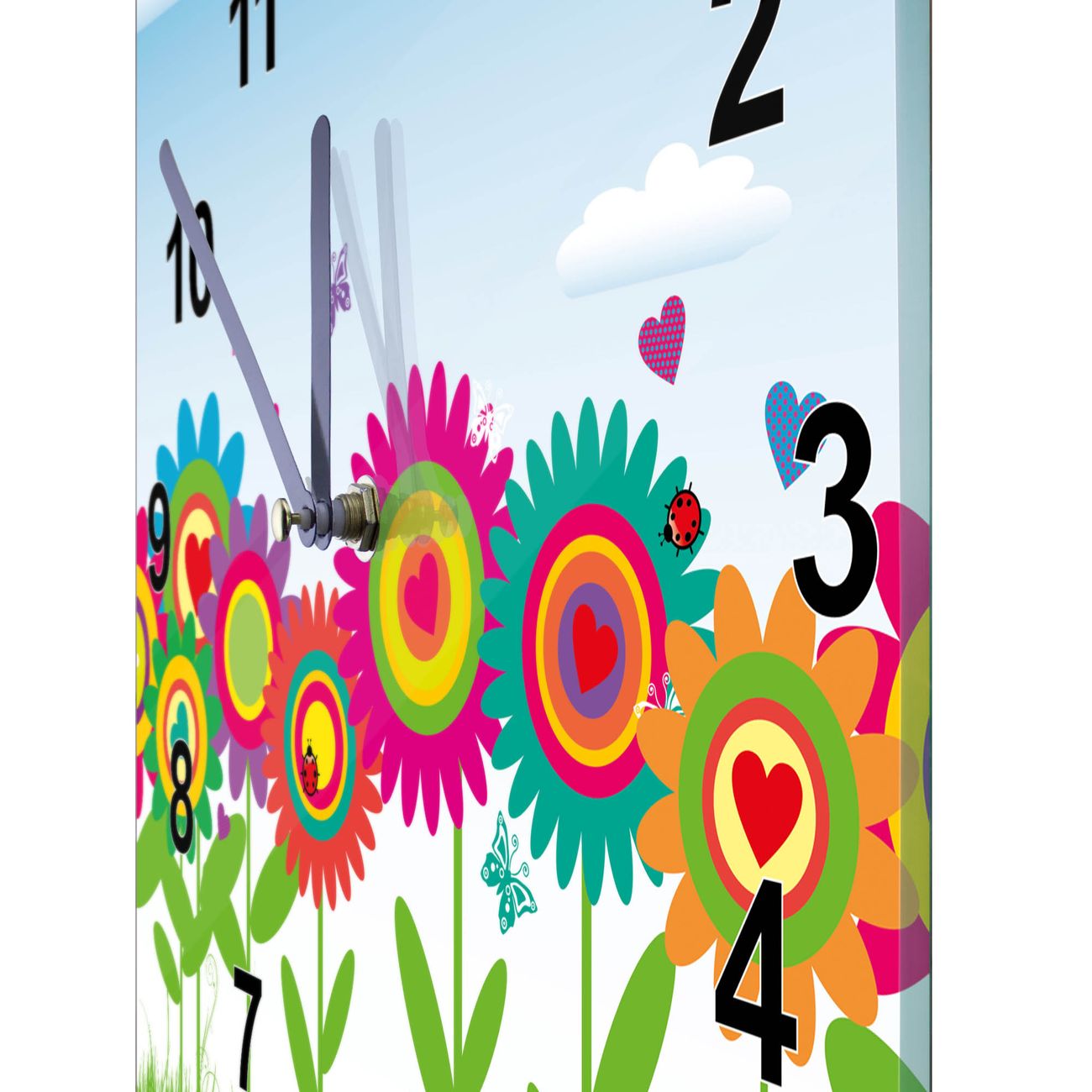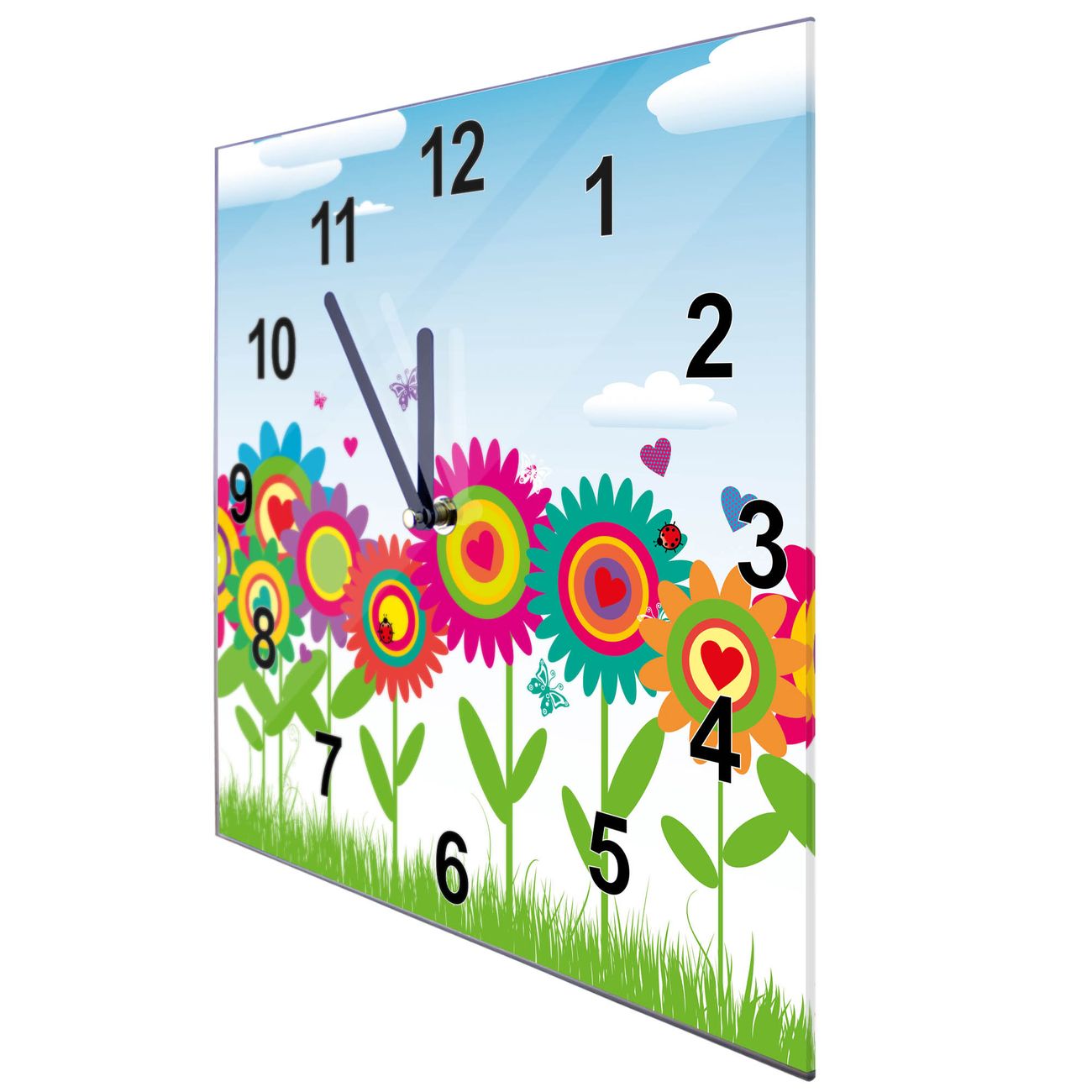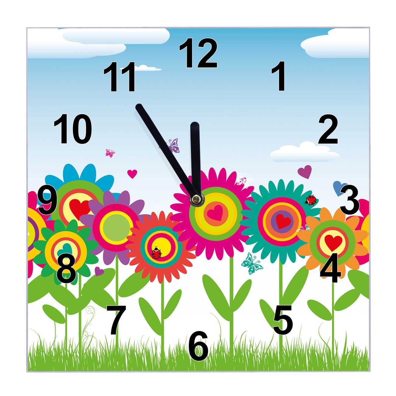 FUNKTION: Mit der banjado Wanduhr aus Glas mit dem Motiv Bunte Blumen behalten Sie die Zeit immer im Blick, stilsicher und zuverlässig erkennen Sie auf einen Blick was die Stunde geschlagen hat. DESIGN: Die schlichte Form der Uhr sowie das individuelle Motiv passen sich hervorragend jedem Wohnraumkonzept an, egal ob klassisch, nostalgisch oder modern. DETAILS: Die Glasuhr ist quadratisch, 30 x 30cm groß und verfügt über ein geräuscharmes Uhrwerk mit schwarzen Zeigern. Das Motiv Bunte Blumen befindet sich effektvoll hinter Glas. NUTZEN: Die banjado Glas Wanduhr verbindet Design und Funktion. Perfekt für Küche, Büro, Wohnzimmer oder Kinderzimmer, haben Sie die Zeit im Blick und eine schöne Wanddekoration. BANJADO: Wir fertigen alle Wanduhren auf Bestellung von Hand, erfüllen dabei auch gern Sonderwünsche. Wir wünschen viel Freude bei der Auswahl eines schönen Motivs. Herzlichst, banjado aus Sachsen