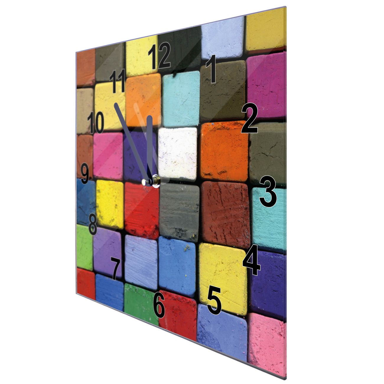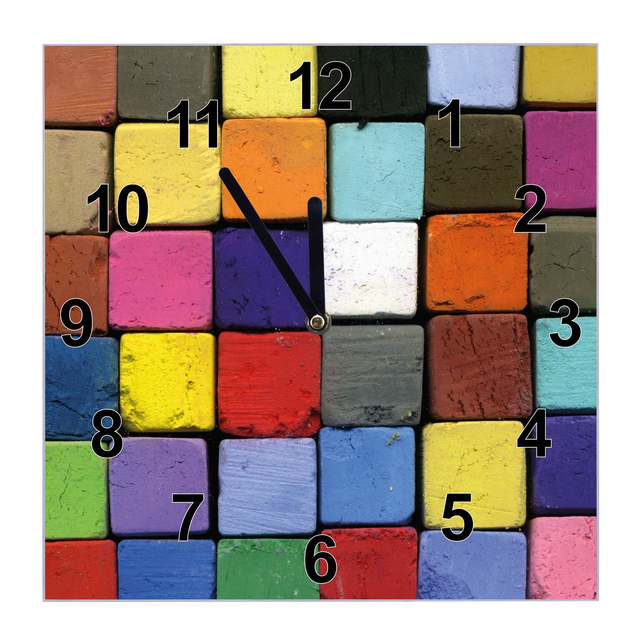 FUNKTION: Mit der banjado Wanduhr aus Glas mit dem Motiv Bunte Kreide behalten Sie die Zeit immer im Blick, stilsicher und zuverlässig erkennen Sie auf einen Blick was die Stunde geschlagen hat. DESIGN: Die schlichte Form der Uhr sowie das individuelle Motiv passen sich hervorragend jedem Wohnraumkonzept an, egal ob klassisch, nostalgisch oder modern. DETAILS: Die Glasuhr ist quadratisch, 30 x 30cm groß und verfügt über ein geräuscharmes Uhrwerk mit schwarzen Zeigern. Das Motiv Bunte Kreide befindet sich effektvoll hinter Glas. NUTZEN: Die banjado Glas Wanduhr verbindet Design und Funktion. Perfekt für Küche, Büro, Wohnzimmer oder Kinderzimmer, haben Sie die Zeit im Blick und eine schöne Wanddekoration. BANJADO: Wir fertigen alle Wanduhren auf Bestellung von Hand, erfüllen dabei auch gern Sonderwünsche. Wir wünschen viel Freude bei der Auswahl eines schönen Motivs. Herzlichst, banjado aus Sachsen