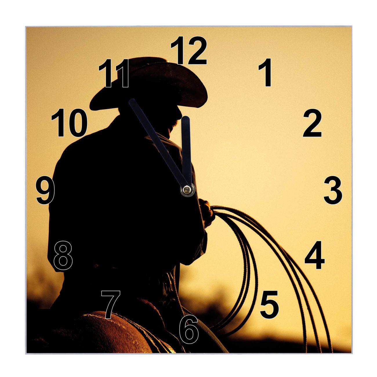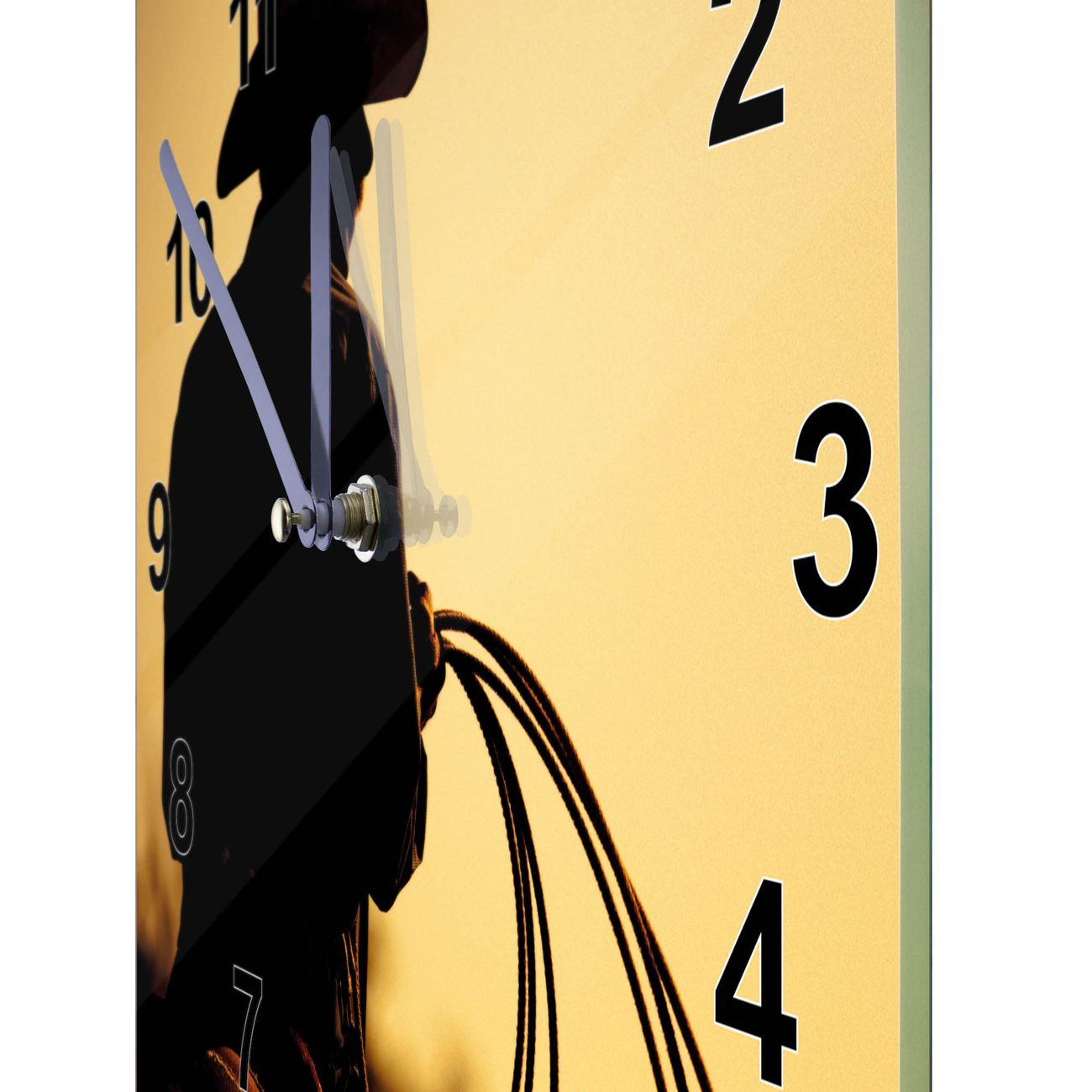 FUNKTION: Mit der banjado Wanduhr aus Glas mit dem Motiv Cowboy behalten Sie die Zeit immer im Blick, stilsicher und zuverlässig erkennen Sie auf einen Blick was die Stunde geschlagen hat. DESIGN: Die schlichte Form der Uhr sowie das individuelle Motiv passen sich hervorragend jedem Wohnraumkonzept an, egal ob klassisch, nostalgisch oder modern. DETAILS: Die Glasuhr ist quadratisch, 30 x 30cm groß und verfügt über ein geräuscharmes Uhrwerk mit schwarzen Zeigern. Das Motiv Cowboy befindet sich effektvoll hinter Glas. NUTZEN: Die banjado Glas Wanduhr verbindet Design und Funktion. Perfekt für Küche, Büro, Wohnzimmer oder Kinderzimmer, haben Sie die Zeit im Blick und eine schöne Wanddekoration. BANJADO: Wir fertigen alle Wanduhren auf Bestellung von Hand, erfüllen dabei auch gern Sonderwünsche. Wir wünschen viel Freude bei der Auswahl eines schönen Motivs. Herzlichst, banjado aus Sachsen