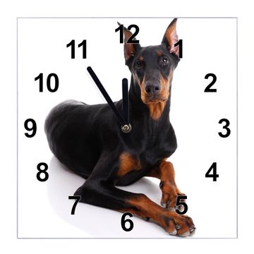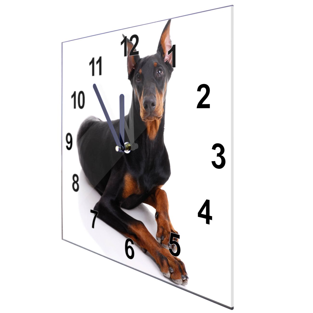FUNKTION: Mit der banjado Wanduhr aus Glas mit dem Motiv Dobermann behalten Sie die Zeit immer im Blick, stilsicher und zuverlässig erkennen Sie auf einen Blick was die Stunde geschlagen hat. DESIGN: Die schlichte Form der Uhr sowie das individuelle Motiv passen sich hervorragend jedem Wohnraumkonzept an, egal ob klassisch, nostalgisch oder modern. DETAILS: Die Glasuhr ist quadratisch, 30 x 30cm groß und verfügt über ein geräuscharmes Uhrwerk mit schwarzen Zeigern. Das Motiv Dobermann befindet sich effektvoll hinter Glas. NUTZEN: Die banjado Glas Wanduhr verbindet Design und Funktion. Perfekt für Küche, Büro, Wohnzimmer oder Kinderzimmer, haben Sie die Zeit im Blick und eine schöne Wanddekoration. BANJADO: Wir fertigen alle Wanduhren auf Bestellung von Hand, erfüllen dabei auch gern Sonderwünsche. Wir wünschen viel Freude bei der Auswahl eines schönen Motivs. Herzlichst, banjado aus Sachsen