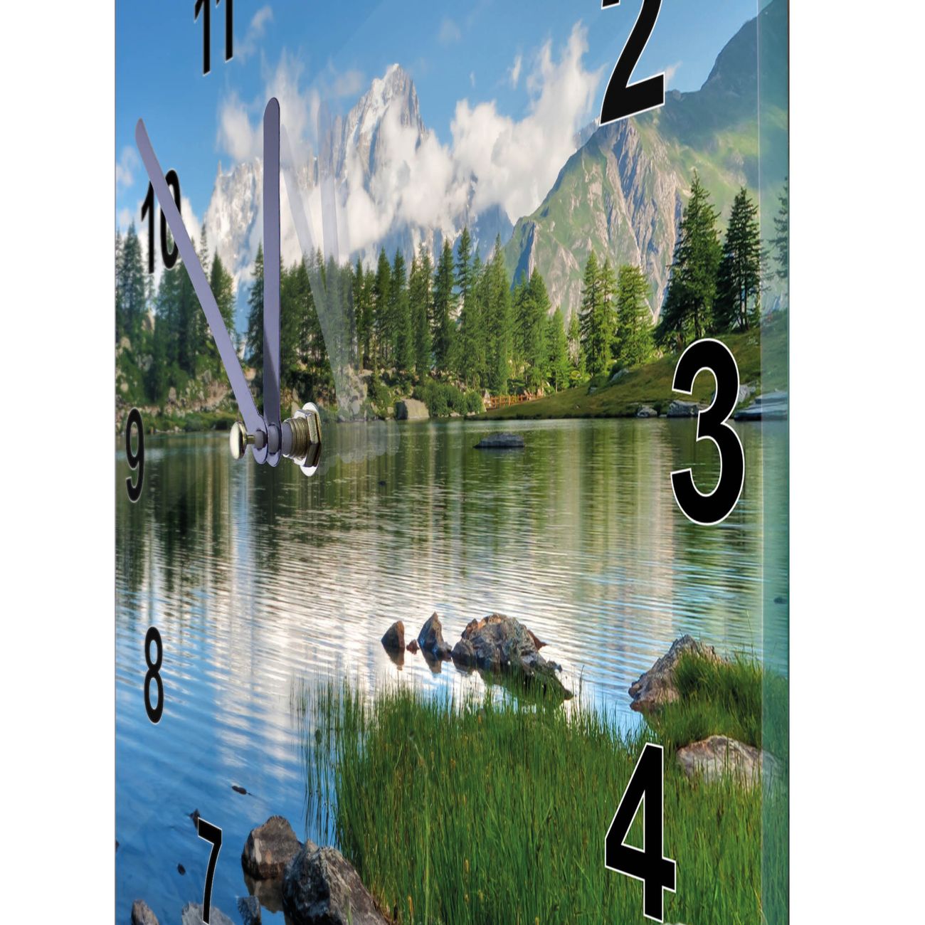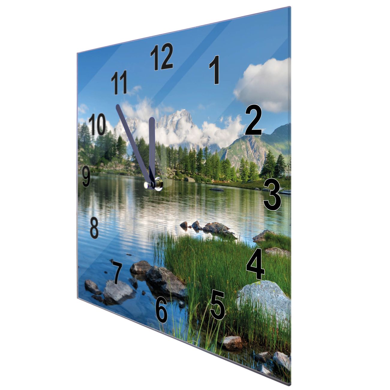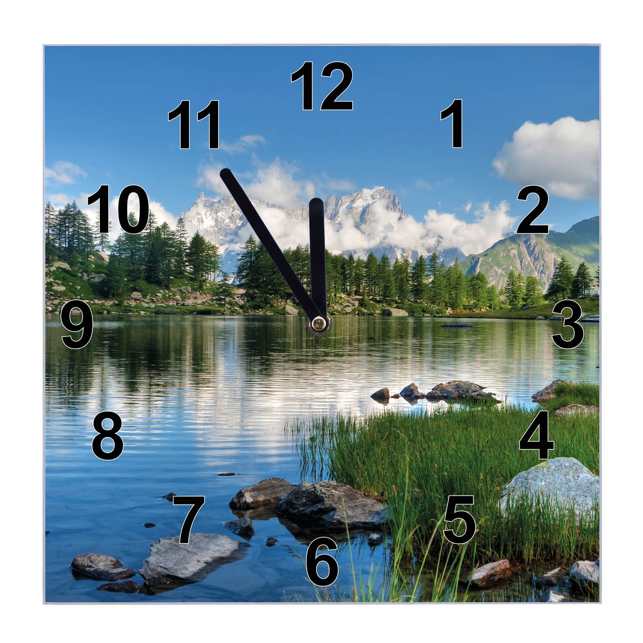 FUNKTION: Mit der banjado Wanduhr aus Glas mit dem Motiv Gebirgssee behalten Sie die Zeit immer im Blick, stilsicher und zuverlässig erkennen Sie auf einen Blick was die Stunde geschlagen hat. DESIGN: Die schlichte Form der Uhr sowie das individuelle Motiv passen sich hervorragend jedem Wohnraumkonzept an, egal ob klassisch, nostalgisch oder modern. DETAILS: Die Glasuhr ist quadratisch, 30 x 30cm groß und verfügt über ein geräuscharmes Uhrwerk mit schwarzen Zeigern. Das Motiv Gebirgssee befindet sich effektvoll hinter Glas. NUTZEN: Die banjado Glas Wanduhr verbindet Design und Funktion. Perfekt für Küche, Büro, Wohnzimmer oder Kinderzimmer, haben Sie die Zeit im Blick und eine schöne Wanddekoration. BANJADO: Wir fertigen alle Wanduhren auf Bestellung von Hand, erfüllen dabei auch gern Sonderwünsche. Wir wünschen viel Freude bei der Auswahl eines schönen Motivs. Herzlichst, banjado aus Sachsen