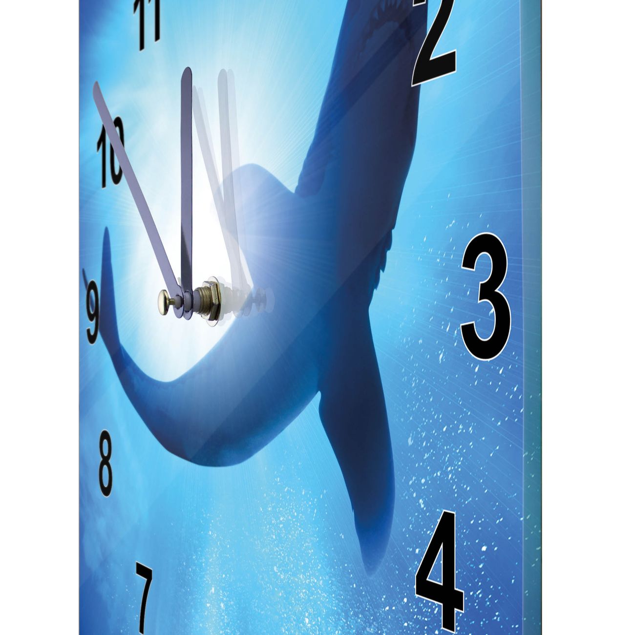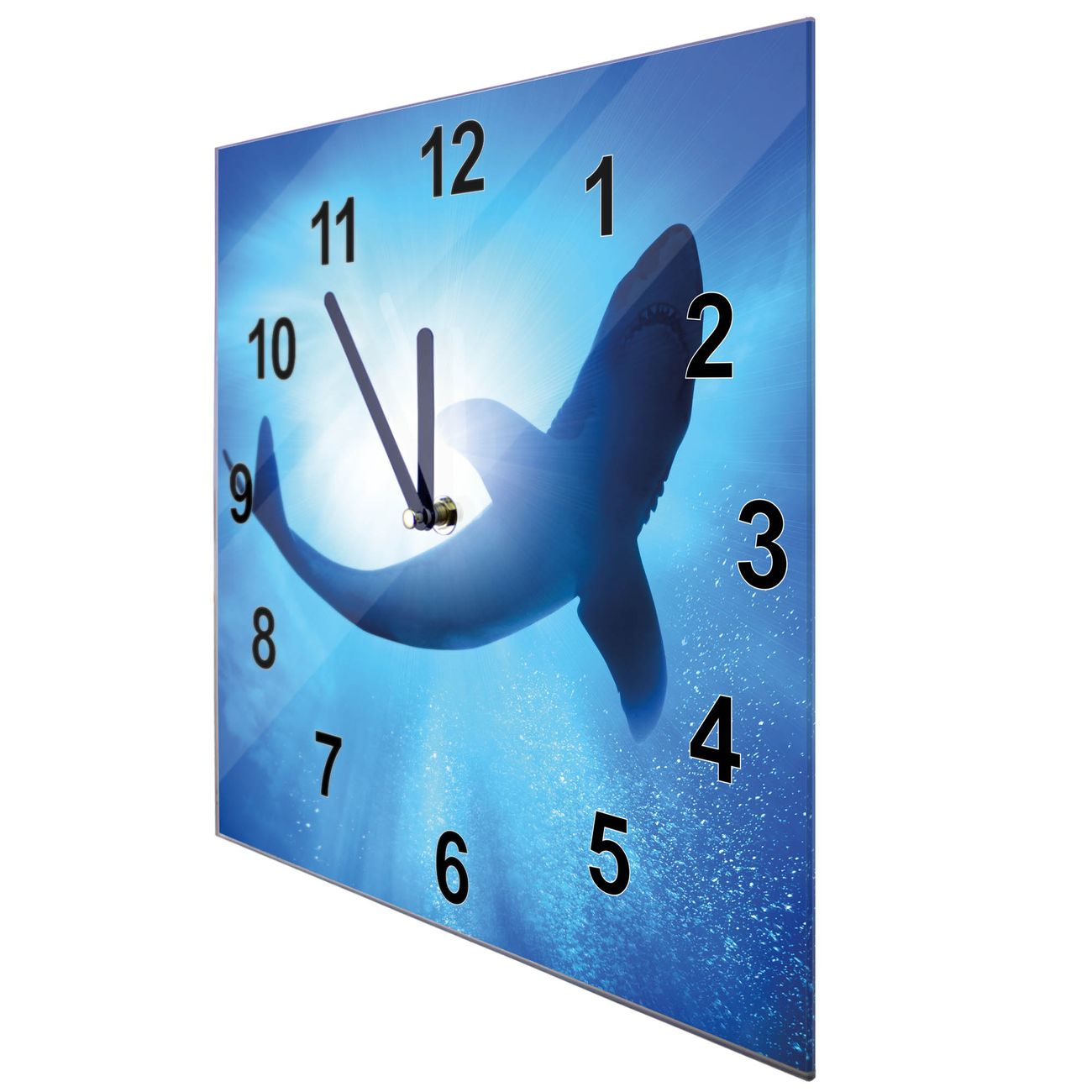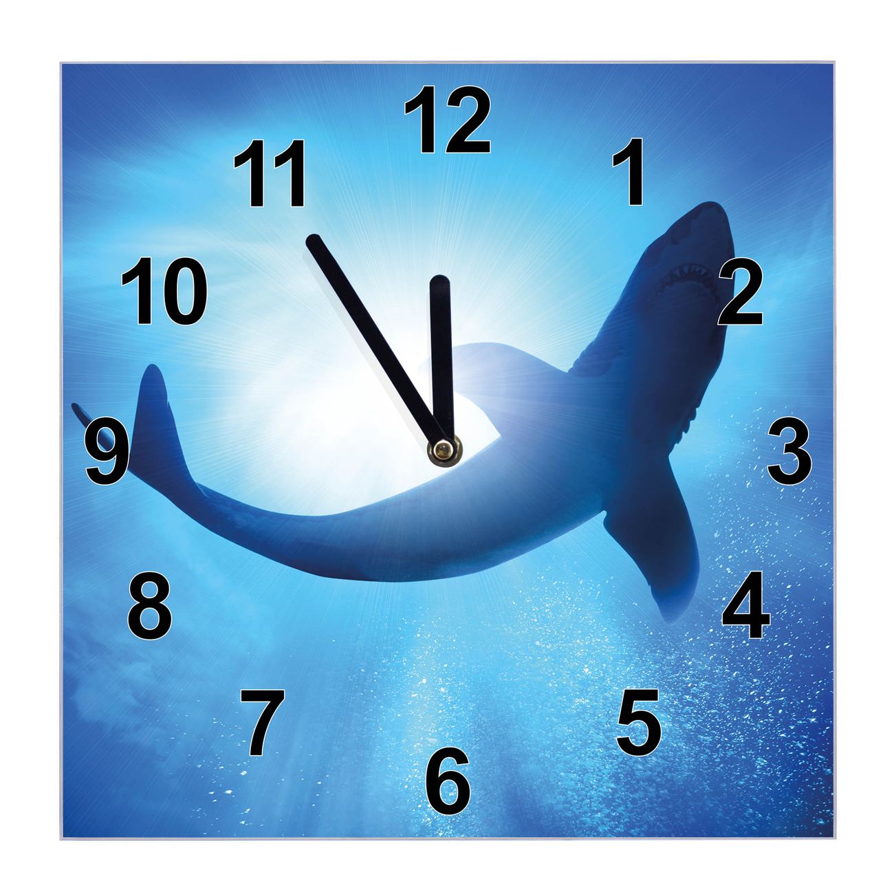 FUNKTION: Mit der banjado Wanduhr aus Glas mit dem Motiv Hai behalten Sie die Zeit immer im Blick, stilsicher und zuverlässig erkennen Sie auf einen Blick was die Stunde geschlagen hat. DESIGN: Die schlichte Form der Uhr sowie das individuelle Motiv passen sich hervorragend jedem Wohnraumkonzept an, egal ob klassisch, nostalgisch oder modern. DETAILS: Die Glasuhr ist quadratisch, 30 x 30cm groß und verfügt über ein geräuscharmes Uhrwerk mit schwarzen Zeigern. Das Motiv Hai befindet sich effektvoll hinter Glas. NUTZEN: Die banjado Glas Wanduhr verbindet Design und Funktion. Perfekt für Küche, Büro, Wohnzimmer oder Kinderzimmer, haben Sie die Zeit im Blick und eine schöne Wanddekoration. BANJADO: Wir fertigen alle Wanduhren auf Bestellung von Hand, erfüllen dabei auch gern Sonderwünsche. Wir wünschen viel Freude bei der Auswahl eines schönen Motivs. Herzlichst, banjado aus Sachsen