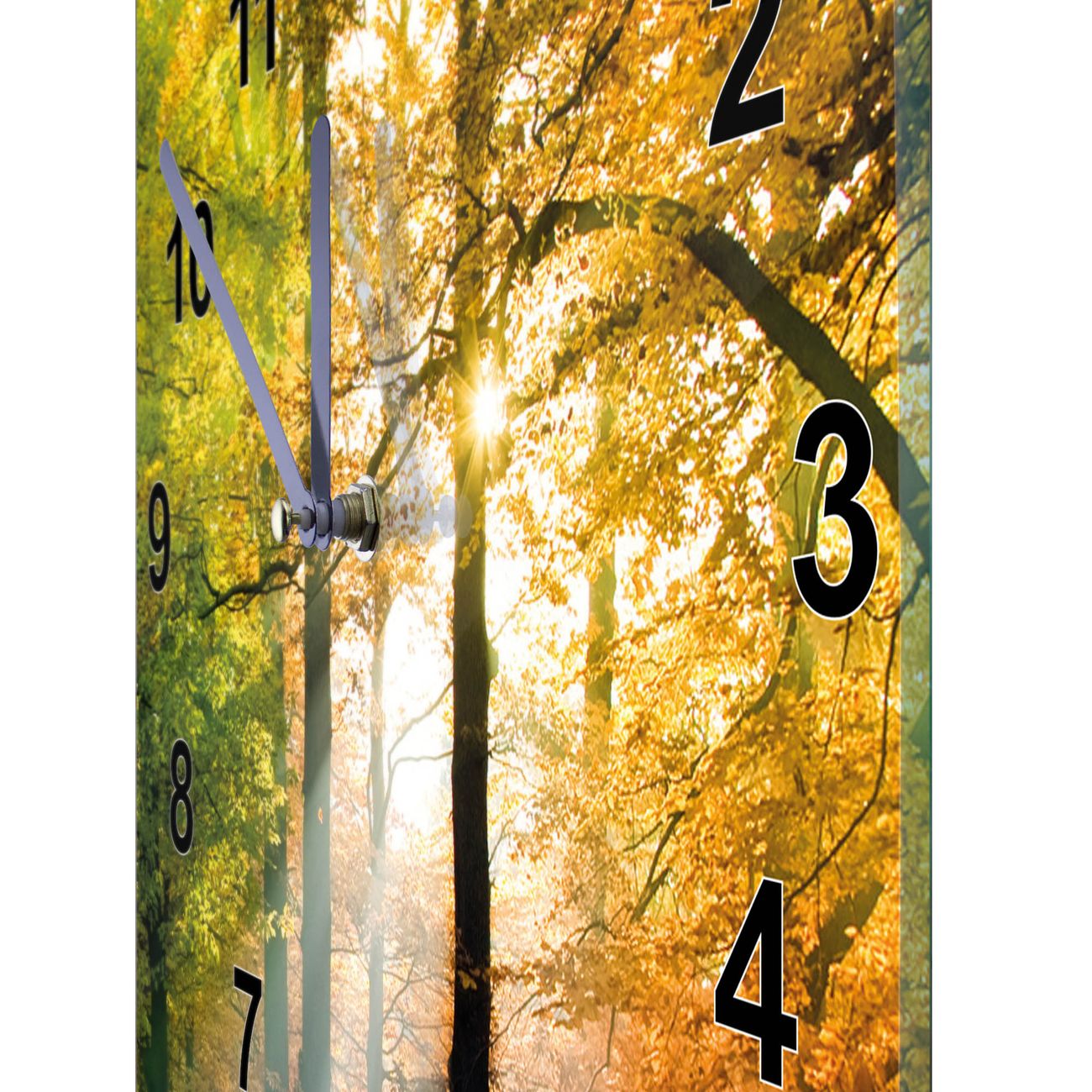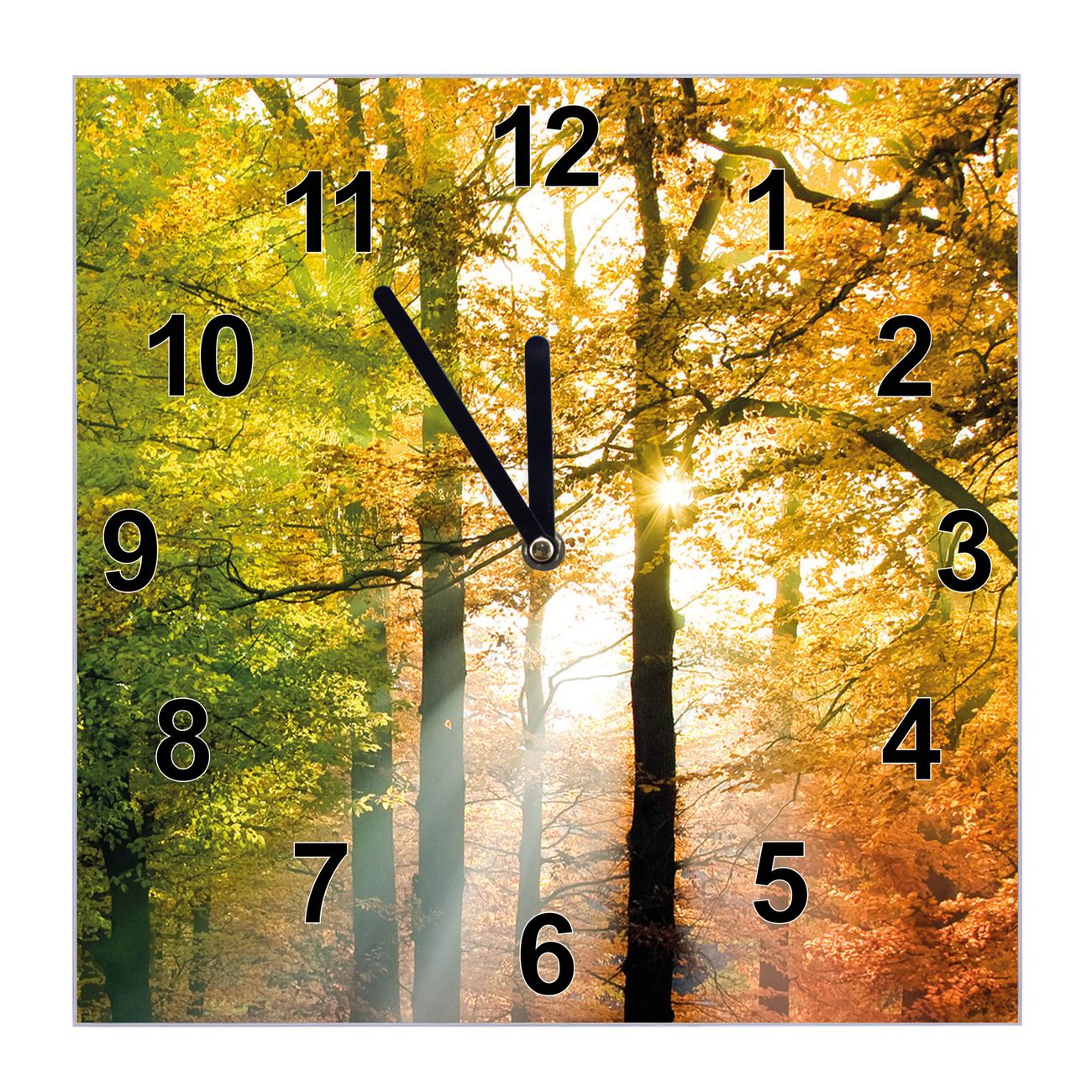 FUNKTION: Mit der banjado Wanduhr aus Glas mit dem Motiv Herbstwald behalten Sie die Zeit immer im Blick, stilsicher und zuverlässig erkennen Sie auf einen Blick was die Stunde geschlagen hat. DESIGN: Die schlichte Form der Uhr sowie das individuelle Motiv passen sich hervorragend jedem Wohnraumkonzept an, egal ob klassisch, nostalgisch oder modern. DETAILS: Die Glasuhr ist quadratisch, 30 x 30cm groß und verfügt über ein geräuscharmes Uhrwerk mit schwarzen Zeigern. Das Motiv Herbstwald befindet sich effektvoll hinter Glas. NUTZEN: Die banjado Glas Wanduhr verbindet Design und Funktion. Perfekt für Küche, Büro, Wohnzimmer oder Kinderzimmer, haben Sie die Zeit im Blick und eine schöne Wanddekoration. BANJADO: Wir fertigen alle Wanduhren auf Bestellung von Hand, erfüllen dabei auch gern Sonderwünsche. Wir wünschen viel Freude bei der Auswahl eines schönen Motivs. Herzlichst, banjado aus Sachsen