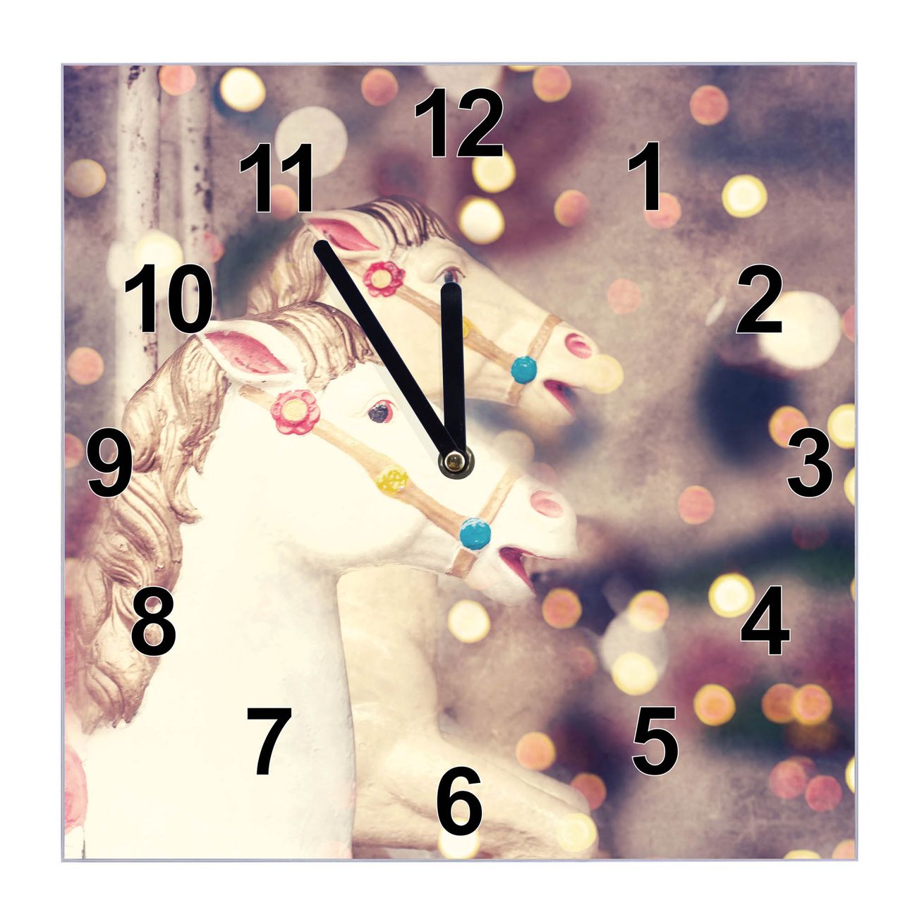 FUNKTION: Mit der banjado Wanduhr aus Glas mit dem Motiv Kinderkarussell behalten Sie die Zeit immer im Blick, stilsicher und zuverlässig erkennen Sie auf einen Blick was die Stunde geschlagen hat. DESIGN: Die schlichte Form der Uhr sowie das individuelle Motiv passen sich hervorragend jedem Wohnraumkonzept an, egal ob klassisch, nostalgisch oder modern. DETAILS: Die Glasuhr ist quadratisch, 30 x 30cm groß und verfügt über ein geräuscharmes Uhrwerk mit schwarzen Zeigern. Das Motiv Kinderkarussell befindet sich effektvoll hinter Glas. NUTZEN: Die banjado Glas Wanduhr verbindet Design und Funktion. Perfekt für Küche, Büro, Wohnzimmer oder Kinderzimmer, haben Sie die Zeit im Blick und eine schöne Wanddekoration. BANJADO: Wir fertigen alle Wanduhren auf Bestellung von Hand, erfüllen dabei auch gern Sonderwünsche. Wir wünschen viel Freude bei der Auswahl eines schönen Motivs. Herzlichst, banjado aus Sachsen