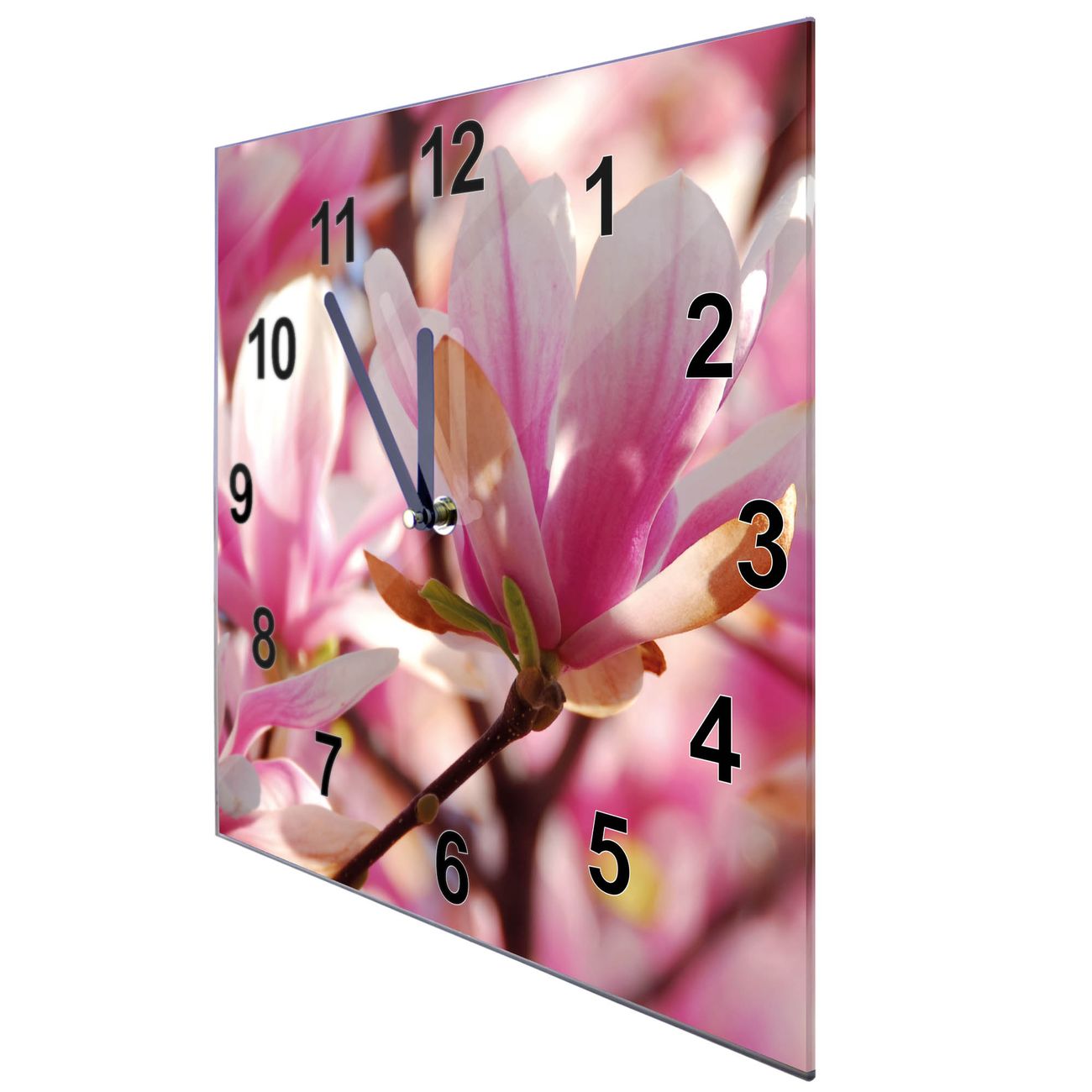 FUNKTION: Mit der banjado Wanduhr aus Glas mit dem Motiv Magnolia behalten Sie die Zeit immer im Blick, stilsicher und zuverlässig erkennen Sie auf einen Blick was die Stunde geschlagen hat. DESIGN: Die schlichte Form der Uhr sowie das individuelle Motiv passen sich hervorragend jedem Wohnraumkonzept an, egal ob klassisch, nostalgisch oder modern. DETAILS: Die Glasuhr ist quadratisch, 30 x 30cm groß und verfügt über ein geräuscharmes Uhrwerk mit schwarzen Zeigern. Das Motiv Magnolia befindet sich effektvoll hinter Glas. NUTZEN: Die banjado Glas Wanduhr verbindet Design und Funktion. Perfekt für Küche, Büro, Wohnzimmer oder Kinderzimmer, haben Sie die Zeit im Blick und eine schöne Wanddekoration. BANJADO: Wir fertigen alle Wanduhren auf Bestellung von Hand, erfüllen dabei auch gern Sonderwünsche. Wir wünschen viel Freude bei der Auswahl eines schönen Motivs. Herzlichst, banjado aus Sachsen