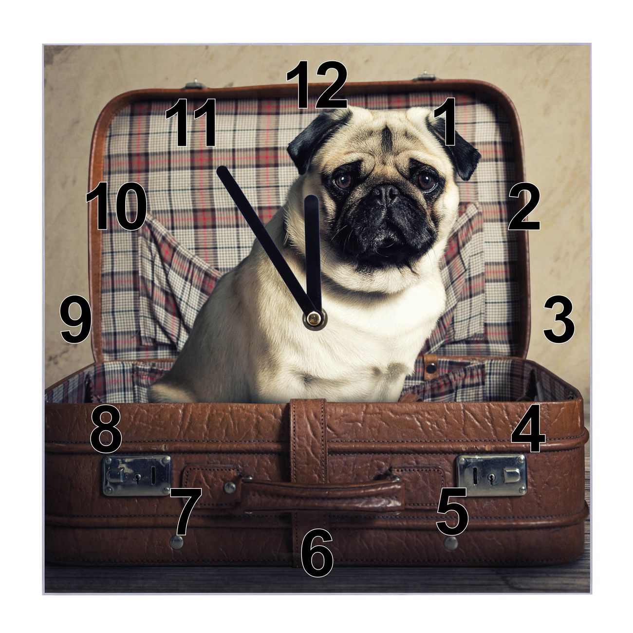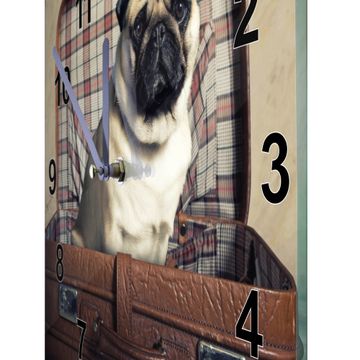 FUNKTION: Mit der banjado Wanduhr aus Glas mit dem Motiv Mops im Koffer behalten Sie die Zeit immer im Blick, stilsicher und zuverlässig erkennen Sie auf einen Blick was die Stunde geschlagen hat. DESIGN: Die schlichte Form der Uhr sowie das individuelle Motiv passen sich hervorragend jedem Wohnraumkonzept an, egal ob klassisch, nostalgisch oder modern. DETAILS: Die Glasuhr ist quadratisch, 30 x 30cm groß und verfügt über ein geräuscharmes Uhrwerk mit schwarzen Zeigern. Das Motiv Mops im Koffer befindet sich effektvoll hinter Glas. NUTZEN: Die banjado Glas Wanduhr verbindet Design und Funktion. Perfekt für Küche, Büro, Wohnzimmer oder Kinderzimmer, haben Sie die Zeit im Blick und eine schöne Wanddekoration. BANJADO: Wir fertigen alle Wanduhren auf Bestellung von Hand, erfüllen dabei auch gern Sonderwünsche. Wir wünschen viel Freude bei der Auswahl eines schönen Motivs. Herzlichst, banjado aus Sachsen