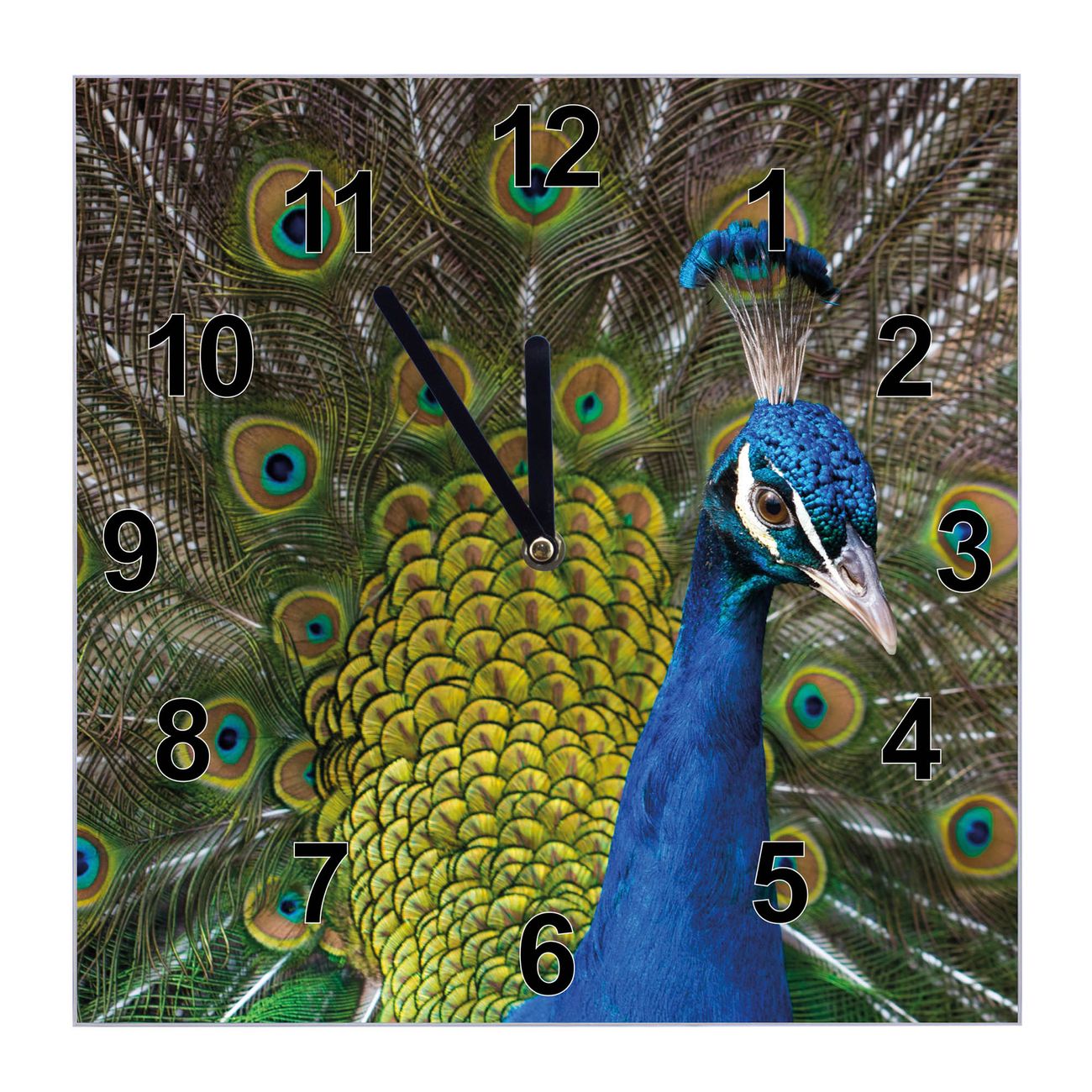 Glasuhr quadratisch Motiv Pfau