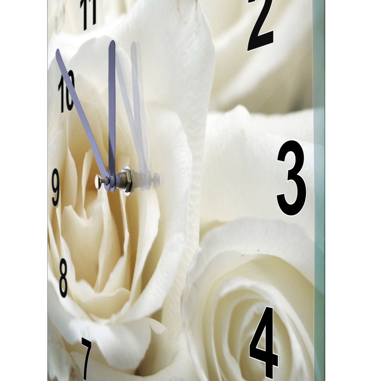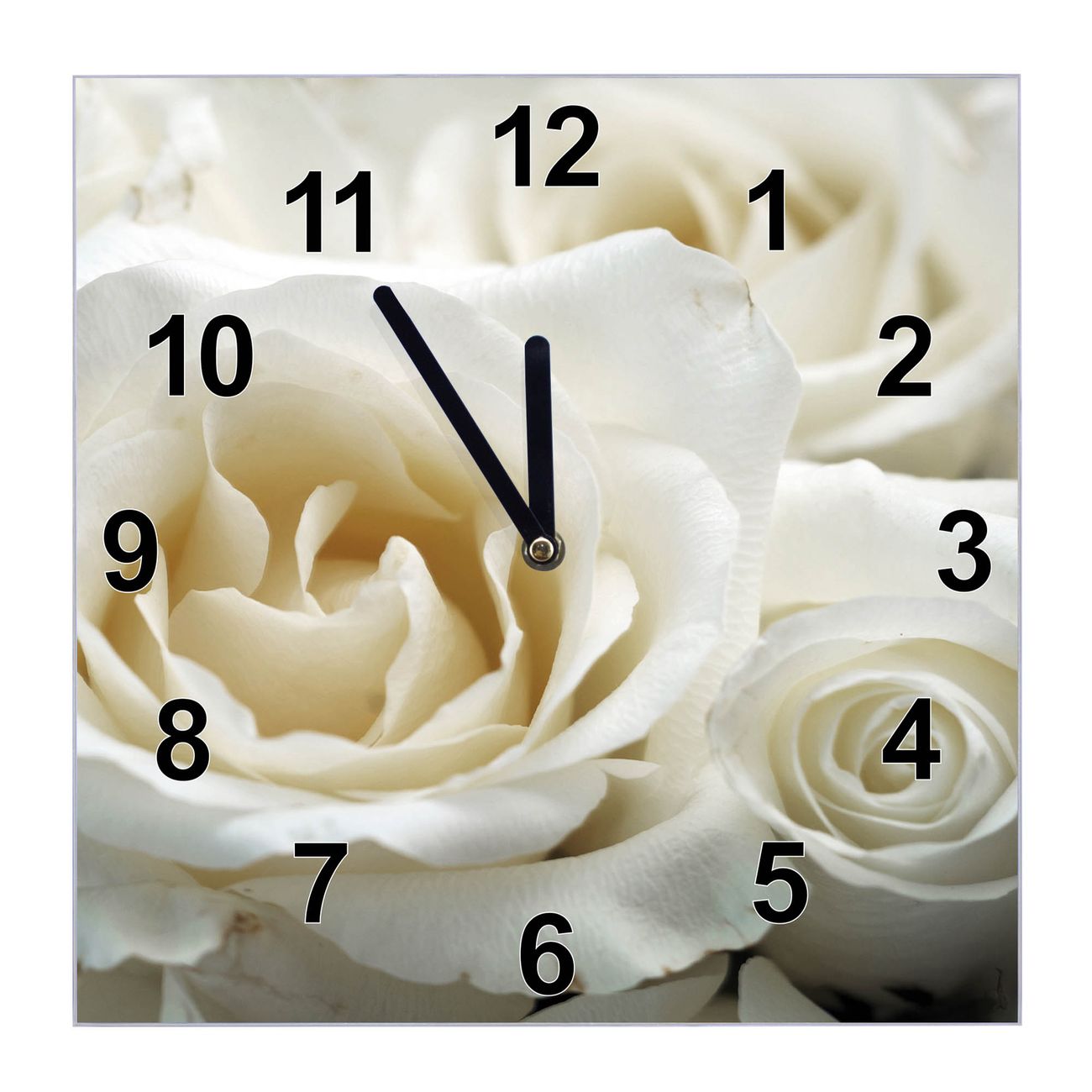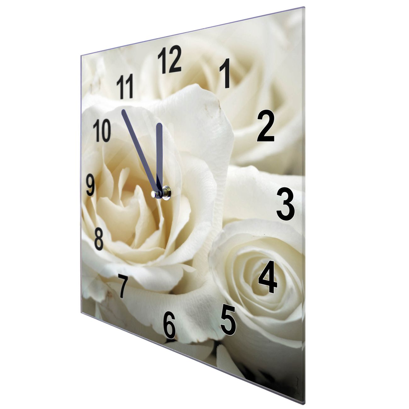 FUNKTION: Mit der banjado Wanduhr aus Glas mit dem Motiv White Roses behalten Sie die Zeit immer im Blick, stilsicher und zuverlässig erkennen Sie auf einen Blick was die Stunde geschlagen hat. DESIGN: Die schlichte Form der Uhr sowie das individuelle Motiv passen sich hervorragend jedem Wohnraumkonzept an, egal ob klassisch, nostalgisch oder modern. DETAILS: Die Glasuhr ist quadratisch, 30 x 30cm groß und verfügt über ein geräuscharmes Uhrwerk mit schwarzen Zeigern. Das Motiv White Roses befindet sich effektvoll hinter Glas. NUTZEN: Die banjado Glas Wanduhr verbindet Design und Funktion. Perfekt für Küche, Büro, Wohnzimmer oder Kinderzimmer, haben Sie die Zeit im Blick und eine schöne Wanddekoration. BANJADO: Wir fertigen alle Wanduhren auf Bestellung von Hand, erfüllen dabei auch gern Sonderwünsche. Wir wünschen viel Freude bei der Auswahl eines schönen Motivs. Herzlichst, banjado aus Sachsen