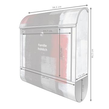 DESIGN: Der Postkasten mit Motiv Motiv Abstrakt Rot hat ein sehr ansprechendes und ausgefallenes Design, damit entlocken Sie Ihren Nachbarn und dem Postboten ein Lächeln. Heben Sie Sich von der tristen grauen Masse ab, ohne auf Funktionalität zu verzichten. DETAILS: Der Postkasten besteht aus pulverbeschichtetem Stahl. Er ist 38x46x12,5cm groß. Das Motiv besteht aus einer wetter- und UV-resistenten Folie, die mit einem Schutzlaminat überzogen ist, sodass der Briefkasten zusätzlich vor Kratzern geschützt ist. Der Briefkasten wird mit Montagematerial, zusätzlich zwei Schlüssel sowie einer Bohrschablone geliefert. NUTZEN: Sie können diesen Briefkasten sowohl als Wandbriefkasten montieren oder einen passenden Ständer kaufen und als Standbriefkasten einbetonieren. Die Größe bietet genügend Platz für Sendungen aller Art, der Einwurf fasst auch größere A4 Sendungen. BANJADO: Ihr Briefkasten wird in Sachsen in einer kleinen Manufaktur von Hand veredelt. Die Motivfolie ist lösungsmittelfrei und schutzlaminiert für einen langen Halt. Wir legen großen Wert auf die Verbindung von Funktionalität und Design. Sie erhalten Handarbeit aus Sachsen.