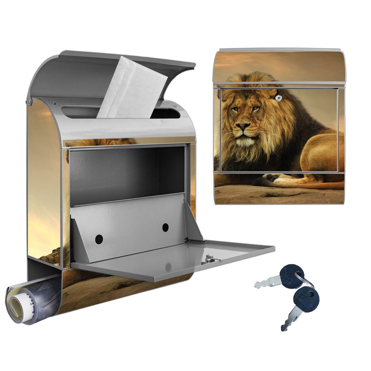 DESIGN: Der Postkasten mit Motiv Motiv Adrian hat ein sehr ansprechendes und ausgefallenes Design, damit entlocken Sie Ihren Nachbarn und dem Postboten ein Lächeln. Heben Sie Sich von der tristen grauen Masse ab, ohne auf Funktionalität zu verzichten. DETAILS: Der Postkasten besteht aus pulverbeschichtetem Stahl. Er ist 38x46x12,5cm groß. Das Motiv besteht aus einer wetter- und UV-resistenten Folie, die mit einem Schutzlaminat überzogen ist, sodass der Briefkasten zusätzlich vor Kratzern geschützt ist. Der Briefkasten wird mit Montagematerial, zusätzlich zwei Schlüssel sowie einer Bohrschablone geliefert. NUTZEN: Sie können diesen Briefkasten sowohl als Wandbriefkasten montieren oder einen passenden Ständer kaufen und als Standbriefkasten einbetonieren. Die Größe bietet genügend Platz für Sendungen aller Art, der Einwurf fasst auch größere A4 Sendungen. BANJADO: Ihr Briefkasten wird in Sachsen in einer kleinen Manufaktur von Hand veredelt. Die Motivfolie ist lösungsmittelfrei und schutzlaminiert für einen langen Halt. Wir legen großen Wert auf die Verbindung von Funktionalität und Design. Sie erhalten Handarbeit aus Sachsen.