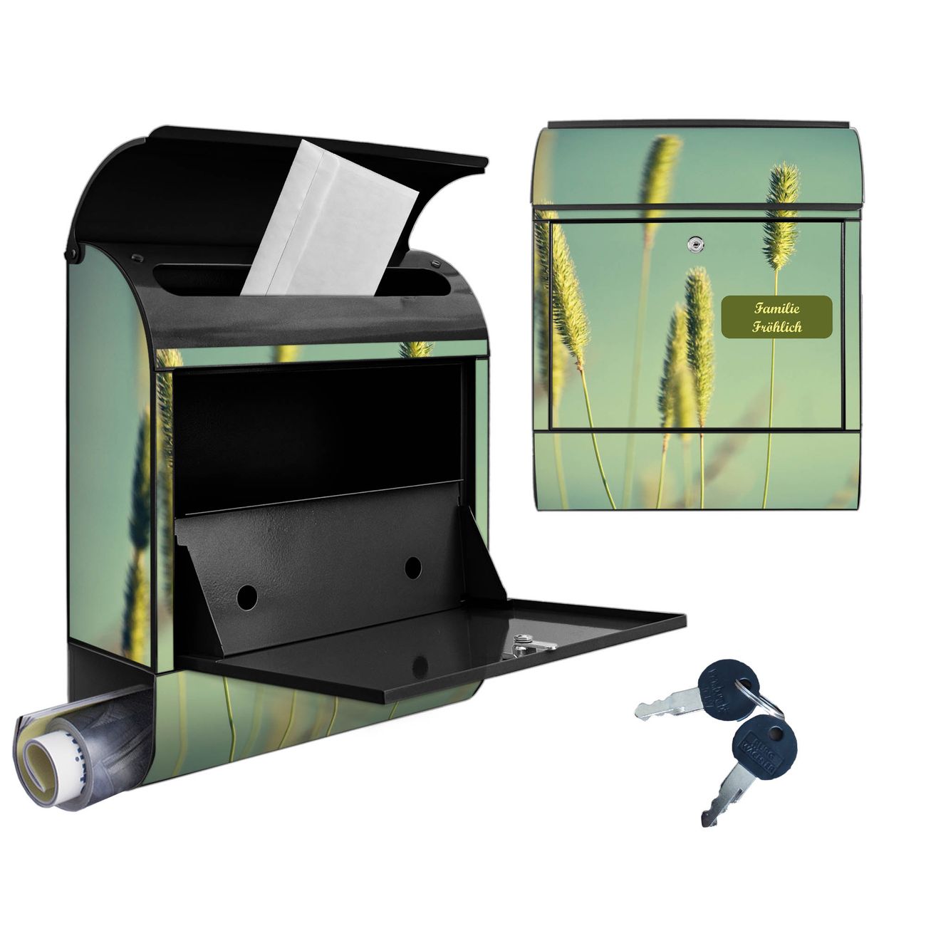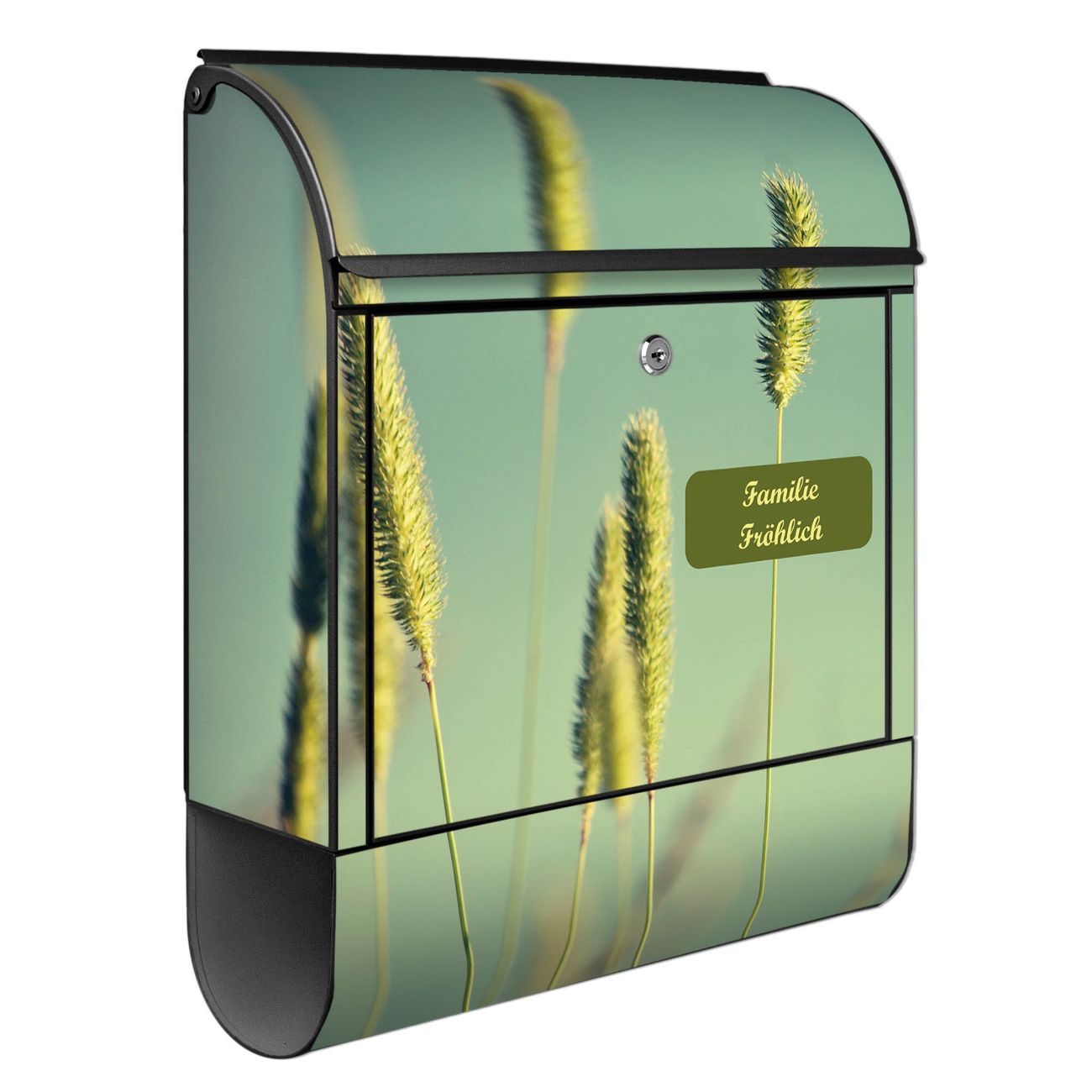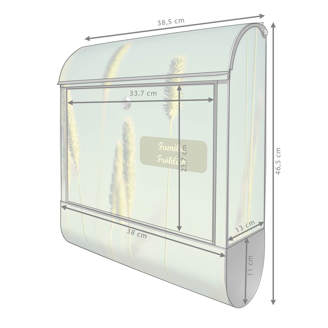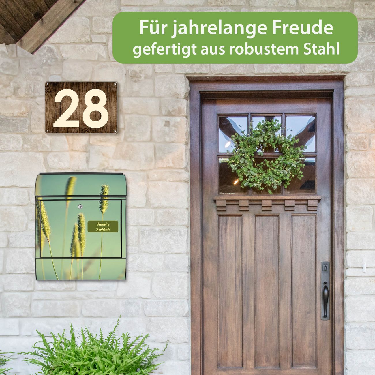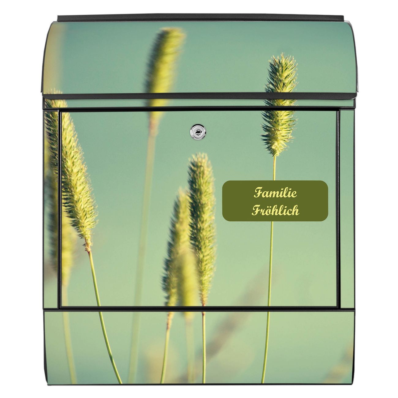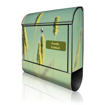 DESIGN: Der Postkasten mit Motiv Motiv Ähren hat ein sehr ansprechendes und ausgefallenes Design, damit entlocken Sie Ihren Nachbarn und dem Postboten ein Lächeln. Heben Sie Sich von der tristen grauen Masse ab, ohne auf Funktionalität zu verzichten. DETAILS: Der Postkasten besteht aus pulverbeschichtetem Stahl. Er ist 38x46x12,5cm groß. Das Motiv besteht aus einer wetter- und UV-resistenten Folie, die mit einem Schutzlaminat überzogen ist, sodass der Briefkasten zusätzlich vor Kratzern geschützt ist. Der Briefkasten wird mit Montagematerial, zusätzlich zwei Schlüssel sowie einer Bohrschablone geliefert. NUTZEN: Sie können diesen Briefkasten sowohl als Wandbriefkasten montieren oder einen passenden Ständer kaufen und als Standbriefkasten einbetonieren. Die Größe bietet genügend Platz für Sendungen aller Art, der Einwurf fasst auch größere A4 Sendungen. BANJADO: Ihr Briefkasten wird in Sachsen in einer kleinen Manufaktur von Hand veredelt. Die Motivfolie ist lösungsmittelfrei und schutzlaminiert für einen langen Halt. Wir legen großen Wert auf die Verbindung von Funktionalität und Design. Sie erhalten Handarbeit aus Sachsen.