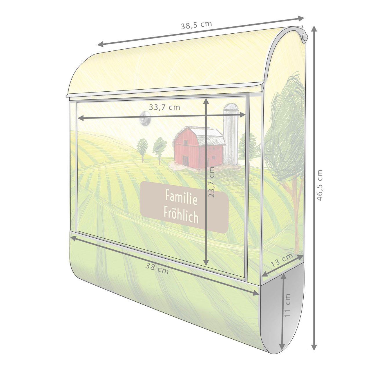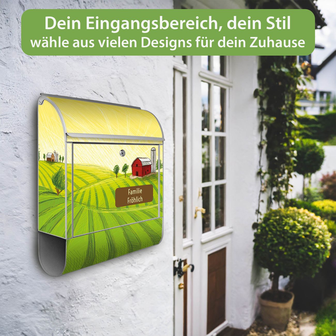 DESIGN: Der Postkasten mit Motiv Motiv Auf dem Land hat ein sehr ansprechendes und ausgefallenes Design, damit entlocken Sie Ihren Nachbarn und dem Postboten ein Lächeln. Heben Sie Sich von der tristen grauen Masse ab, ohne auf Funktionalität zu verzichten. DETAILS: Der Postkasten besteht aus pulverbeschichtetem Stahl. Er ist 38x46x12,5cm groß. Das Motiv besteht aus einer wetter- und UV-resistenten Folie, die mit einem Schutzlaminat überzogen ist, sodass der Briefkasten zusätzlich vor Kratzern geschützt ist. Der Briefkasten wird mit Montagematerial, zusätzlich zwei Schlüssel sowie einer Bohrschablone geliefert. NUTZEN: Sie können diesen Briefkasten sowohl als Wandbriefkasten montieren oder einen passenden Ständer kaufen und als Standbriefkasten einbetonieren. Die Größe bietet genügend Platz für Sendungen aller Art, der Einwurf fasst auch größere A4 Sendungen. BANJADO: Ihr Briefkasten wird in Sachsen in einer kleinen Manufaktur von Hand veredelt. Die Motivfolie ist lösungsmittelfrei und schutzlaminiert für einen langen Halt. Wir legen großen Wert auf die Verbindung von Funktionalität und Design. Sie erhalten Handarbeit aus Sachsen.
