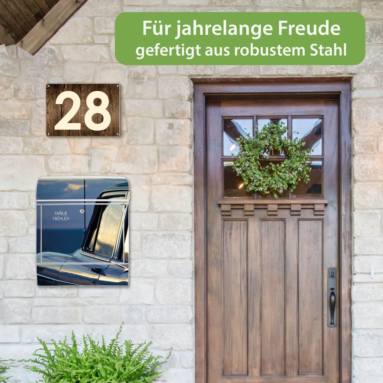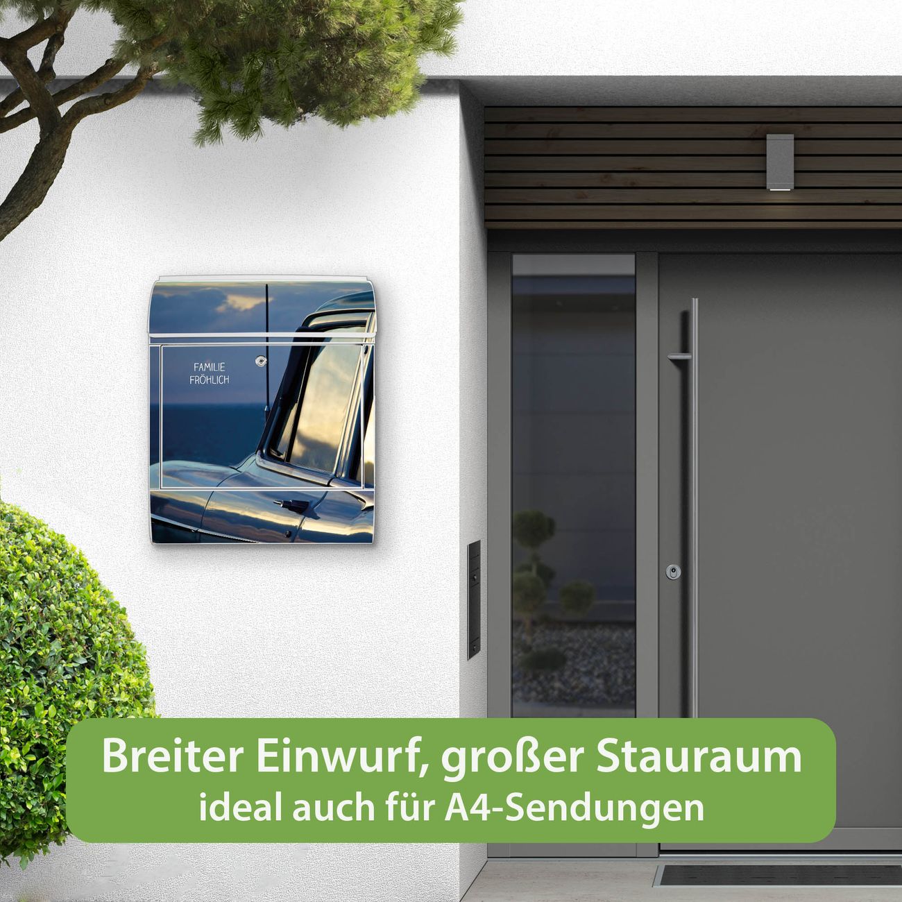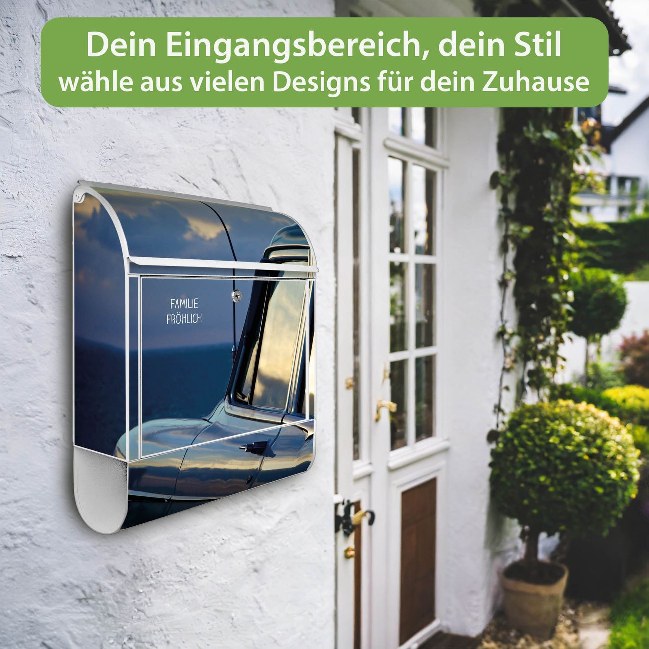 DESIGN: Der Postkasten mit Motiv Motiv Auto am Strand hat ein sehr ansprechendes und ausgefallenes Design, damit entlocken Sie Ihren Nachbarn und dem Postboten ein Lächeln. Heben Sie Sich von der tristen grauen Masse ab, ohne auf Funktionalität zu verzichten. DETAILS: Der Postkasten besteht aus pulverbeschichtetem Stahl. Er ist 38x46x12,5cm groß. Das Motiv besteht aus einer wetter- und UV-resistenten Folie, die mit einem Schutzlaminat überzogen ist, sodass der Briefkasten zusätzlich vor Kratzern geschützt ist. Der Briefkasten wird mit Montagematerial, zusätzlich zwei Schlüssel sowie einer Bohrschablone geliefert. NUTZEN: Sie können diesen Briefkasten sowohl als Wandbriefkasten montieren oder einen passenden Ständer kaufen und als Standbriefkasten einbetonieren. Die Größe bietet genügend Platz für Sendungen aller Art, der Einwurf fasst auch größere A4 Sendungen. BANJADO: Ihr Briefkasten wird in Sachsen in einer kleinen Manufaktur von Hand veredelt. Die Motivfolie ist lösungsmittelfrei und schutzlaminiert für einen langen Halt. Wir legen großen Wert auf die Verbindung von Funktionalität und Design. Sie erhalten Handarbeit aus Sachsen.