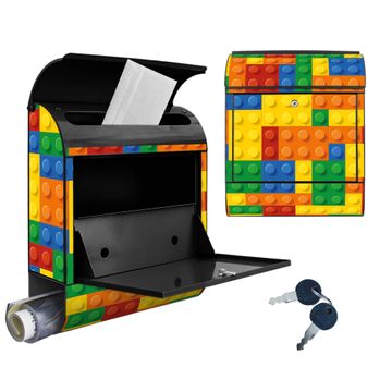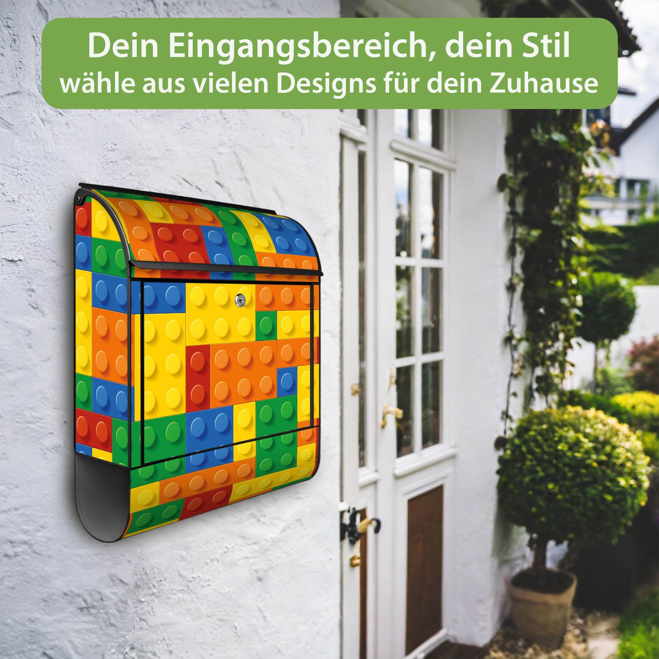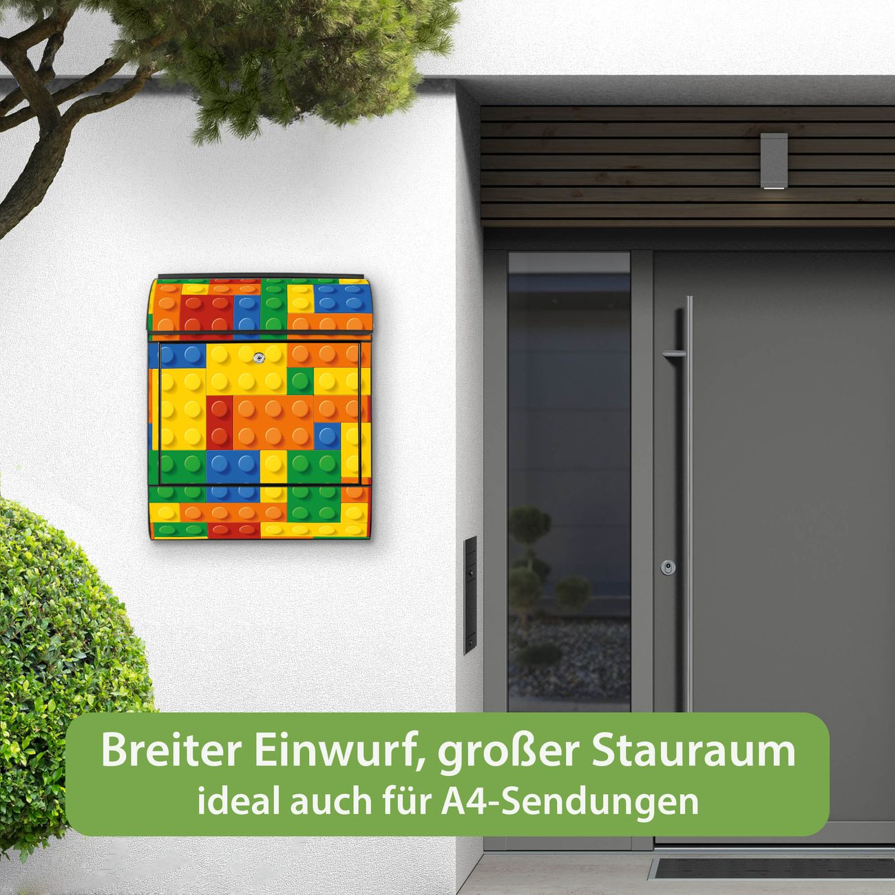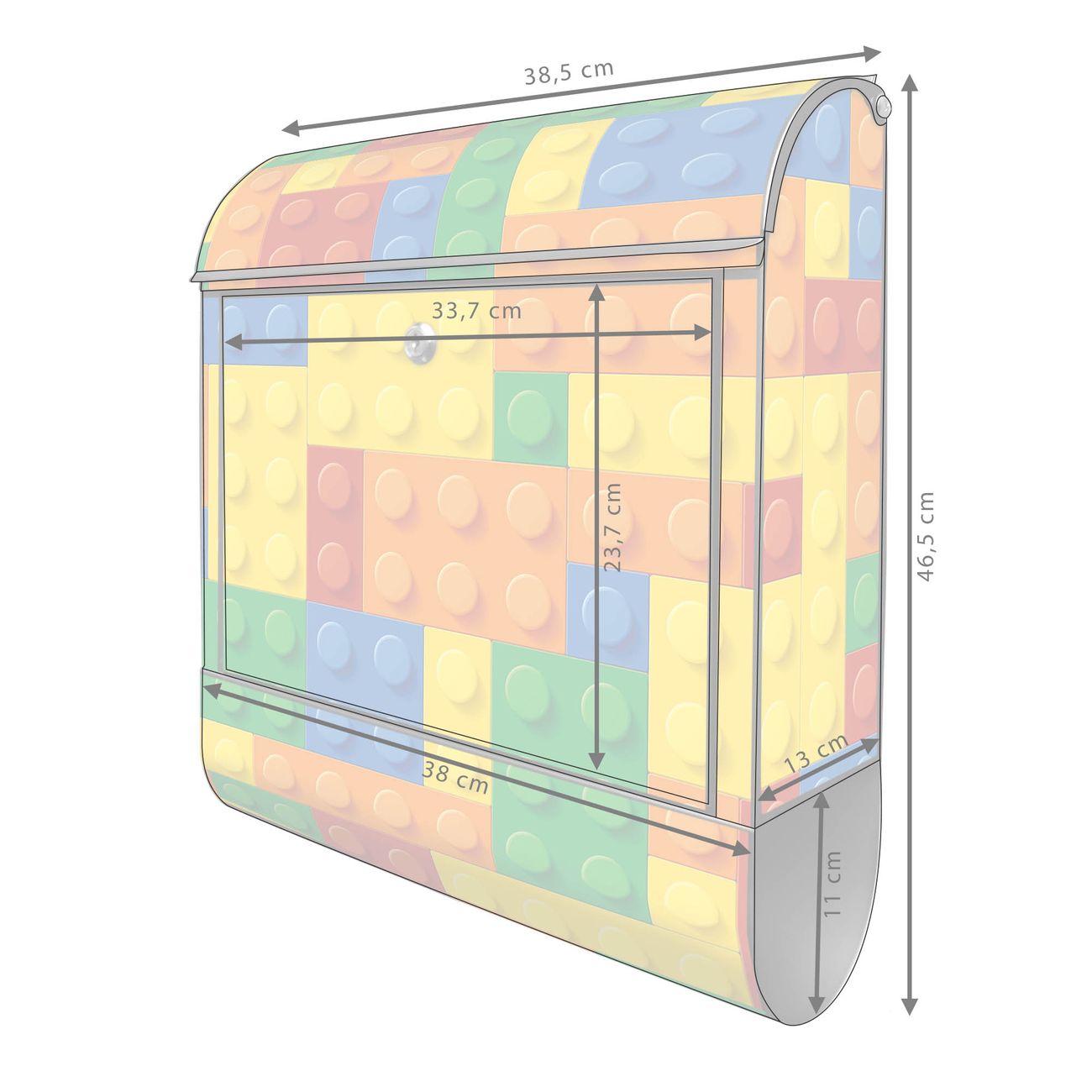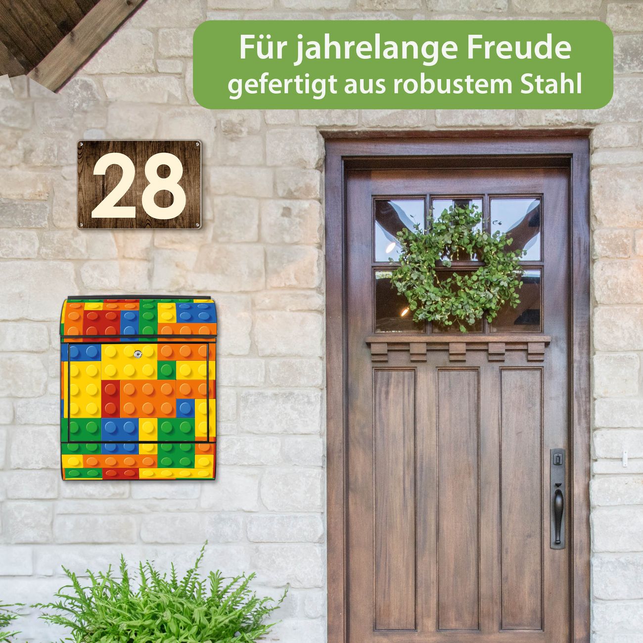 DESIGN: Der Postkasten mit Motiv Motiv Bausteine hat ein sehr ansprechendes und ausgefallenes Design, damit entlocken Sie Ihren Nachbarn und dem Postboten ein Lächeln. Heben Sie Sich von der tristen grauen Masse ab, ohne auf Funktionalität zu verzichten. DETAILS: Der Postkasten besteht aus pulverbeschichtetem Stahl. Er ist 38x46x12,5cm groß. Das Motiv besteht aus einer wetter- und UV-resistenten Folie, die mit einem Schutzlaminat überzogen ist, sodass der Briefkasten zusätzlich vor Kratzern geschützt ist. Der Briefkasten wird mit Montagematerial, zusätzlich zwei Schlüssel sowie einer Bohrschablone geliefert. NUTZEN: Sie können diesen Briefkasten sowohl als Wandbriefkasten montieren oder einen passenden Ständer kaufen und als Standbriefkasten einbetonieren. Die Größe bietet genügend Platz für Sendungen aller Art, der Einwurf fasst auch größere A4 Sendungen. BANJADO: Ihr Briefkasten wird in Sachsen in einer kleinen Manufaktur von Hand veredelt. Die Motivfolie ist lösungsmittelfrei und schutzlaminiert für einen langen Halt. Wir legen großen Wert auf die Verbindung von Funktionalität und Design. Sie erhalten Handarbeit aus Sachsen.