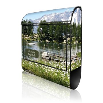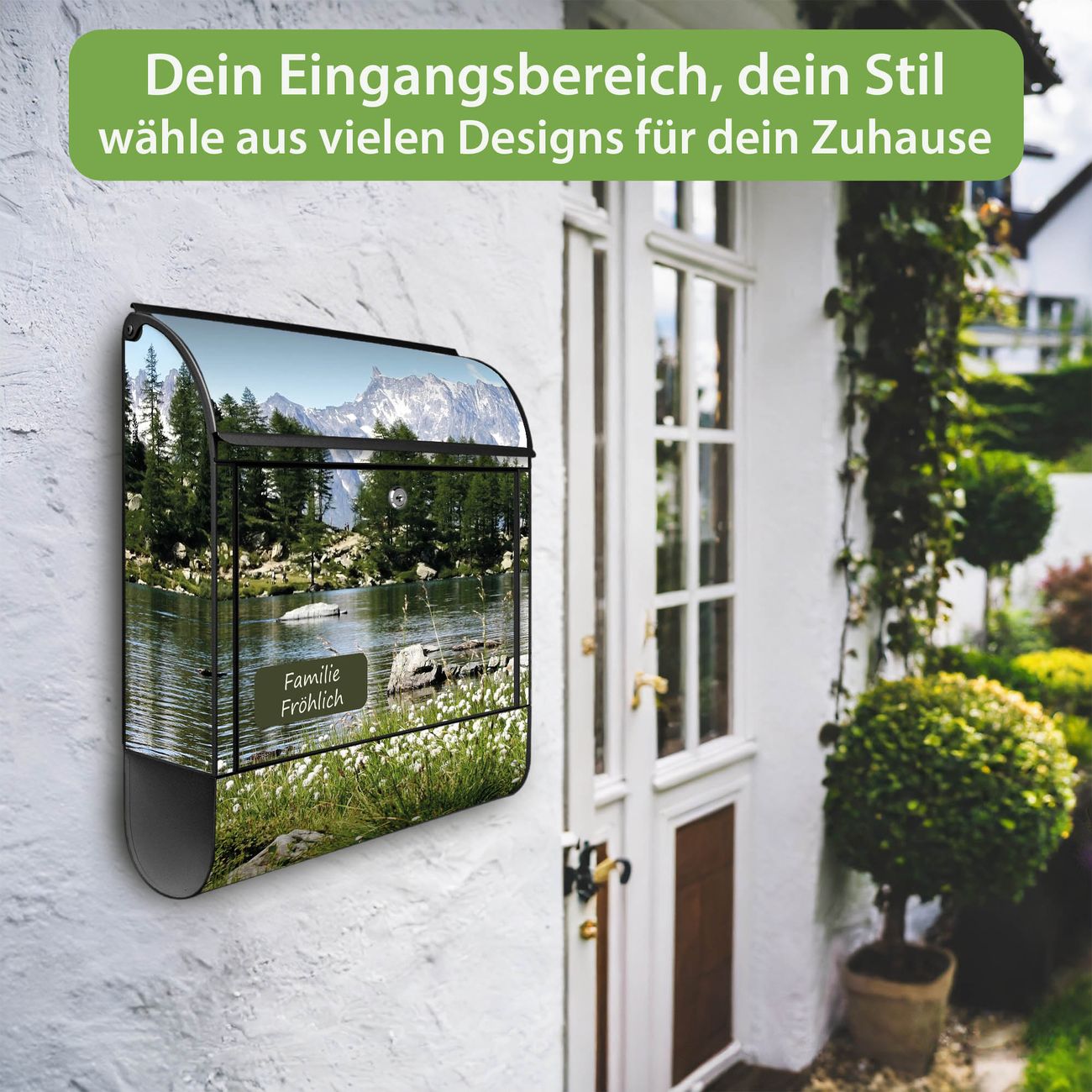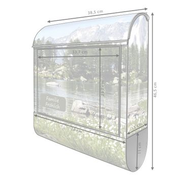 DESIGN: Der Postkasten mit Motiv Motiv Bergidylle hat ein sehr ansprechendes und ausgefallenes Design, damit entlocken Sie Ihren Nachbarn und dem Postboten ein Lächeln. Heben Sie Sich von der tristen grauen Masse ab, ohne auf Funktionalität zu verzichten. DETAILS: Der Postkasten besteht aus pulverbeschichtetem Stahl. Er ist 38x46x12,5cm groß. Das Motiv besteht aus einer wetter- und UV-resistenten Folie, die mit einem Schutzlaminat überzogen ist, sodass der Briefkasten zusätzlich vor Kratzern geschützt ist. Der Briefkasten wird mit Montagematerial, zusätzlich zwei Schlüssel sowie einer Bohrschablone geliefert. NUTZEN: Sie können diesen Briefkasten sowohl als Wandbriefkasten montieren oder einen passenden Ständer kaufen und als Standbriefkasten einbetonieren. Die Größe bietet genügend Platz für Sendungen aller Art, der Einwurf fasst auch größere A4 Sendungen. BANJADO: Ihr Briefkasten wird in Sachsen in einer kleinen Manufaktur von Hand veredelt. Die Motivfolie ist lösungsmittelfrei und schutzlaminiert für einen langen Halt. Wir legen großen Wert auf die Verbindung von Funktionalität und Design. Sie erhalten Handarbeit aus Sachsen.