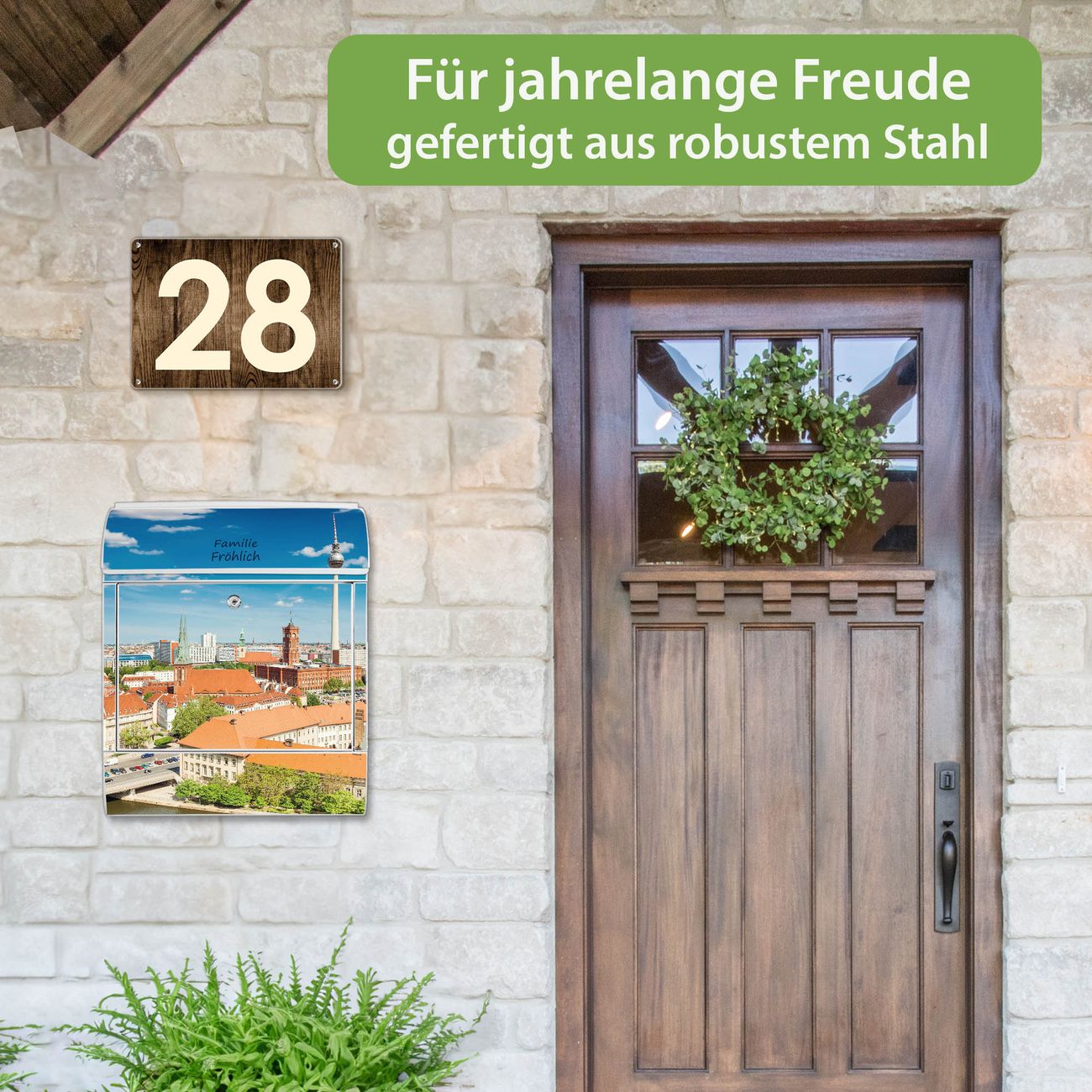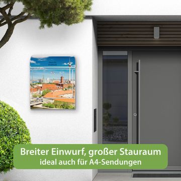DESIGN: Der Postkasten mit Motiv Motiv Berlin Mitte hat ein sehr ansprechendes und ausgefallenes Design, damit entlocken Sie Ihren Nachbarn und dem Postboten ein Lächeln. Heben Sie Sich von der tristen grauen Masse ab, ohne auf Funktionalität zu verzichten. DETAILS: Der Postkasten besteht aus pulverbeschichtetem Stahl. Er ist 38x46x12,5cm groß. Das Motiv besteht aus einer wetter- und UV-resistenten Folie, die mit einem Schutzlaminat überzogen ist, sodass der Briefkasten zusätzlich vor Kratzern geschützt ist. Der Briefkasten wird mit Montagematerial, zusätzlich zwei Schlüssel sowie einer Bohrschablone geliefert. NUTZEN: Sie können diesen Briefkasten sowohl als Wandbriefkasten montieren oder einen passenden Ständer kaufen und als Standbriefkasten einbetonieren. Die Größe bietet genügend Platz für Sendungen aller Art, der Einwurf fasst auch größere A4 Sendungen. BANJADO: Ihr Briefkasten wird in Sachsen in einer kleinen Manufaktur von Hand veredelt. Die Motivfolie ist lösungsmittelfrei und schutzlaminiert für einen langen Halt. Wir legen großen Wert auf die Verbindung von Funktionalität und Design. Sie erhalten Handarbeit aus Sachsen.