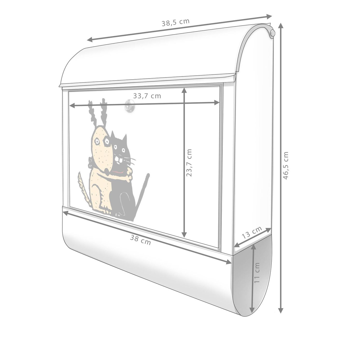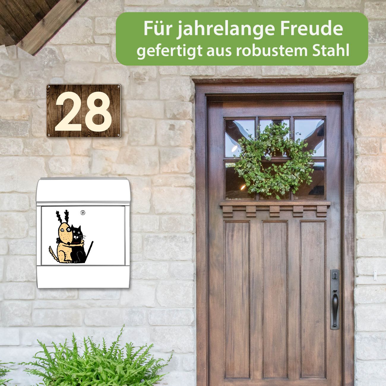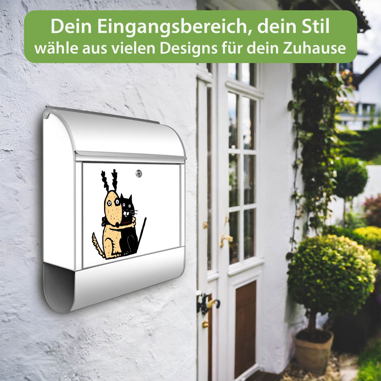 DESIGN: Der Postkasten mit Motiv Motiv Beste Freunde Immer hat ein sehr ansprechendes und ausgefallenes Design, damit entlocken Sie Ihren Nachbarn und dem Postboten ein Lächeln. Heben Sie Sich von der tristen grauen Masse ab, ohne auf Funktionalität zu verzichten. DETAILS: Der Postkasten besteht aus pulverbeschichtetem Stahl. Er ist 38x46x12,5cm groß. Das Motiv besteht aus einer wetter- und UV-resistenten Folie, die mit einem Schutzlaminat überzogen ist, sodass der Briefkasten zusätzlich vor Kratzern geschützt ist. Der Briefkasten wird mit Montagematerial, zusätzlich zwei Schlüssel sowie einer Bohrschablone geliefert. NUTZEN: Sie können diesen Briefkasten sowohl als Wandbriefkasten montieren oder einen passenden Ständer kaufen und als Standbriefkasten einbetonieren. Die Größe bietet genügend Platz für Sendungen aller Art, der Einwurf fasst auch größere A4 Sendungen. BANJADO: Ihr Briefkasten wird in Sachsen in einer kleinen Manufaktur von Hand veredelt. Die Motivfolie ist lösungsmittelfrei und schutzlaminiert für einen langen Halt. Wir legen großen Wert auf die Verbindung von Funktionalität und Design. Sie erhalten Handarbeit aus Sachsen.