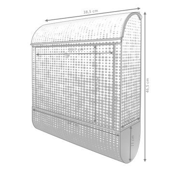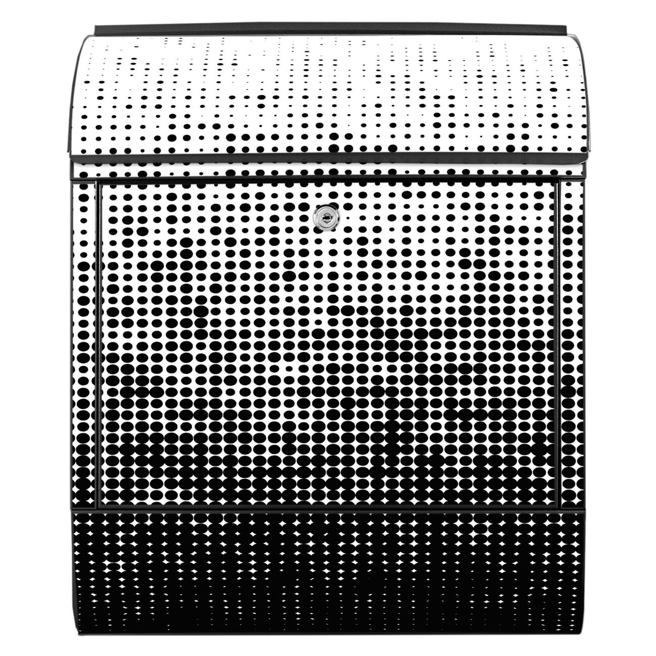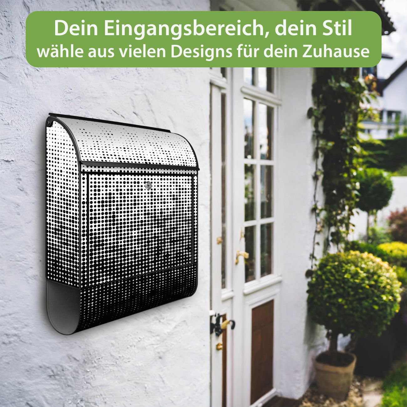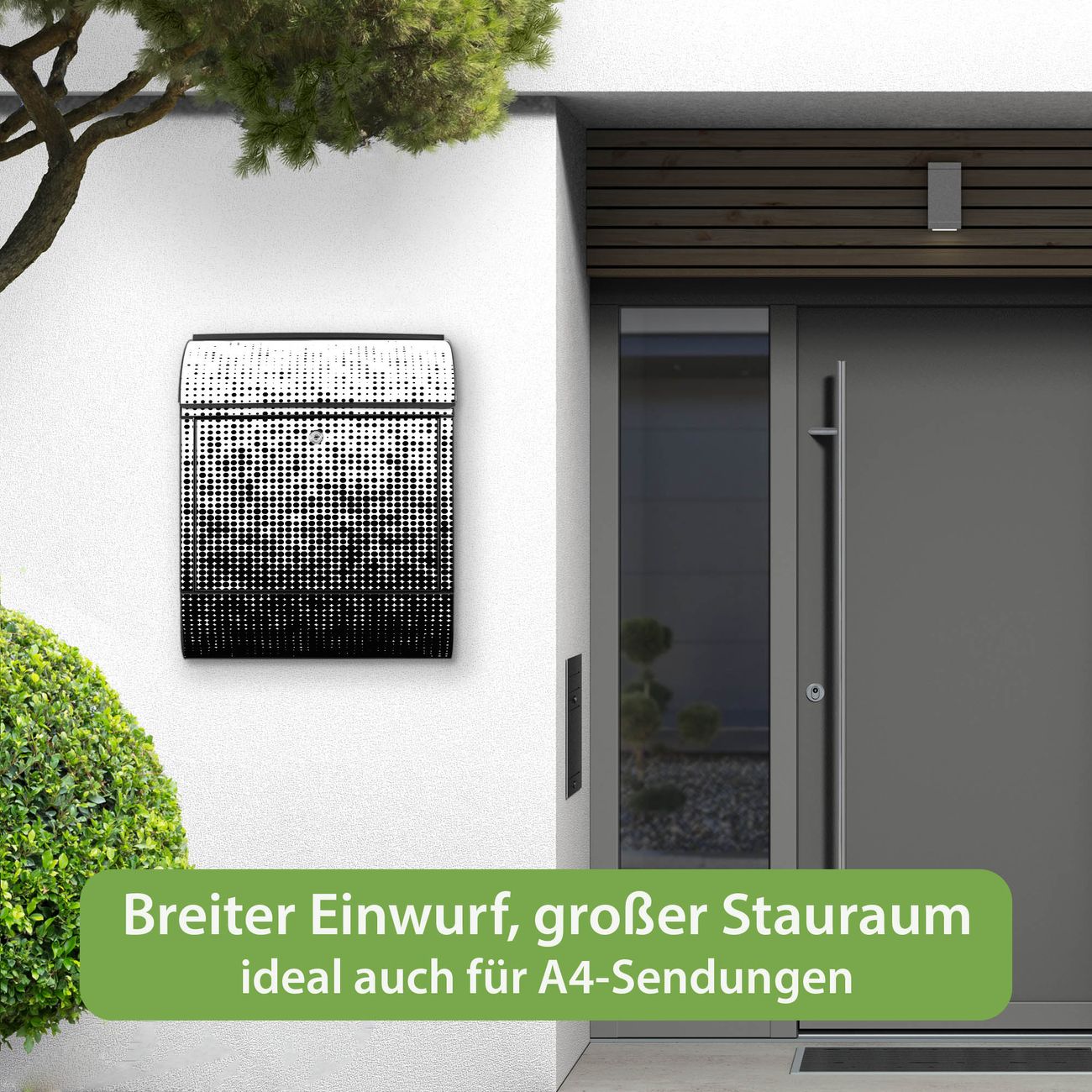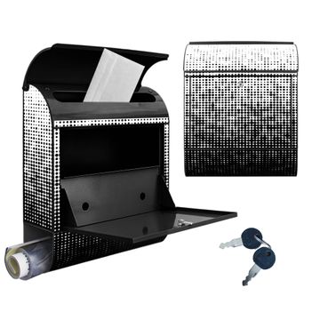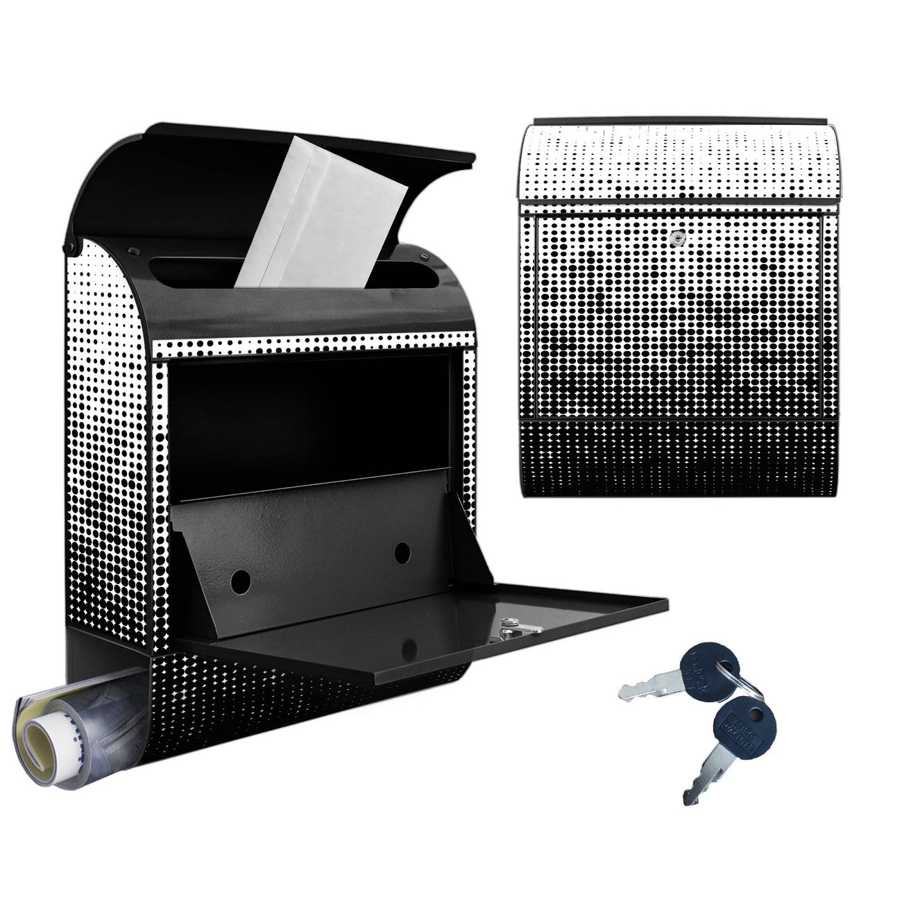 DESIGN: Der Postkasten mit Motiv Motiv Black or White hat ein sehr ansprechendes und ausgefallenes Design, damit entlocken Sie Ihren Nachbarn und dem Postboten ein Lächeln. Heben Sie Sich von der tristen grauen Masse ab, ohne auf Funktionalität zu verzichten. DETAILS: Der Postkasten besteht aus pulverbeschichtetem Stahl. Er ist 38x46x12,5cm groß. Das Motiv besteht aus einer wetter- und UV-resistenten Folie, die mit einem Schutzlaminat überzogen ist, sodass der Briefkasten zusätzlich vor Kratzern geschützt ist. Der Briefkasten wird mit Montagematerial, zusätzlich zwei Schlüssel sowie einer Bohrschablone geliefert. NUTZEN: Sie können diesen Briefkasten sowohl als Wandbriefkasten montieren oder einen passenden Ständer kaufen und als Standbriefkasten einbetonieren. Die Größe bietet genügend Platz für Sendungen aller Art, der Einwurf fasst auch größere A4 Sendungen. BANJADO: Ihr Briefkasten wird in Sachsen in einer kleinen Manufaktur von Hand veredelt. Die Motivfolie ist lösungsmittelfrei und schutzlaminiert für einen langen Halt. Wir legen großen Wert auf die Verbindung von Funktionalität und Design. Sie erhalten Handarbeit aus Sachsen.