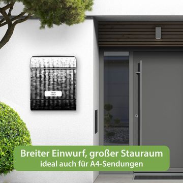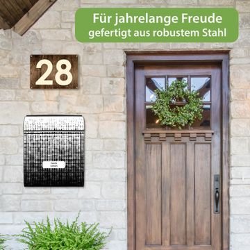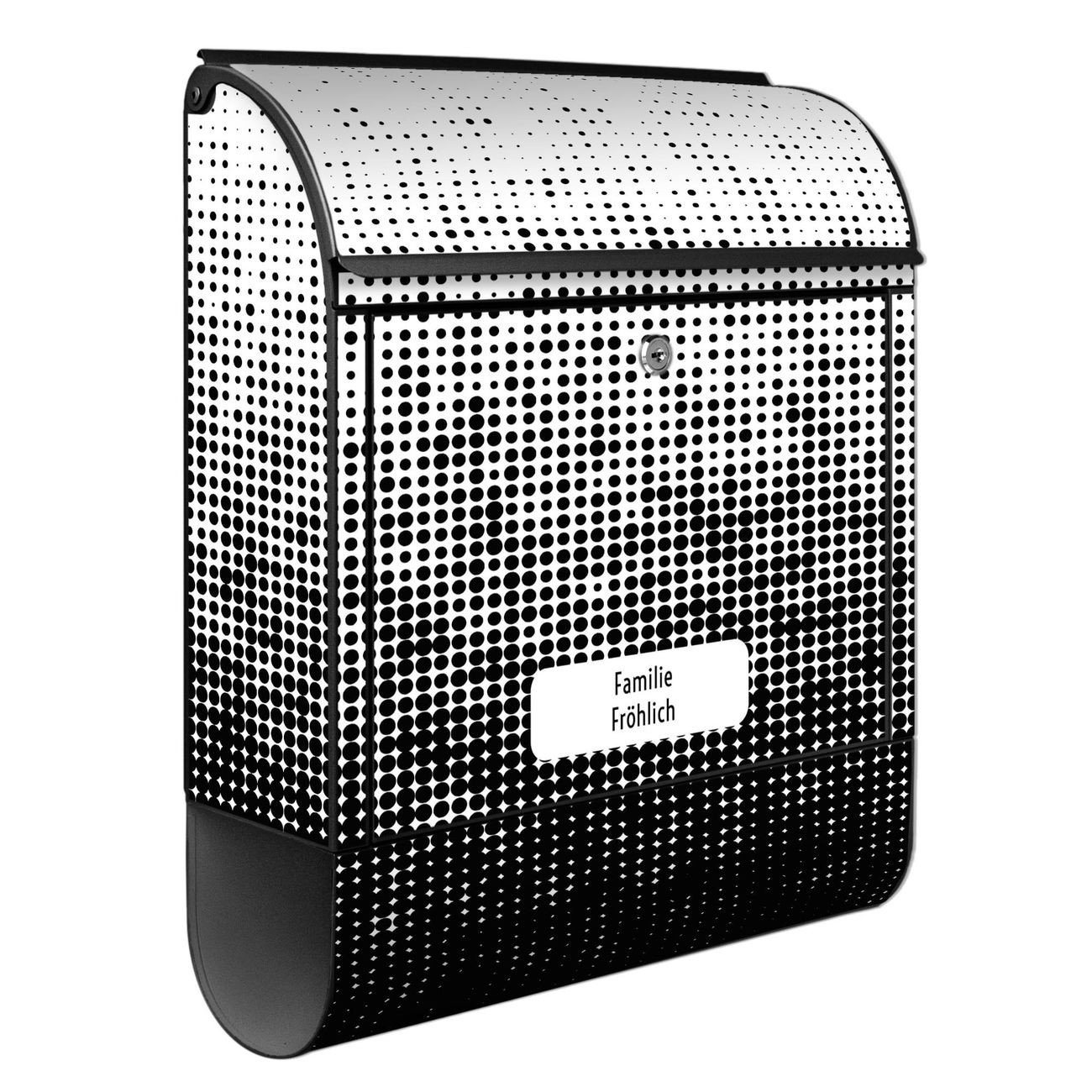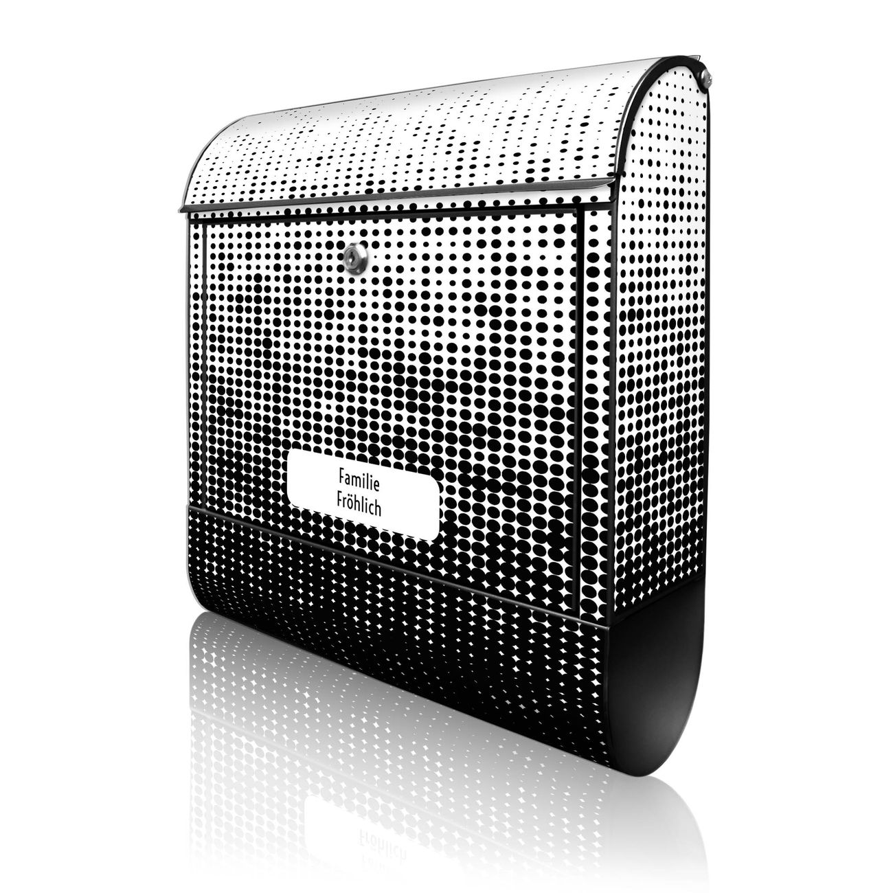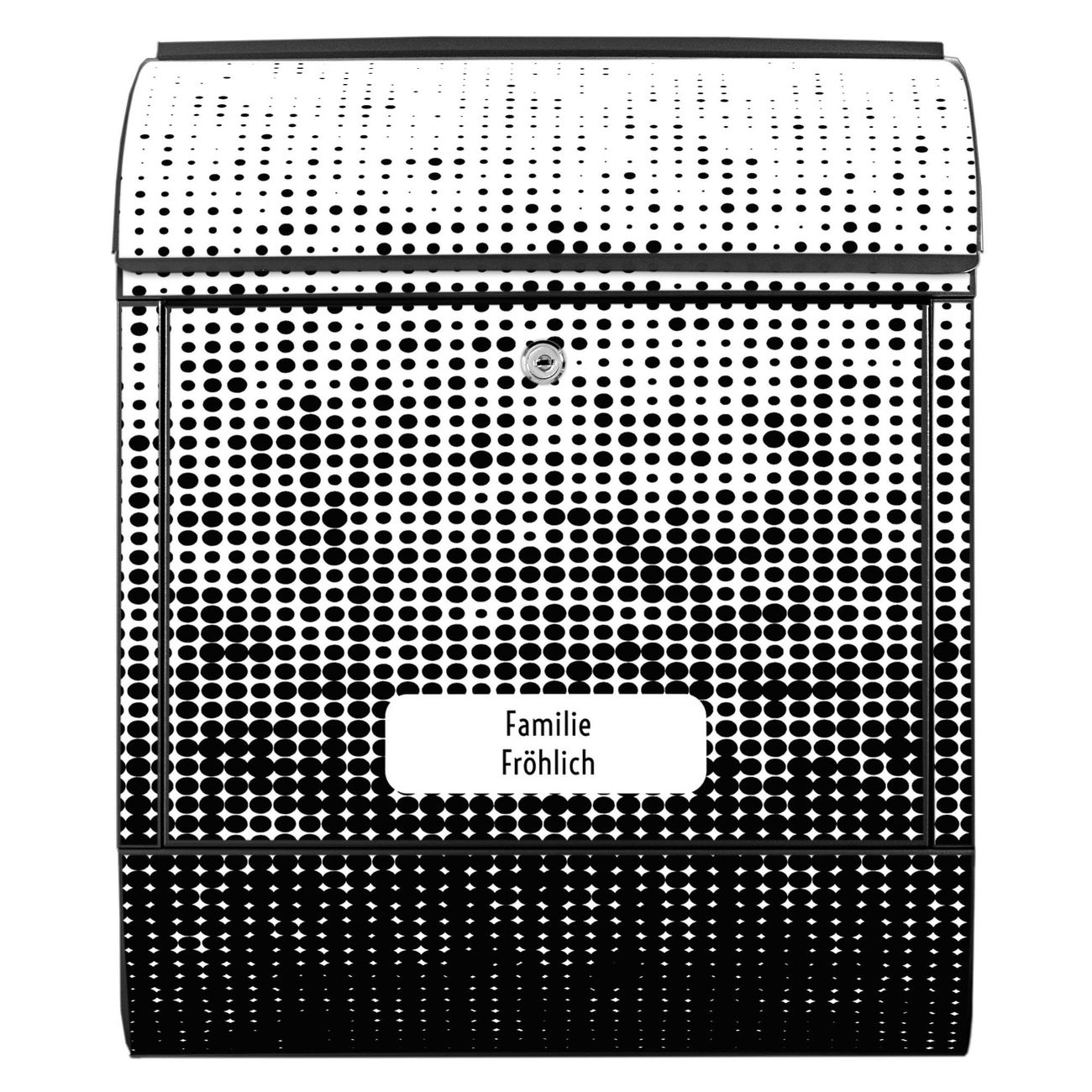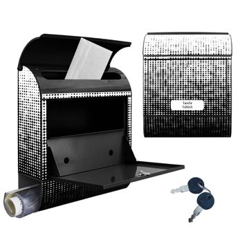 DESIGN: Der Postkasten mit Motiv Motiv Black or White hat ein sehr ansprechendes und ausgefallenes Design, damit entlocken Sie Ihren Nachbarn und dem Postboten ein Lächeln. Heben Sie Sich von der tristen grauen Masse ab, ohne auf Funktionalität zu verzichten. DETAILS: Der Postkasten besteht aus pulverbeschichtetem Stahl. Er ist 38x46x12,5cm groß. Das Motiv besteht aus einer wetter- und UV-resistenten Folie, die mit einem Schutzlaminat überzogen ist, sodass der Briefkasten zusätzlich vor Kratzern geschützt ist. Der Briefkasten wird mit Montagematerial, zusätzlich zwei Schlüssel sowie einer Bohrschablone geliefert. NUTZEN: Sie können diesen Briefkasten sowohl als Wandbriefkasten montieren oder einen passenden Ständer kaufen und als Standbriefkasten einbetonieren. Die Größe bietet genügend Platz für Sendungen aller Art, der Einwurf fasst auch größere A4 Sendungen. BANJADO: Ihr Briefkasten wird in Sachsen in einer kleinen Manufaktur von Hand veredelt. Die Motivfolie ist lösungsmittelfrei und schutzlaminiert für einen langen Halt. Wir legen großen Wert auf die Verbindung von Funktionalität und Design. Sie erhalten Handarbeit aus Sachsen.