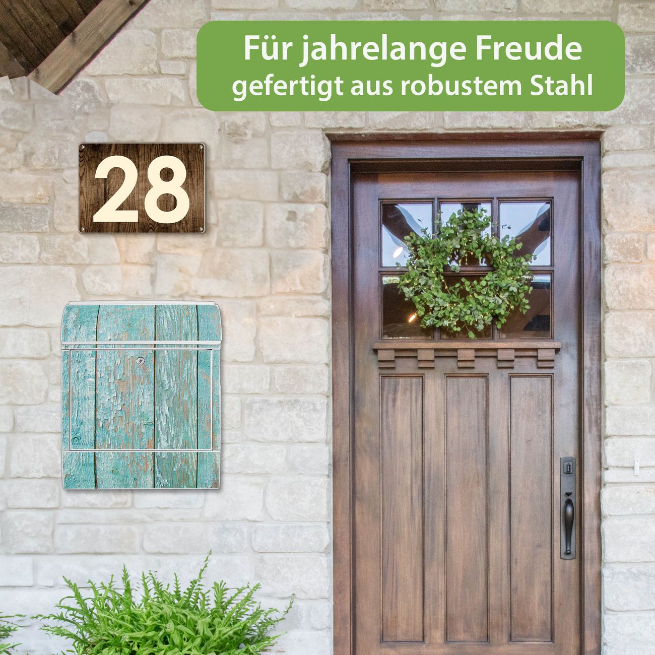 DESIGN: Der Postkasten mit Motiv Motiv Blaue Planken hat ein sehr ansprechendes und ausgefallenes Design, damit entlocken Sie Ihren Nachbarn und dem Postboten ein Lächeln. Heben Sie Sich von der tristen grauen Masse ab, ohne auf Funktionalität zu verzichten. DETAILS: Der Postkasten besteht aus pulverbeschichtetem Stahl. Er ist 38x46x12,5cm groß. Das Motiv besteht aus einer wetter- und UV-resistenten Folie, die mit einem Schutzlaminat überzogen ist, sodass der Briefkasten zusätzlich vor Kratzern geschützt ist. Der Briefkasten wird mit Montagematerial, zusätzlich zwei Schlüssel sowie einer Bohrschablone geliefert. NUTZEN: Sie können diesen Briefkasten sowohl als Wandbriefkasten montieren oder einen passenden Ständer kaufen und als Standbriefkasten einbetonieren. Die Größe bietet genügend Platz für Sendungen aller Art, der Einwurf fasst auch größere A4 Sendungen. BANJADO: Ihr Briefkasten wird in Sachsen in einer kleinen Manufaktur von Hand veredelt. Die Motivfolie ist lösungsmittelfrei und schutzlaminiert für einen langen Halt. Wir legen großen Wert auf die Verbindung von Funktionalität und Design. Sie erhalten Handarbeit aus Sachsen.