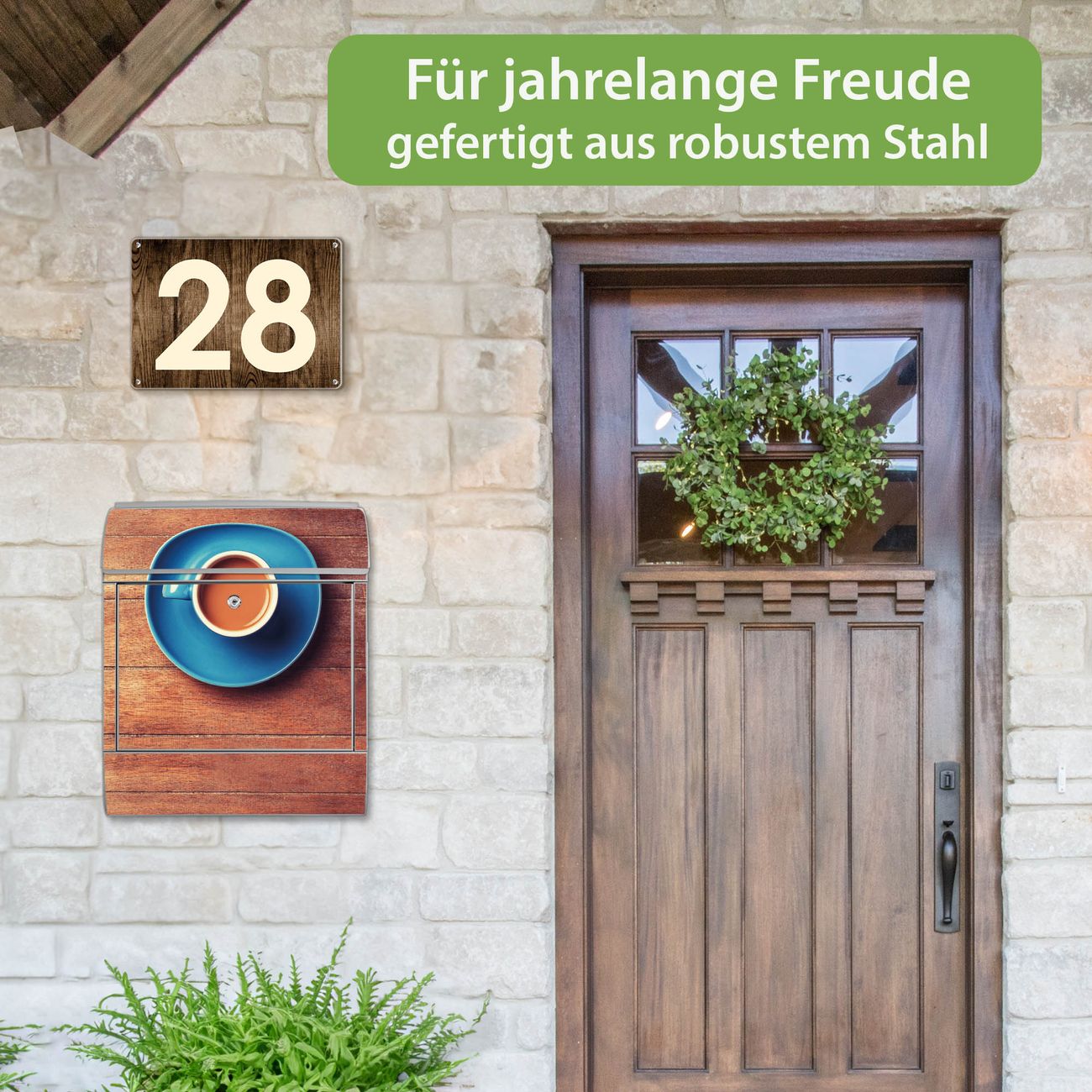 DESIGN: Der Postkasten mit Motiv Motiv Blaue Tasse hat ein sehr ansprechendes und ausgefallenes Design, damit entlocken Sie Ihren Nachbarn und dem Postboten ein Lächeln. Heben Sie Sich von der tristen grauen Masse ab, ohne auf Funktionalität zu verzichten. DETAILS: Der Postkasten besteht aus pulverbeschichtetem Stahl. Er ist 38x46x12,5cm groß. Das Motiv besteht aus einer wetter- und UV-resistenten Folie, die mit einem Schutzlaminat überzogen ist, sodass der Briefkasten zusätzlich vor Kratzern geschützt ist. Der Briefkasten wird mit Montagematerial, zusätzlich zwei Schlüssel sowie einer Bohrschablone geliefert. NUTZEN: Sie können diesen Briefkasten sowohl als Wandbriefkasten montieren oder einen passenden Ständer kaufen und als Standbriefkasten einbetonieren. Die Größe bietet genügend Platz für Sendungen aller Art, der Einwurf fasst auch größere A4 Sendungen. BANJADO: Ihr Briefkasten wird in Sachsen in einer kleinen Manufaktur von Hand veredelt. Die Motivfolie ist lösungsmittelfrei und schutzlaminiert für einen langen Halt. Wir legen großen Wert auf die Verbindung von Funktionalität und Design. Sie erhalten Handarbeit aus Sachsen.