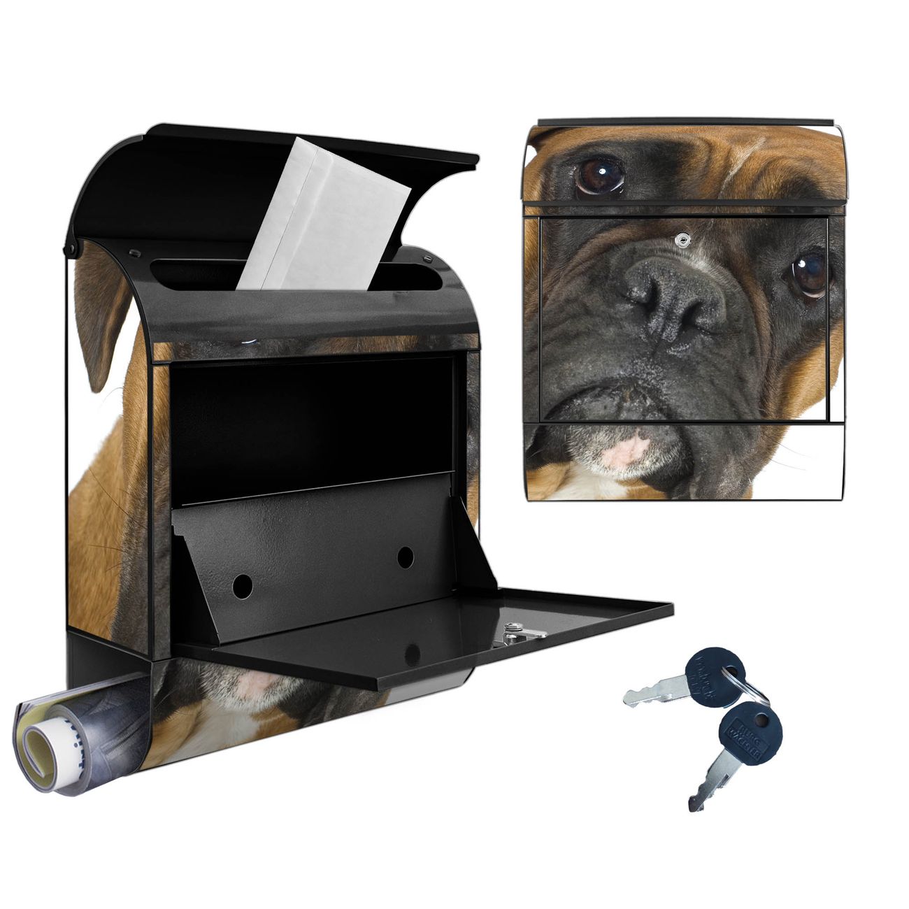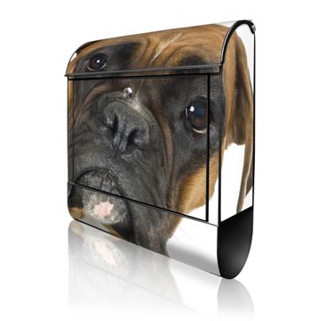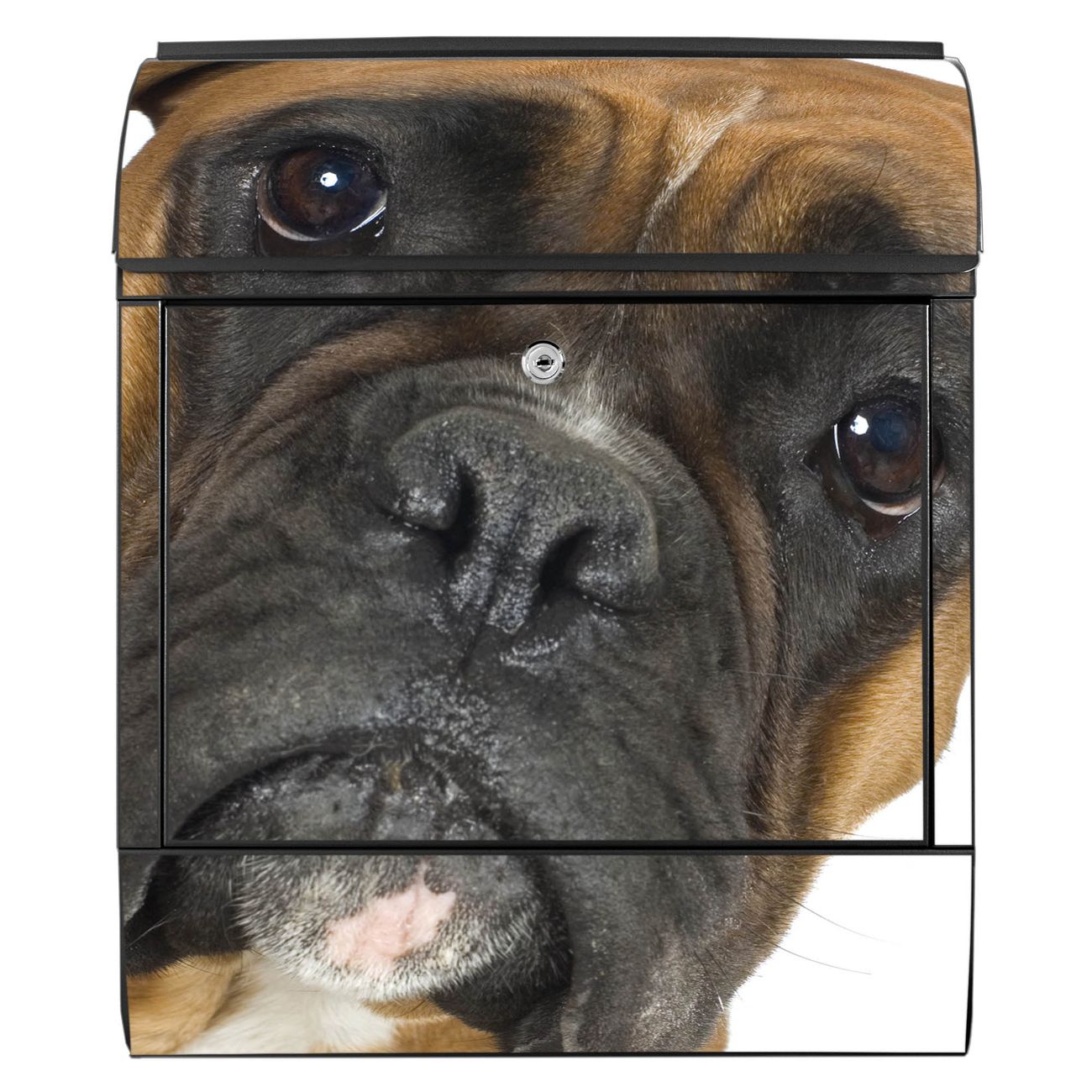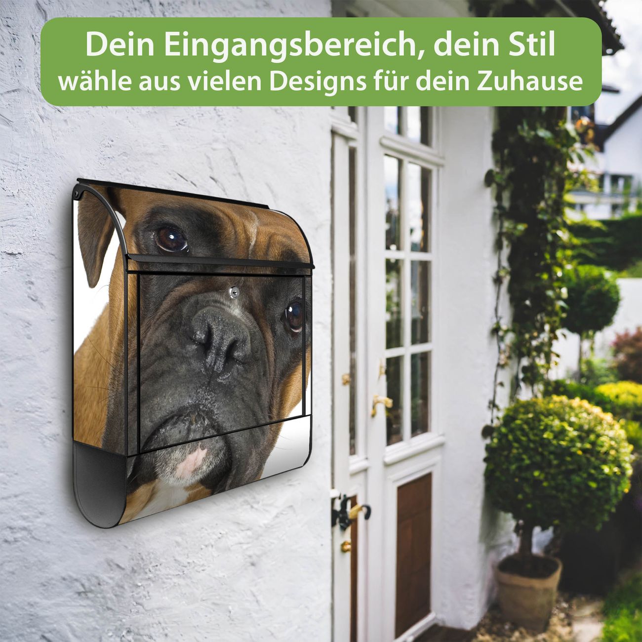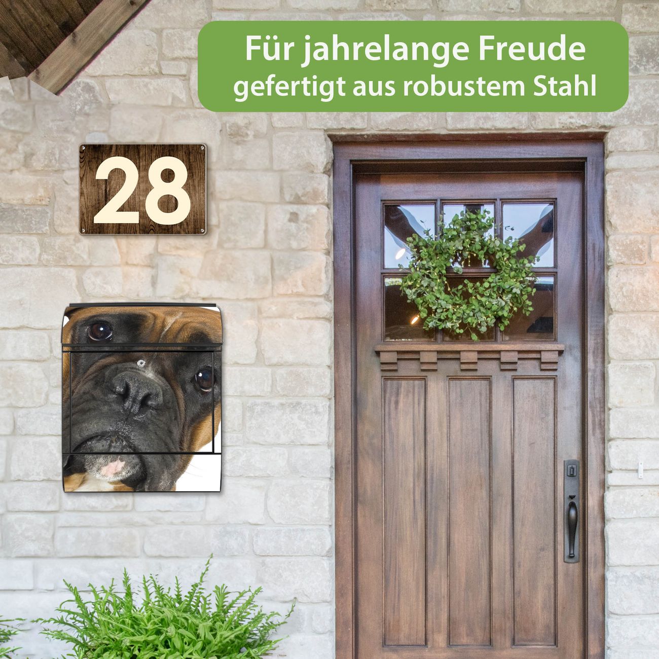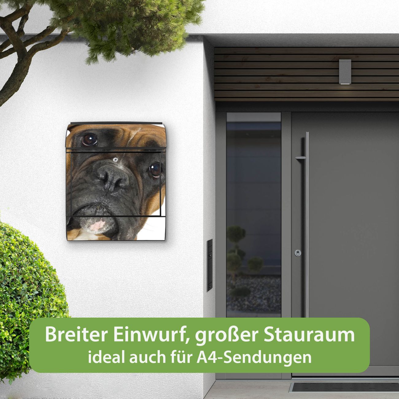 DESIGN: Der Postkasten mit Motiv Motiv Boxer hat ein sehr ansprechendes und ausgefallenes Design, damit entlocken Sie Ihren Nachbarn und dem Postboten ein Lächeln. Heben Sie Sich von der tristen grauen Masse ab, ohne auf Funktionalität zu verzichten. DETAILS: Der Postkasten besteht aus pulverbeschichtetem Stahl. Er ist 38x46x12,5cm groß. Das Motiv besteht aus einer wetter- und UV-resistenten Folie, die mit einem Schutzlaminat überzogen ist, sodass der Briefkasten zusätzlich vor Kratzern geschützt ist. Der Briefkasten wird mit Montagematerial, zusätzlich zwei Schlüssel sowie einer Bohrschablone geliefert. NUTZEN: Sie können diesen Briefkasten sowohl als Wandbriefkasten montieren oder einen passenden Ständer kaufen und als Standbriefkasten einbetonieren. Die Größe bietet genügend Platz für Sendungen aller Art, der Einwurf fasst auch größere A4 Sendungen. BANJADO: Ihr Briefkasten wird in Sachsen in einer kleinen Manufaktur von Hand veredelt. Die Motivfolie ist lösungsmittelfrei und schutzlaminiert für einen langen Halt. Wir legen großen Wert auf die Verbindung von Funktionalität und Design. Sie erhalten Handarbeit aus Sachsen.