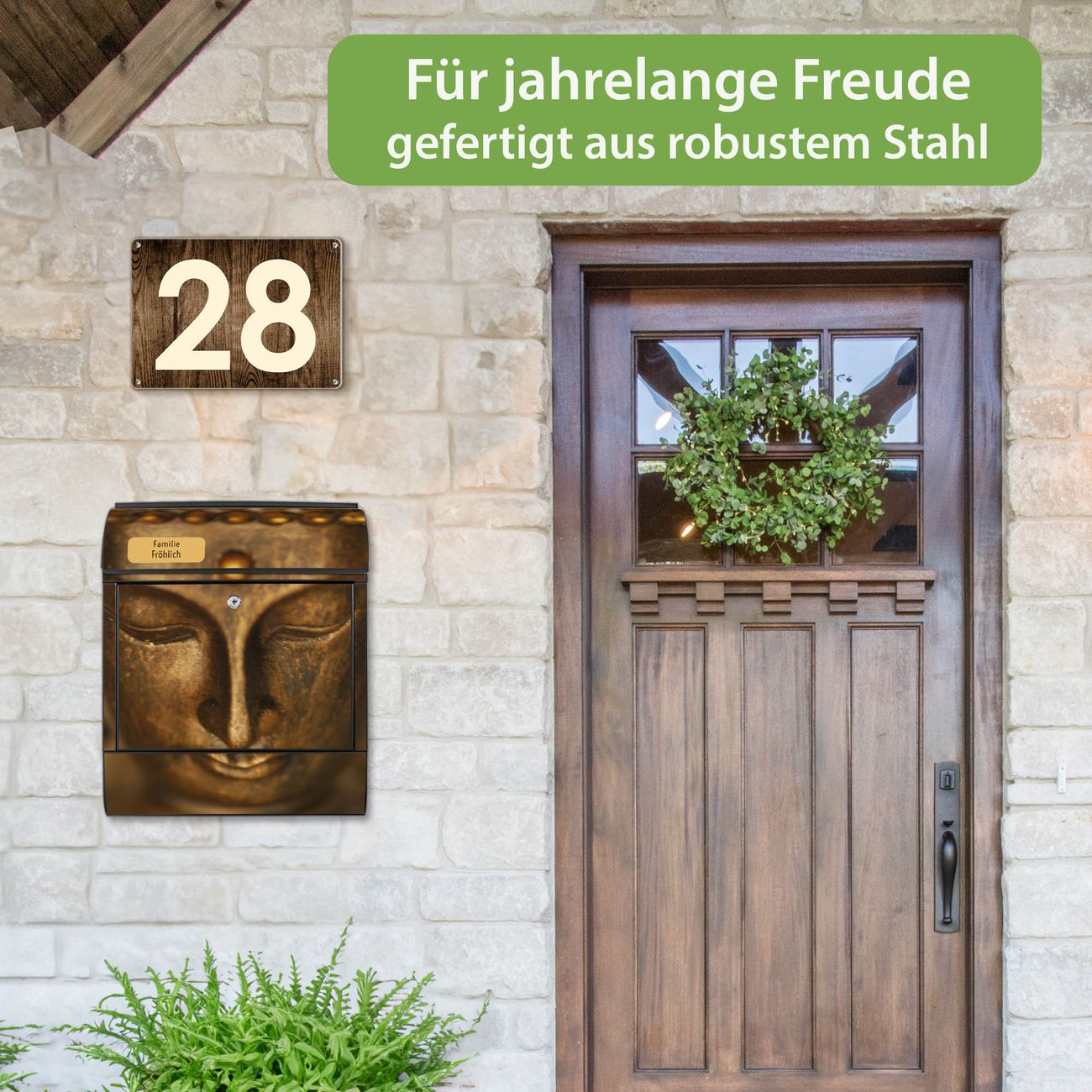 DESIGN: Der Postkasten mit Motiv Motiv Buddha Gold hat ein sehr ansprechendes und ausgefallenes Design, damit entlocken Sie Ihren Nachbarn und dem Postboten ein Lächeln. Heben Sie Sich von der tristen grauen Masse ab, ohne auf Funktionalität zu verzichten. DETAILS: Der Postkasten besteht aus pulverbeschichtetem Stahl. Er ist 38x46x12,5cm groß. Das Motiv besteht aus einer wetter- und UV-resistenten Folie, die mit einem Schutzlaminat überzogen ist, sodass der Briefkasten zusätzlich vor Kratzern geschützt ist. Der Briefkasten wird mit Montagematerial, zusätzlich zwei Schlüssel sowie einer Bohrschablone geliefert. NUTZEN: Sie können diesen Briefkasten sowohl als Wandbriefkasten montieren oder einen passenden Ständer kaufen und als Standbriefkasten einbetonieren. Die Größe bietet genügend Platz für Sendungen aller Art, der Einwurf fasst auch größere A4 Sendungen. BANJADO: Ihr Briefkasten wird in Sachsen in einer kleinen Manufaktur von Hand veredelt. Die Motivfolie ist lösungsmittelfrei und schutzlaminiert für einen langen Halt. Wir legen großen Wert auf die Verbindung von Funktionalität und Design. Sie erhalten Handarbeit aus Sachsen.