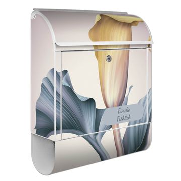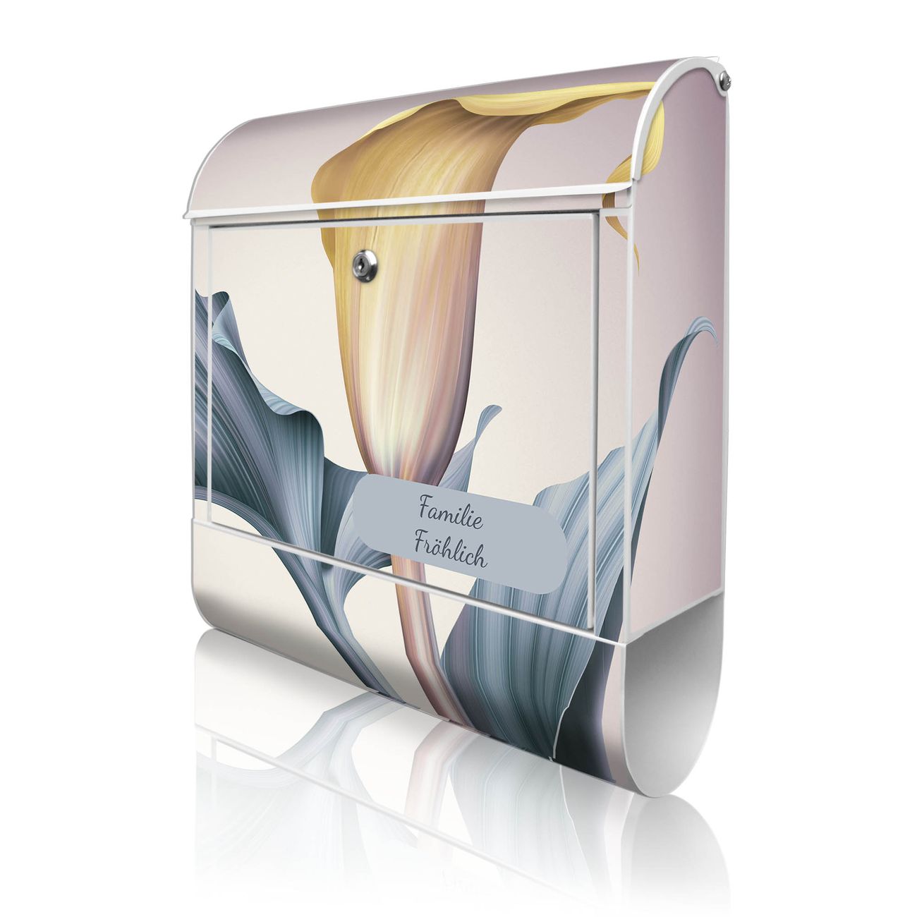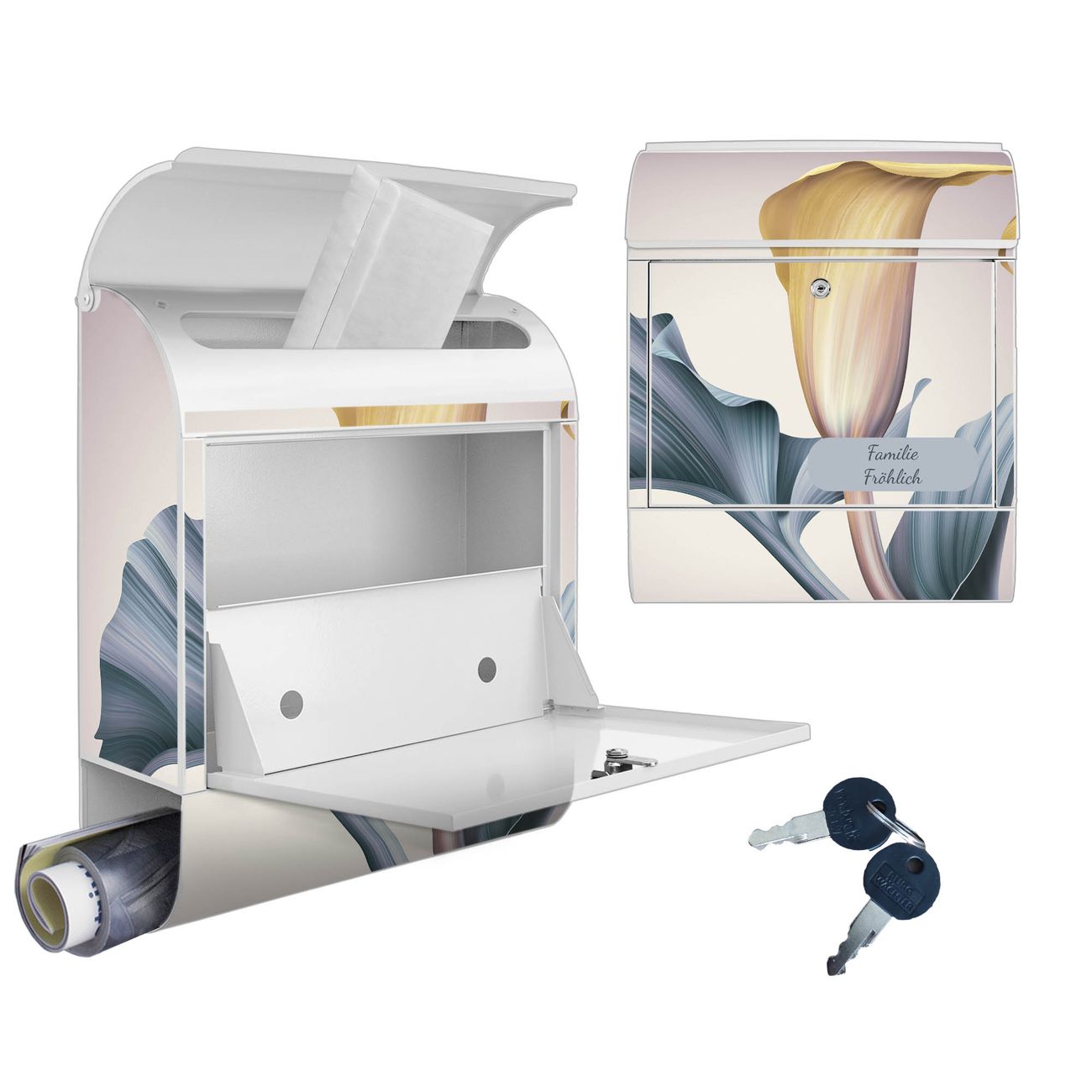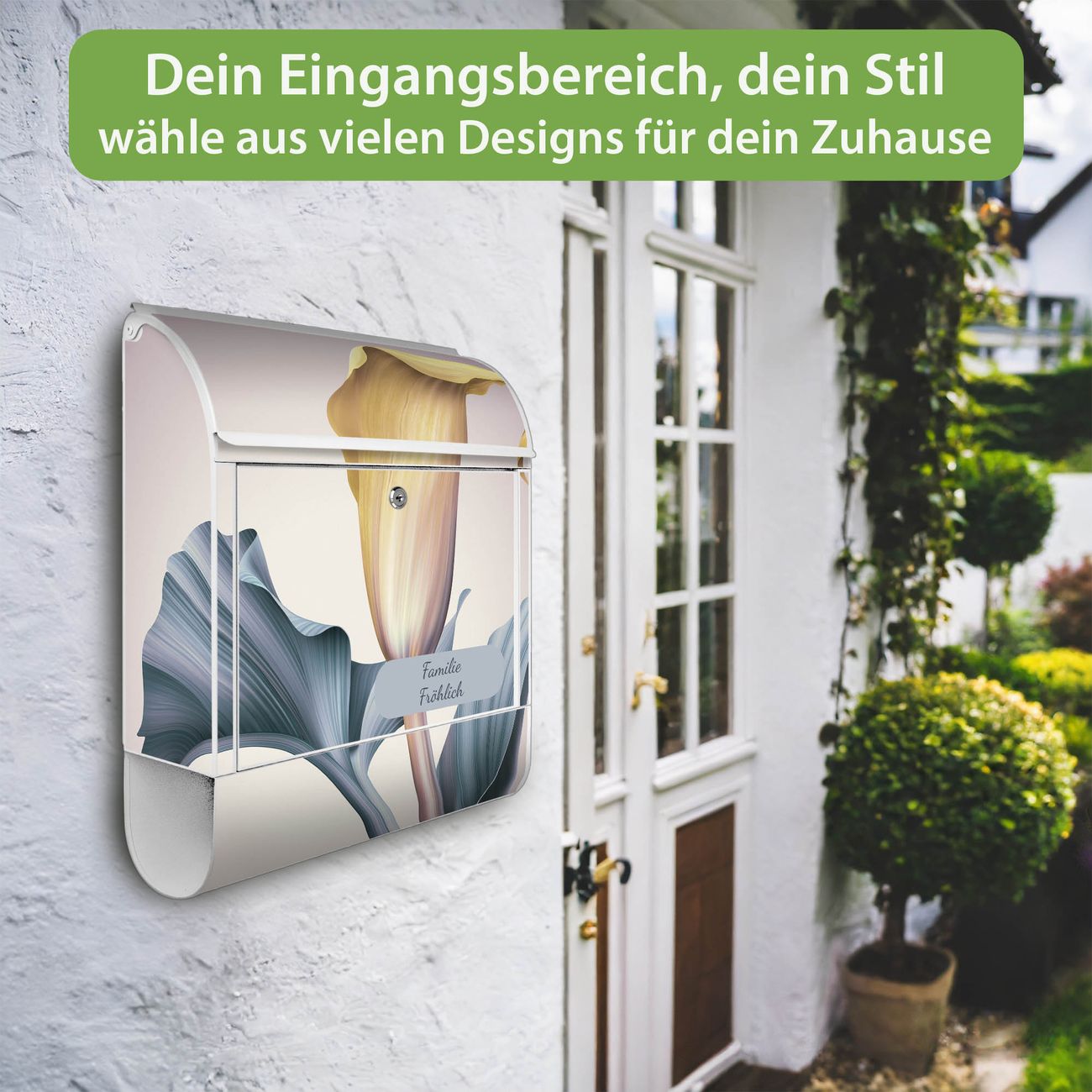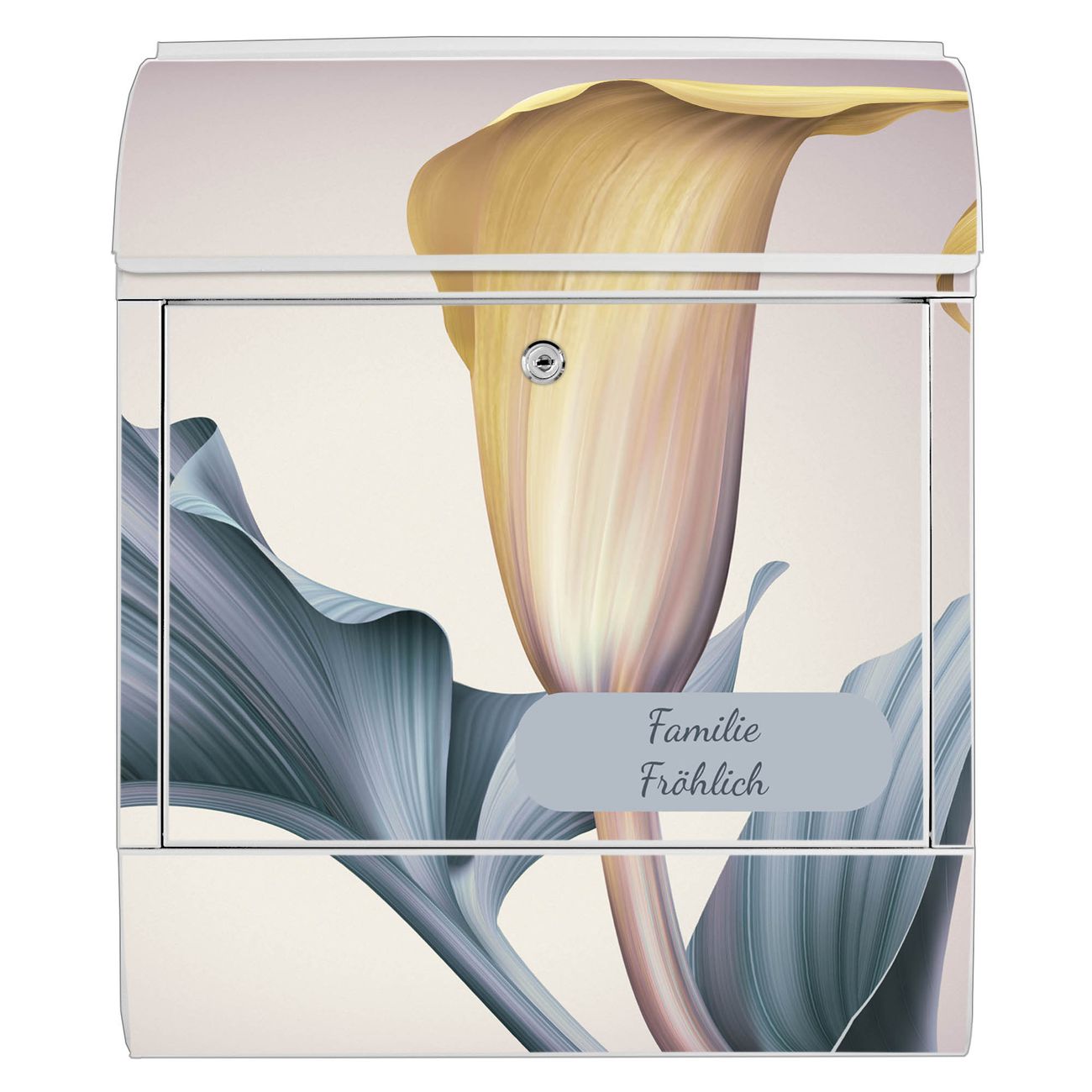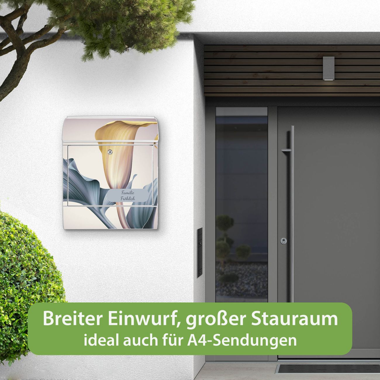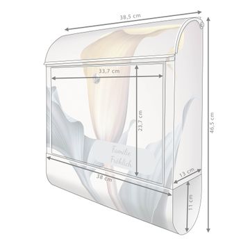 DESIGN: Der Postkasten mit Motiv Motiv Calla hat ein sehr ansprechendes und ausgefallenes Design, damit entlocken Sie Ihren Nachbarn und dem Postboten ein Lächeln. Heben Sie Sich von der tristen grauen Masse ab, ohne auf Funktionalität zu verzichten. DETAILS: Der Postkasten besteht aus pulverbeschichtetem Stahl. Er ist 38x46x12,5cm groß. Das Motiv besteht aus einer wetter- und UV-resistenten Folie, die mit einem Schutzlaminat überzogen ist, sodass der Briefkasten zusätzlich vor Kratzern geschützt ist. Der Briefkasten wird mit Montagematerial, zusätzlich zwei Schlüssel sowie einer Bohrschablone geliefert. NUTZEN: Sie können diesen Briefkasten sowohl als Wandbriefkasten montieren oder einen passenden Ständer kaufen und als Standbriefkasten einbetonieren. Die Größe bietet genügend Platz für Sendungen aller Art, der Einwurf fasst auch größere A4 Sendungen. BANJADO: Ihr Briefkasten wird in Sachsen in einer kleinen Manufaktur von Hand veredelt. Die Motivfolie ist lösungsmittelfrei und schutzlaminiert für einen langen Halt. Wir legen großen Wert auf die Verbindung von Funktionalität und Design. Sie erhalten Handarbeit aus Sachsen.