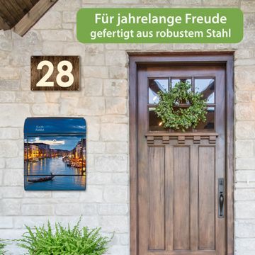 DESIGN: Der Postkasten mit Motiv Motiv Canale Grande Bei Nacht hat ein sehr ansprechendes und ausgefallenes Design, damit entlocken Sie Ihren Nachbarn und dem Postboten ein Lächeln. Heben Sie Sich von der tristen grauen Masse ab, ohne auf Funktionalität zu verzichten. DETAILS: Der Postkasten besteht aus pulverbeschichtetem Stahl. Er ist 38x46x12,5cm groß. Das Motiv besteht aus einer wetter- und UV-resistenten Folie, die mit einem Schutzlaminat überzogen ist, sodass der Briefkasten zusätzlich vor Kratzern geschützt ist. Der Briefkasten wird mit Montagematerial, zusätzlich zwei Schlüssel sowie einer Bohrschablone geliefert. NUTZEN: Sie können diesen Briefkasten sowohl als Wandbriefkasten montieren oder einen passenden Ständer kaufen und als Standbriefkasten einbetonieren. Die Größe bietet genügend Platz für Sendungen aller Art, der Einwurf fasst auch größere A4 Sendungen. BANJADO: Ihr Briefkasten wird in Sachsen in einer kleinen Manufaktur von Hand veredelt. Die Motivfolie ist lösungsmittelfrei und schutzlaminiert für einen langen Halt. Wir legen großen Wert auf die Verbindung von Funktionalität und Design. Sie erhalten Handarbeit aus Sachsen.