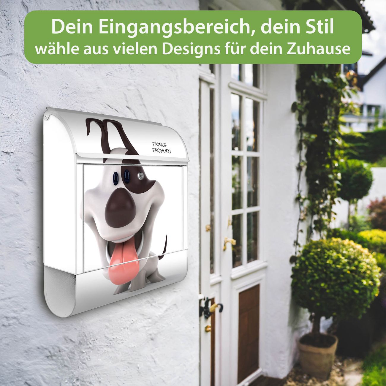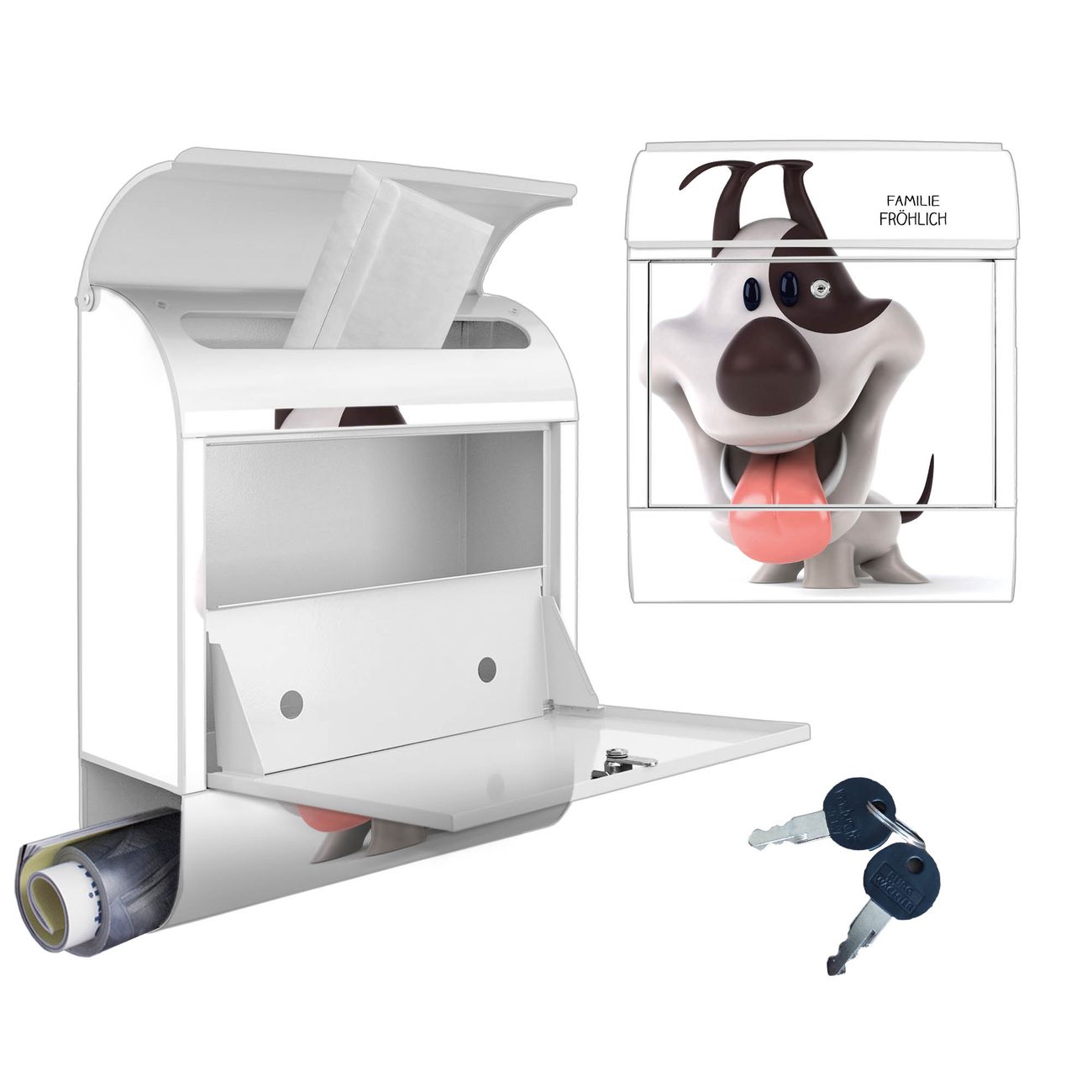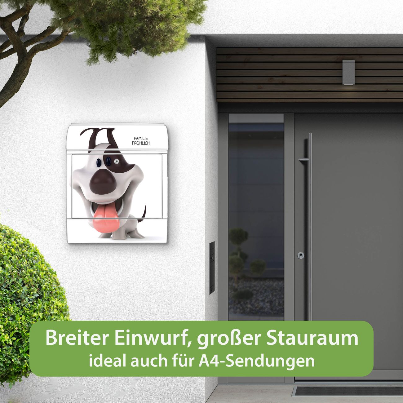 Motiv Comic-Hund Nr. 10245 Material: weiß pulverbeschichtetes Stahlblech Dekorfolie: UV-beständig, wetterfest Gesamtgröße: 38x46x12,5cm BxHxT Briefschlitz: 33x3,5cm BxH Gewicht: ca. 3,4 kg Zubehör: Montagezubehör, 2 Schlüssel, Bohrschablone