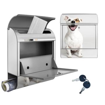 DESIGN: Der Postkasten mit Motiv Motiv Derek hat ein sehr ansprechendes und ausgefallenes Design, damit entlocken Sie Ihren Nachbarn und dem Postboten ein Lächeln. Heben Sie Sich von der tristen grauen Masse ab, ohne auf Funktionalität zu verzichten. DETAILS: Der Postkasten besteht aus pulverbeschichtetem Stahl. Er ist 38x46x12,5cm groß. Das Motiv besteht aus einer wetter- und UV-resistenten Folie, die mit einem Schutzlaminat überzogen ist, sodass der Briefkasten zusätzlich vor Kratzern geschützt ist. Der Briefkasten wird mit Montagematerial, zusätzlich zwei Schlüssel sowie einer Bohrschablone geliefert. NUTZEN: Sie können diesen Briefkasten sowohl als Wandbriefkasten montieren oder einen passenden Ständer kaufen und als Standbriefkasten einbetonieren. Die Größe bietet genügend Platz für Sendungen aller Art, der Einwurf fasst auch größere A4 Sendungen. BANJADO: Ihr Briefkasten wird in Sachsen in einer kleinen Manufaktur von Hand veredelt. Die Motivfolie ist lösungsmittelfrei und schutzlaminiert für einen langen Halt. Wir legen großen Wert auf die Verbindung von Funktionalität und Design. Sie erhalten Handarbeit aus Sachsen.