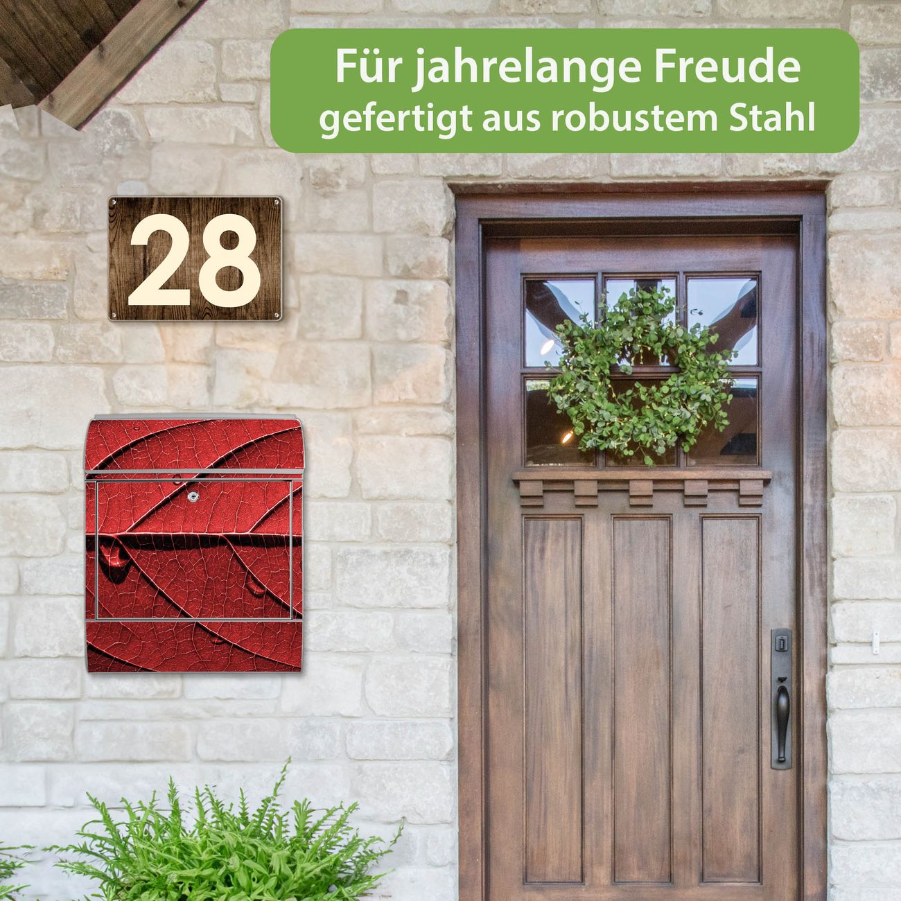 DESIGN: Der Postkasten mit Motiv Motiv Detail Blatt hat ein sehr ansprechendes und ausgefallenes Design, damit entlocken Sie Ihren Nachbarn und dem Postboten ein Lächeln. Heben Sie Sich von der tristen grauen Masse ab, ohne auf Funktionalität zu verzichten. DETAILS: Der Postkasten besteht aus pulverbeschichtetem Stahl. Er ist 38x46x12,5cm groß. Das Motiv besteht aus einer wetter- und UV-resistenten Folie, die mit einem Schutzlaminat überzogen ist, sodass der Briefkasten zusätzlich vor Kratzern geschützt ist. Der Briefkasten wird mit Montagematerial, zusätzlich zwei Schlüssel sowie einer Bohrschablone geliefert. NUTZEN: Sie können diesen Briefkasten sowohl als Wandbriefkasten montieren oder einen passenden Ständer kaufen und als Standbriefkasten einbetonieren. Die Größe bietet genügend Platz für Sendungen aller Art, der Einwurf fasst auch größere A4 Sendungen. BANJADO: Ihr Briefkasten wird in Sachsen in einer kleinen Manufaktur von Hand veredelt. Die Motivfolie ist lösungsmittelfrei und schutzlaminiert für einen langen Halt. Wir legen großen Wert auf die Verbindung von Funktionalität und Design. Sie erhalten Handarbeit aus Sachsen.