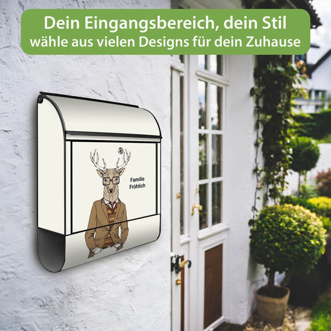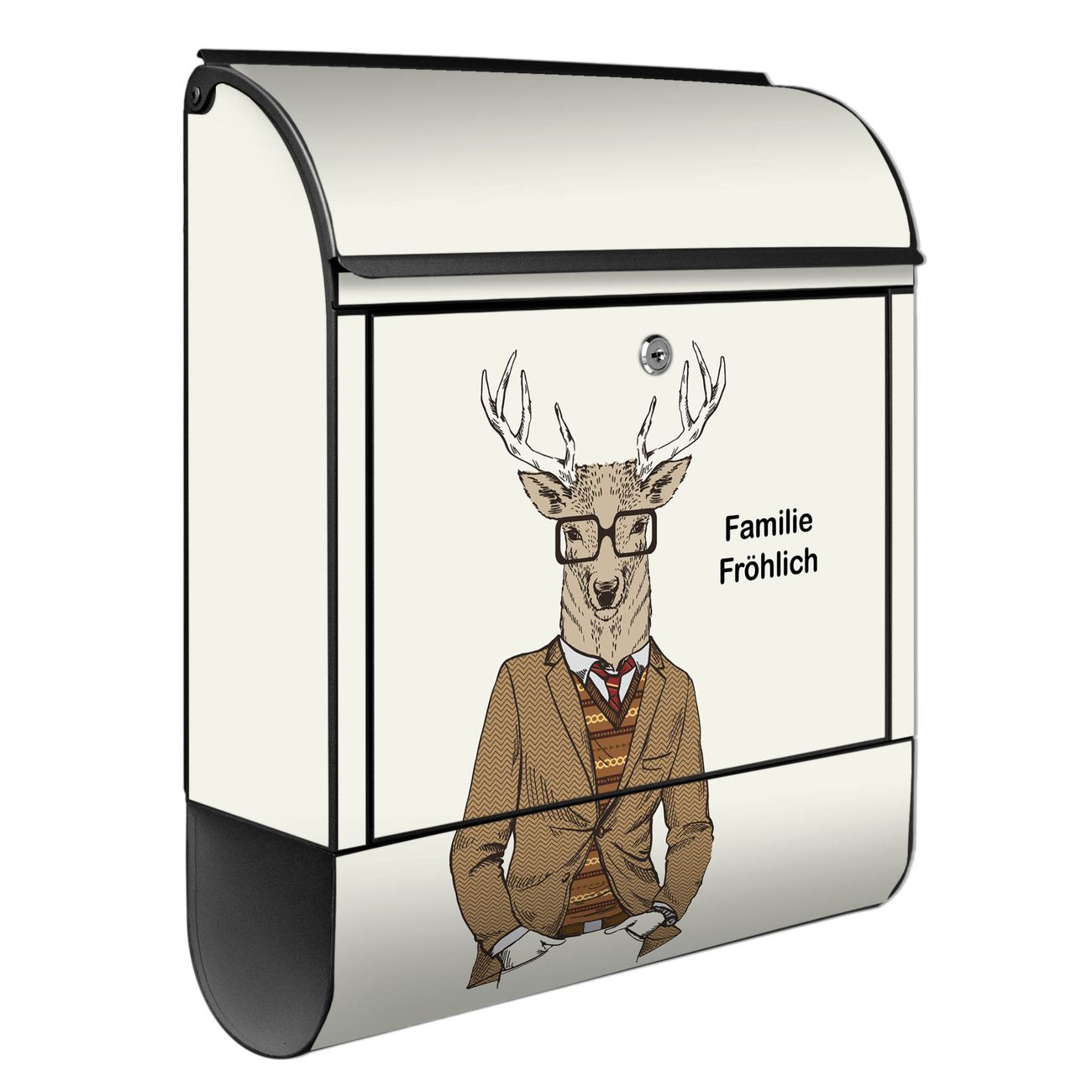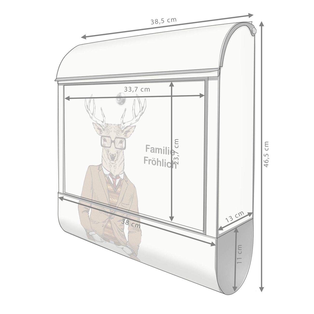 DESIGN: Der Postkasten mit Motiv Motiv Doktor Hirsch hat ein sehr ansprechendes und ausgefallenes Design, damit entlocken Sie Ihren Nachbarn und dem Postboten ein Lächeln. Heben Sie Sich von der tristen grauen Masse ab, ohne auf Funktionalität zu verzichten. DETAILS: Der Postkasten besteht aus pulverbeschichtetem Stahl. Er ist 38x46x12,5cm groß. Das Motiv besteht aus einer wetter- und UV-resistenten Folie, die mit einem Schutzlaminat überzogen ist, sodass der Briefkasten zusätzlich vor Kratzern geschützt ist. Der Briefkasten wird mit Montagematerial, zusätzlich zwei Schlüssel sowie einer Bohrschablone geliefert. NUTZEN: Sie können diesen Briefkasten sowohl als Wandbriefkasten montieren oder einen passenden Ständer kaufen und als Standbriefkasten einbetonieren. Die Größe bietet genügend Platz für Sendungen aller Art, der Einwurf fasst auch größere A4 Sendungen. BANJADO: Ihr Briefkasten wird in Sachsen in einer kleinen Manufaktur von Hand veredelt. Die Motivfolie ist lösungsmittelfrei und schutzlaminiert für einen langen Halt. Wir legen großen Wert auf die Verbindung von Funktionalität und Design. Sie erhalten Handarbeit aus Sachsen.