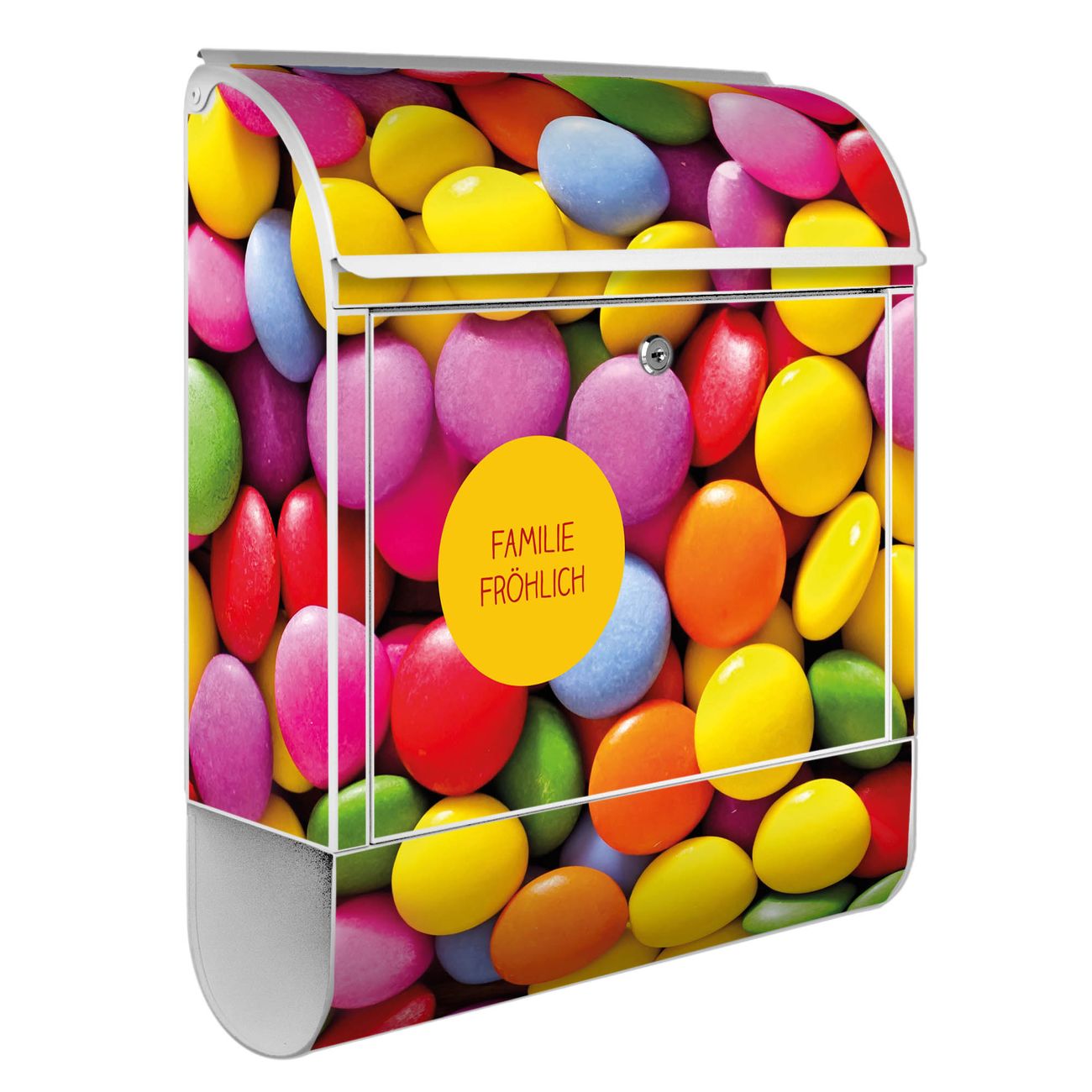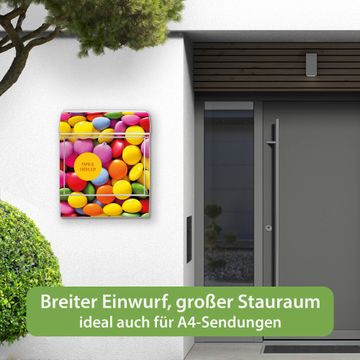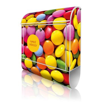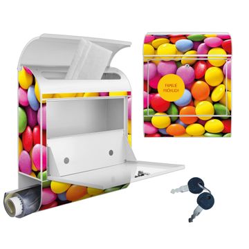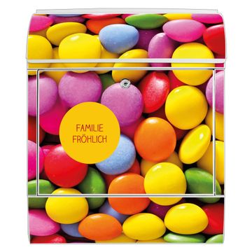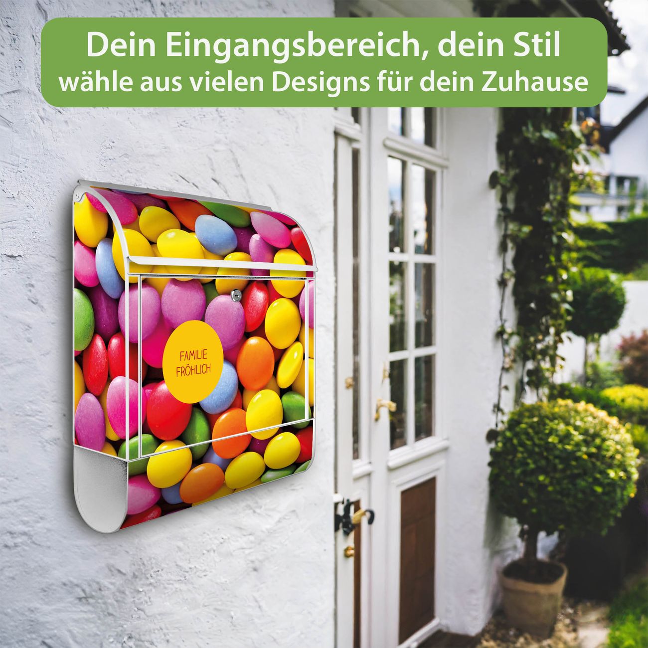 DESIGN: Der Postkasten mit Motiv Motiv Dragees hat ein sehr ansprechendes und ausgefallenes Design, damit entlocken Sie Ihren Nachbarn und dem Postboten ein Lächeln. Heben Sie Sich von der tristen grauen Masse ab, ohne auf Funktionalität zu verzichten. DETAILS: Der Postkasten besteht aus pulverbeschichtetem Stahl. Er ist 38x46x12,5cm groß. Das Motiv besteht aus einer wetter- und UV-resistenten Folie, die mit einem Schutzlaminat überzogen ist, sodass der Briefkasten zusätzlich vor Kratzern geschützt ist. Der Briefkasten wird mit Montagematerial, zusätzlich zwei Schlüssel sowie einer Bohrschablone geliefert. NUTZEN: Sie können diesen Briefkasten sowohl als Wandbriefkasten montieren oder einen passenden Ständer kaufen und als Standbriefkasten einbetonieren. Die Größe bietet genügend Platz für Sendungen aller Art, der Einwurf fasst auch größere A4 Sendungen. BANJADO: Ihr Briefkasten wird in Sachsen in einer kleinen Manufaktur von Hand veredelt. Die Motivfolie ist lösungsmittelfrei und schutzlaminiert für einen langen Halt. Wir legen großen Wert auf die Verbindung von Funktionalität und Design. Sie erhalten Handarbeit aus Sachsen.