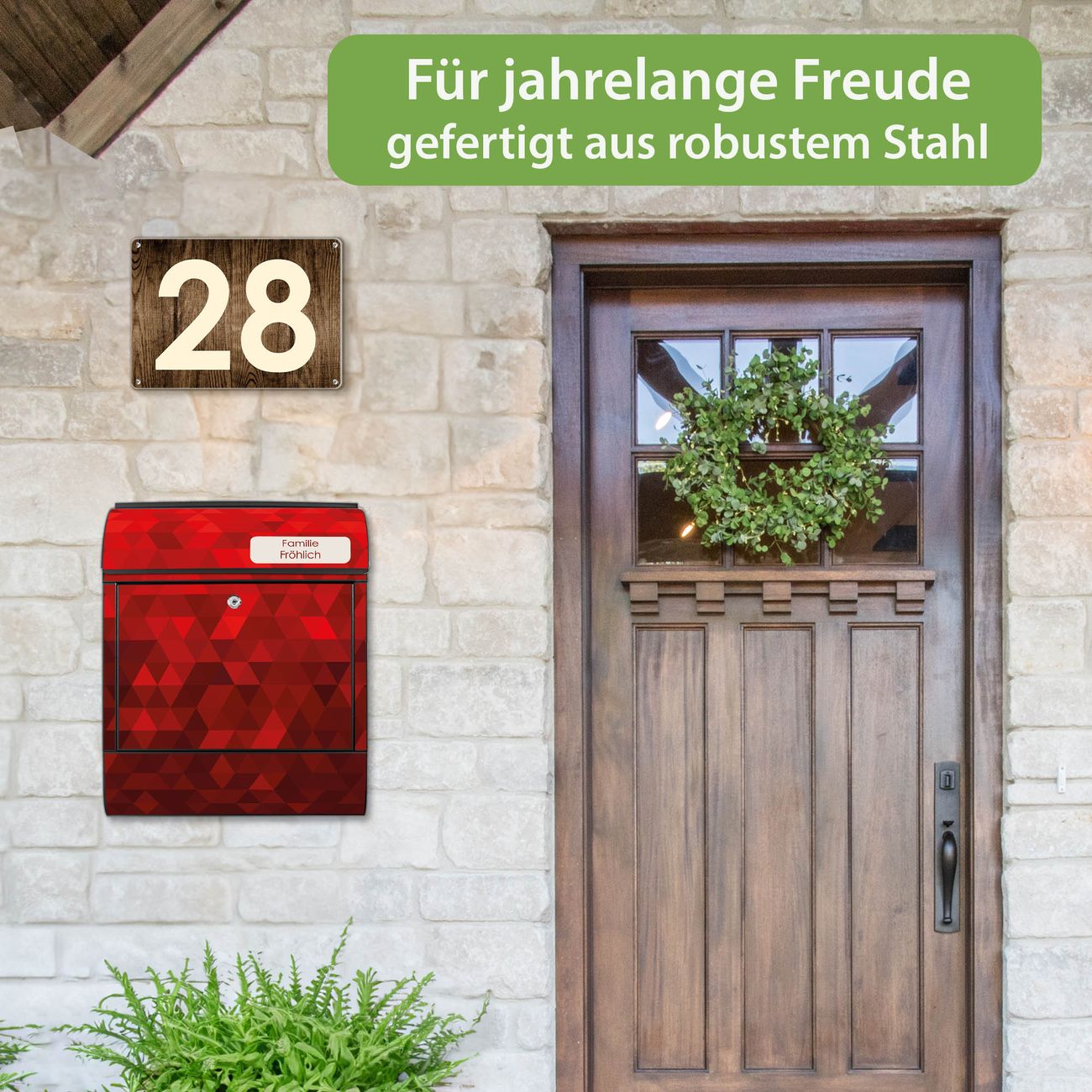 DESIGN: Der Postkasten mit Motiv Motiv Dreiecke Rot hat ein sehr ansprechendes und ausgefallenes Design, damit entlocken Sie Ihren Nachbarn und dem Postboten ein Lächeln. Heben Sie Sich von der tristen grauen Masse ab, ohne auf Funktionalität zu verzichten. DETAILS: Der Postkasten besteht aus pulverbeschichtetem Stahl. Er ist 38x46x12,5cm groß. Das Motiv besteht aus einer wetter- und UV-resistenten Folie, die mit einem Schutzlaminat überzogen ist, sodass der Briefkasten zusätzlich vor Kratzern geschützt ist. Der Briefkasten wird mit Montagematerial, zusätzlich zwei Schlüssel sowie einer Bohrschablone geliefert. NUTZEN: Sie können diesen Briefkasten sowohl als Wandbriefkasten montieren oder einen passenden Ständer kaufen und als Standbriefkasten einbetonieren. Die Größe bietet genügend Platz für Sendungen aller Art, der Einwurf fasst auch größere A4 Sendungen. BANJADO: Ihr Briefkasten wird in Sachsen in einer kleinen Manufaktur von Hand veredelt. Die Motivfolie ist lösungsmittelfrei und schutzlaminiert für einen langen Halt. Wir legen großen Wert auf die Verbindung von Funktionalität und Design. Sie erhalten Handarbeit aus Sachsen.