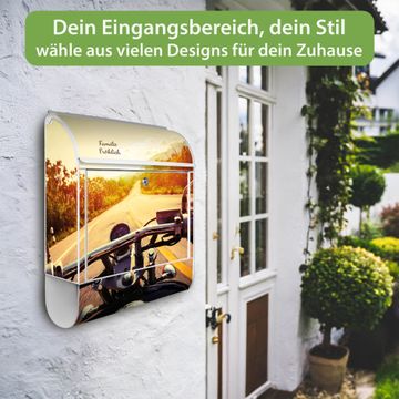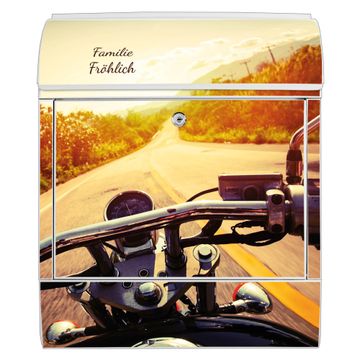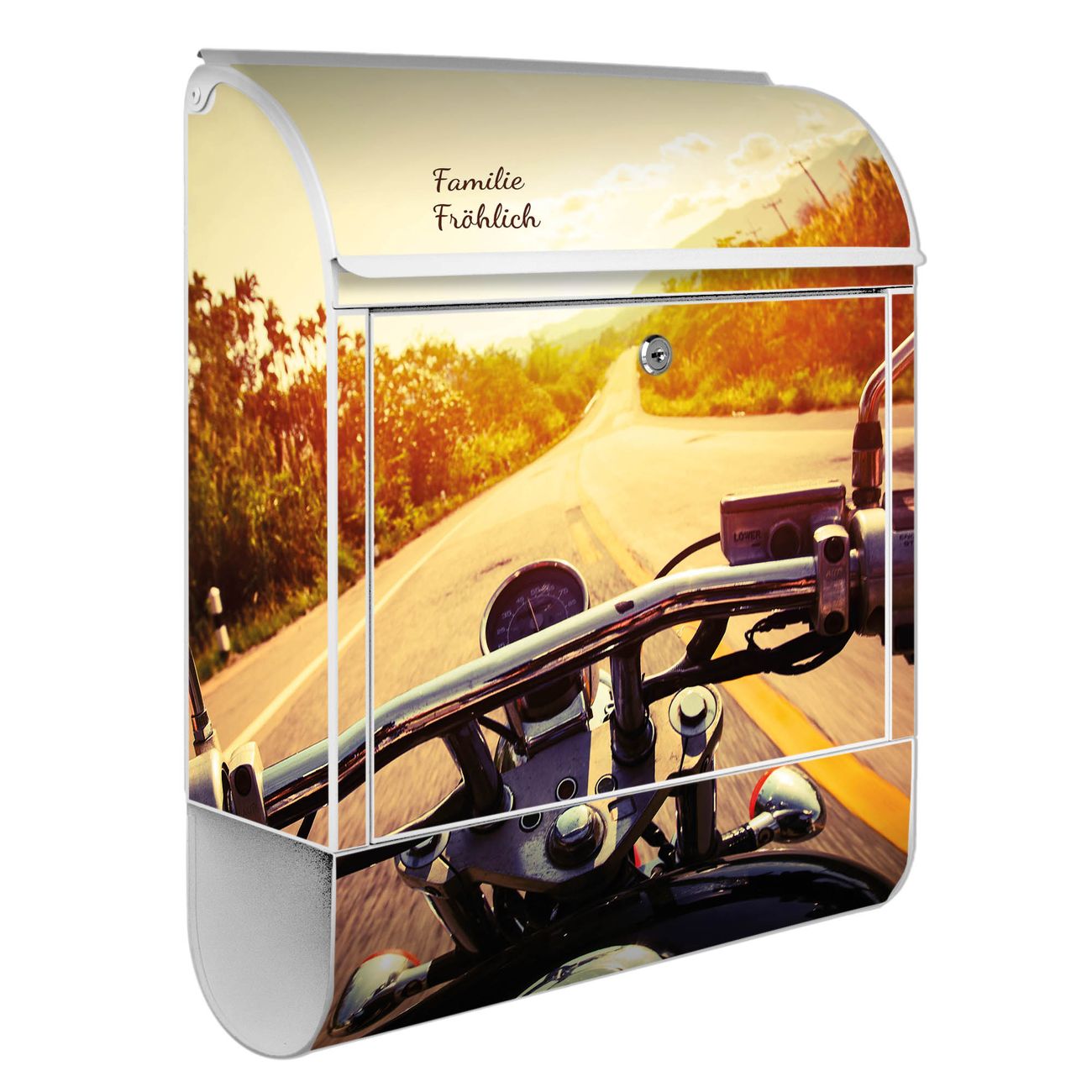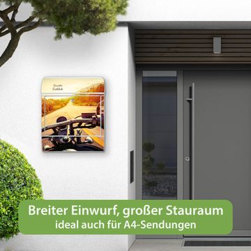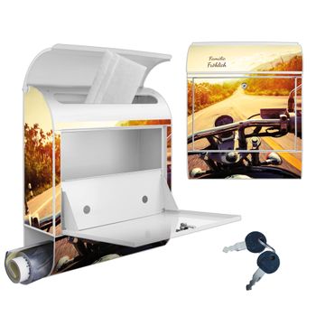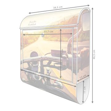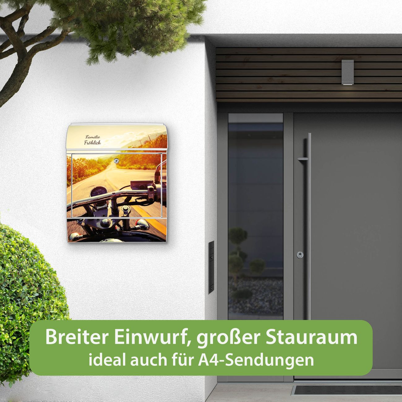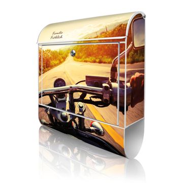DESIGN: Der Postkasten mit Motiv Motiv Easy Rider hat ein sehr ansprechendes und ausgefallenes Design, damit entlocken Sie Ihren Nachbarn und dem Postboten ein Lächeln. Heben Sie Sich von der tristen grauen Masse ab, ohne auf Funktionalität zu verzichten. DETAILS: Der Postkasten besteht aus pulverbeschichtetem Stahl. Er ist 38x46x12,5cm groß. Das Motiv besteht aus einer wetter- und UV-resistenten Folie, die mit einem Schutzlaminat überzogen ist, sodass der Briefkasten zusätzlich vor Kratzern geschützt ist. Der Briefkasten wird mit Montagematerial, zusätzlich zwei Schlüssel sowie einer Bohrschablone geliefert. NUTZEN: Sie können diesen Briefkasten sowohl als Wandbriefkasten montieren oder einen passenden Ständer kaufen und als Standbriefkasten einbetonieren. Die Größe bietet genügend Platz für Sendungen aller Art, der Einwurf fasst auch größere A4 Sendungen. BANJADO: Ihr Briefkasten wird in Sachsen in einer kleinen Manufaktur von Hand veredelt. Die Motivfolie ist lösungsmittelfrei und schutzlaminiert für einen langen Halt. Wir legen großen Wert auf die Verbindung von Funktionalität und Design. Sie erhalten Handarbeit aus Sachsen.