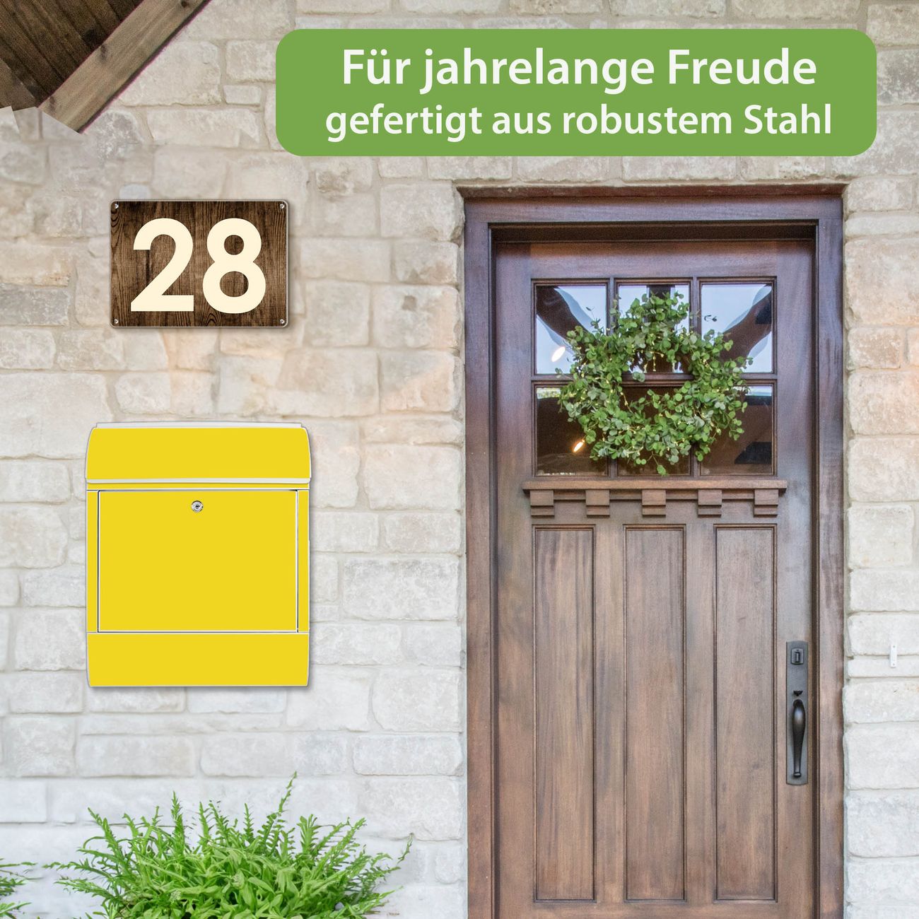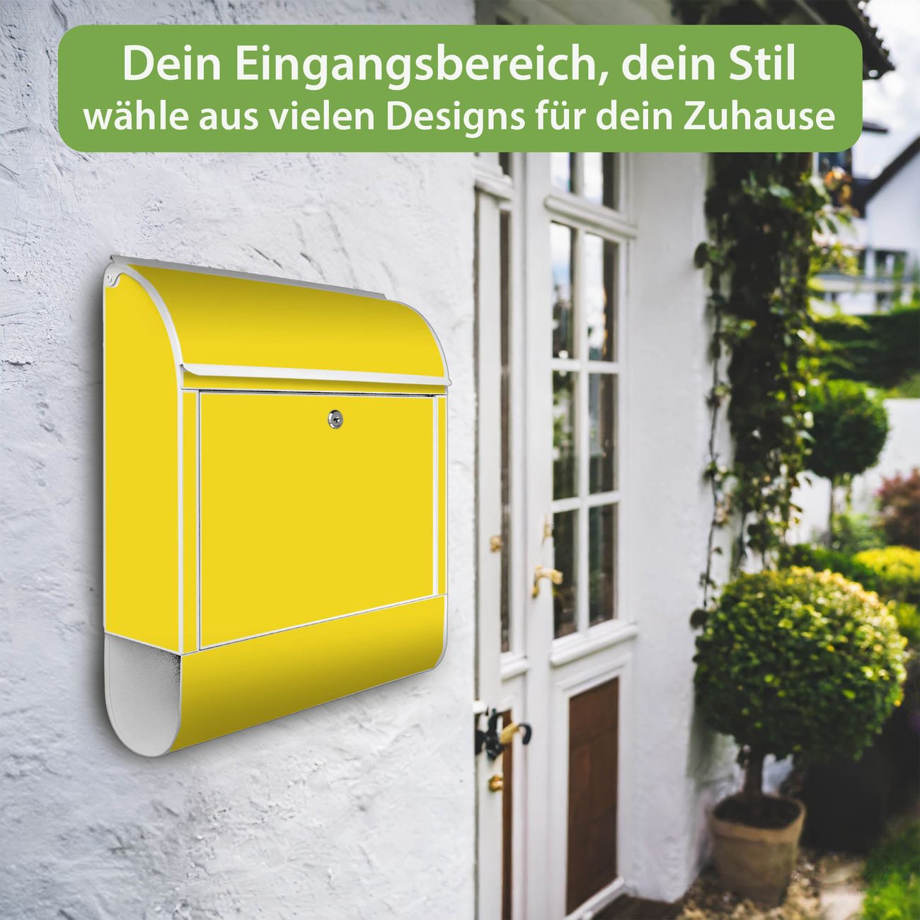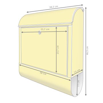 DESIGN: Der Postkasten mit Motiv Farbe Sonnengelb hat ein sehr ansprechendes und ausgefallenes Design, damit entlocken Sie Ihren Nachbarn und dem Postboten ein Lächeln. Heben Sie Sich von der tristen grauen Masse ab, ohne auf Funktionalität zu verzichten. DETAILS: Der Postkasten besteht aus pulverbeschichtetem Stahl. Er ist 38x46x12,5cm groß. Das Motiv besteht aus einer wetter- und UV-resistenten Folie, die mit einem Schutzlaminat überzogen ist, sodass der Briefkasten zusätzlich vor Kratzern geschützt ist. Der Briefkasten wird mit Montagematerial, zusätzlich zwei Schlüssel sowie einer Bohrschablone geliefert. NUTZEN: Sie können diesen Briefkasten sowohl als Wandbriefkasten montieren oder einen passenden Ständer kaufen und als Standbriefkasten einbetonieren. Die Größe bietet genügend Platz für Sendungen aller Art, der Einwurf fasst auch größere A4 Sendungen. BANJADO: Ihr Briefkasten wird in Sachsen in einer kleinen Manufaktur von Hand veredelt. Die Motivfolie ist lösungsmittelfrei und schutzlaminiert für einen langen Halt. Wir legen großen Wert auf die Verbindung von Funktionalität und Design. Sie erhalten Handarbeit aus Sachsen.
