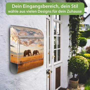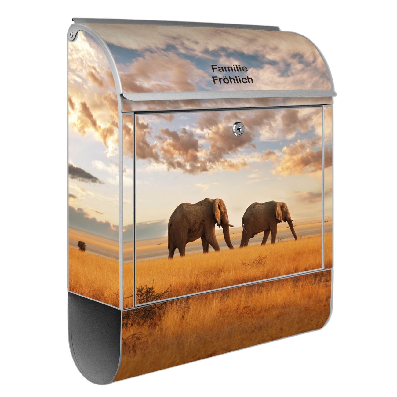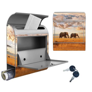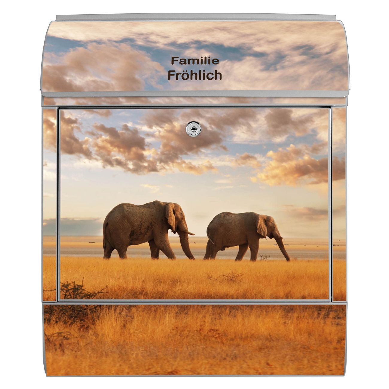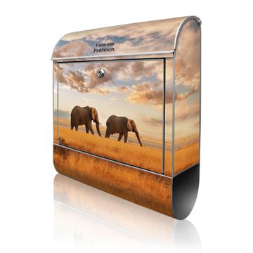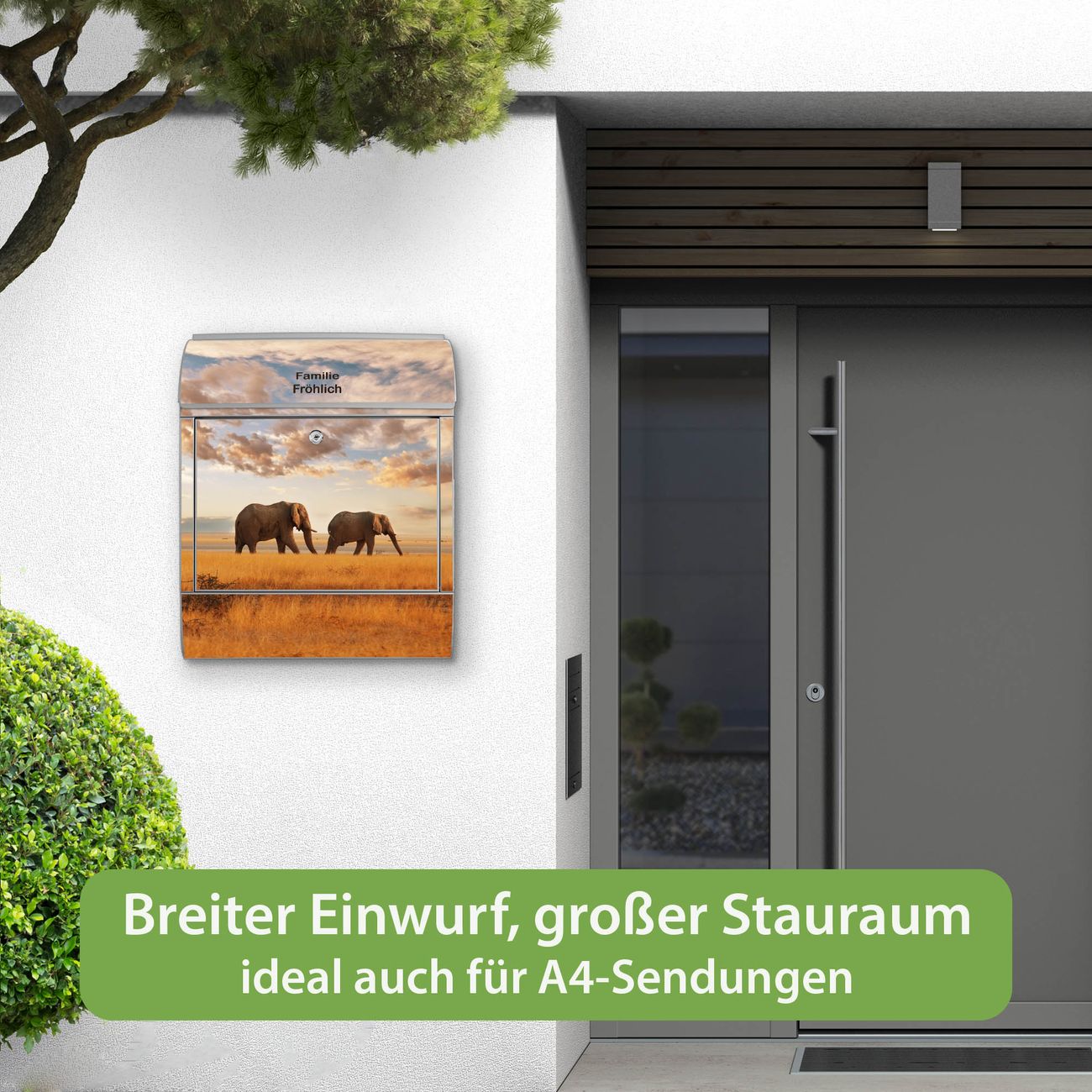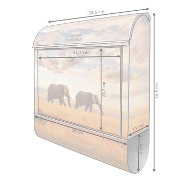 DESIGN: Der Postkasten mit Motiv Motiv Elefanten hat ein sehr ansprechendes und ausgefallenes Design, damit entlocken Sie Ihren Nachbarn und dem Postboten ein Lächeln. Heben Sie Sich von der tristen grauen Masse ab, ohne auf Funktionalität zu verzichten. DETAILS: Der Postkasten besteht aus pulverbeschichtetem Stahl. Er ist 38x46x12,5cm groß. Das Motiv besteht aus einer wetter- und UV-resistenten Folie, die mit einem Schutzlaminat überzogen ist, sodass der Briefkasten zusätzlich vor Kratzern geschützt ist. Der Briefkasten wird mit Montagematerial, zusätzlich zwei Schlüssel sowie einer Bohrschablone geliefert. NUTZEN: Sie können diesen Briefkasten sowohl als Wandbriefkasten montieren oder einen passenden Ständer kaufen und als Standbriefkasten einbetonieren. Die Größe bietet genügend Platz für Sendungen aller Art, der Einwurf fasst auch größere A4 Sendungen. BANJADO: Ihr Briefkasten wird in Sachsen in einer kleinen Manufaktur von Hand veredelt. Die Motivfolie ist lösungsmittelfrei und schutzlaminiert für einen langen Halt. Wir legen großen Wert auf die Verbindung von Funktionalität und Design. Sie erhalten Handarbeit aus Sachsen.