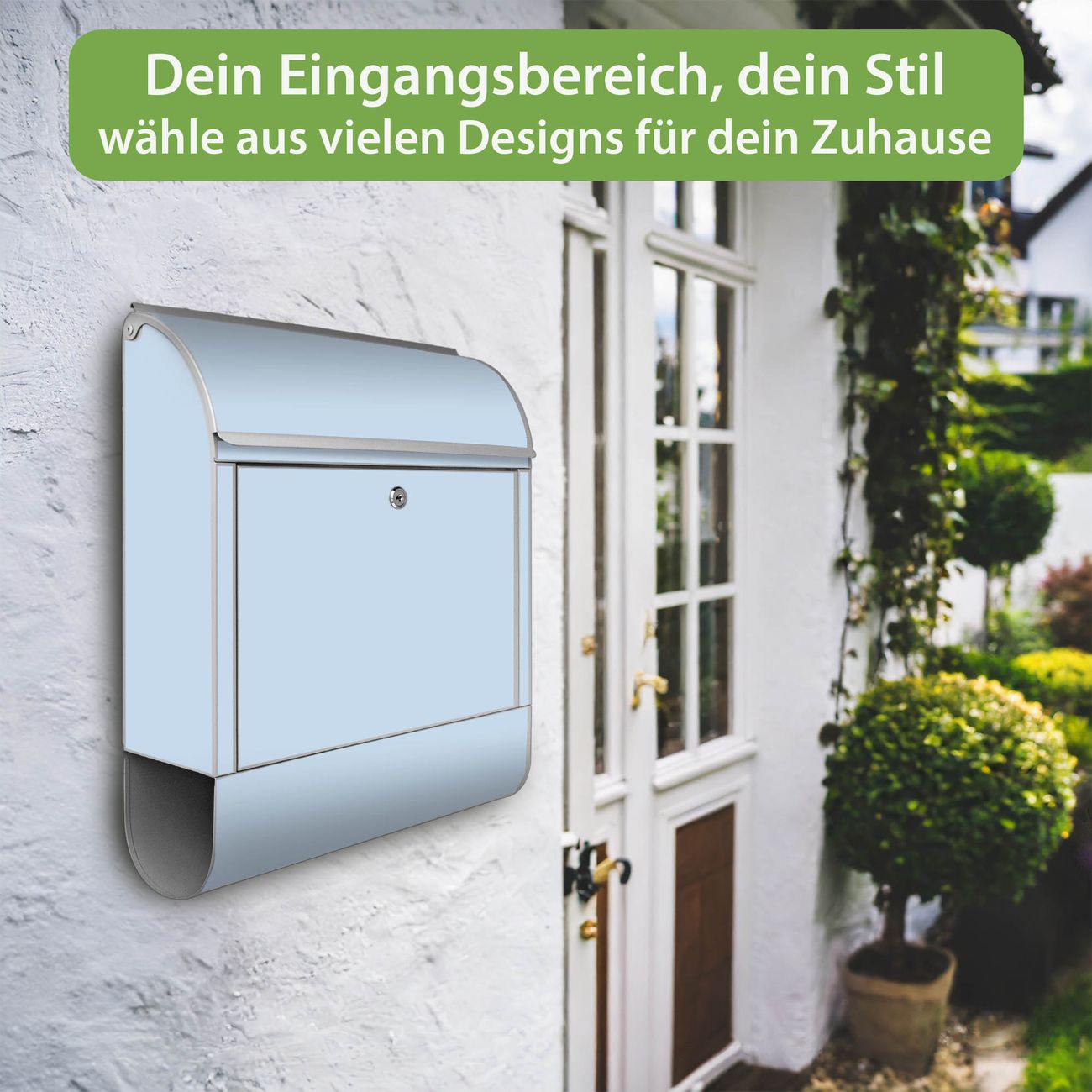DESIGN: Der Postkasten mit Motiv Farbe Himmelblau hat ein sehr ansprechendes und ausgefallenes Design, damit entlocken Sie Ihren Nachbarn und dem Postboten ein Lächeln. Heben Sie Sich von der tristen grauen Masse ab, ohne auf Funktionalität zu verzichten. DETAILS: Der Postkasten besteht aus pulverbeschichtetem Stahl. Er ist 38x46x12,5cm groß. Das Motiv besteht aus einer wetter- und UV-resistenten Folie, die mit einem Schutzlaminat überzogen ist, sodass der Briefkasten zusätzlich vor Kratzern geschützt ist. Der Briefkasten wird mit Montagematerial, zusätzlich zwei Schlüssel sowie einer Bohrschablone geliefert. NUTZEN: Sie können diesen Briefkasten sowohl als Wandbriefkasten montieren oder einen passenden Ständer kaufen und als Standbriefkasten einbetonieren. Die Größe bietet genügend Platz für Sendungen aller Art, der Einwurf fasst auch größere A4 Sendungen. BANJADO: Ihr Briefkasten wird in Sachsen in einer kleinen Manufaktur von Hand veredelt. Die Motivfolie ist lösungsmittelfrei und schutzlaminiert für einen langen Halt. Wir legen großen Wert auf die Verbindung von Funktionalität und Design. Sie erhalten Handarbeit aus Sachsen.