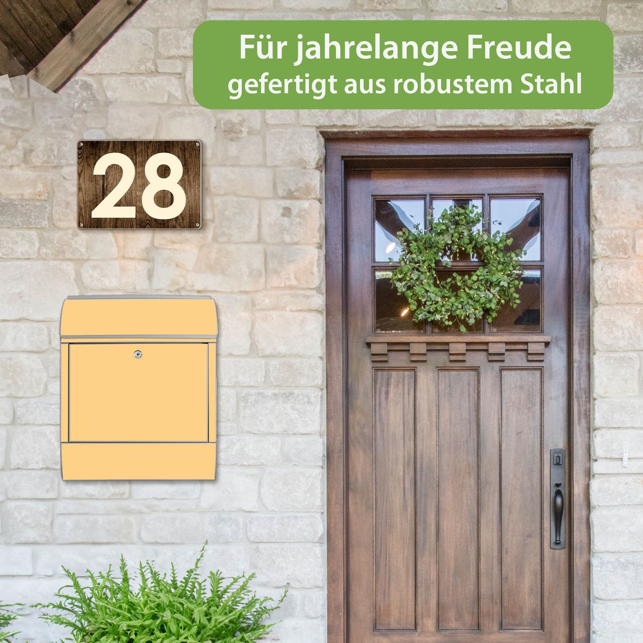 DESIGN: Der Postkasten mit Motiv Farbe Mandarine hat ein sehr ansprechendes und ausgefallenes Design, damit entlocken Sie Ihren Nachbarn und dem Postboten ein Lächeln. Heben Sie Sich von der tristen grauen Masse ab, ohne auf Funktionalität zu verzichten. DETAILS: Der Postkasten besteht aus pulverbeschichtetem Stahl. Er ist 38x46x12,5cm groß. Das Motiv besteht aus einer wetter- und UV-resistenten Folie, die mit einem Schutzlaminat überzogen ist, sodass der Briefkasten zusätzlich vor Kratzern geschützt ist. Der Briefkasten wird mit Montagematerial, zusätzlich zwei Schlüssel sowie einer Bohrschablone geliefert. NUTZEN: Sie können diesen Briefkasten sowohl als Wandbriefkasten montieren oder einen passenden Ständer kaufen und als Standbriefkasten einbetonieren. Die Größe bietet genügend Platz für Sendungen aller Art, der Einwurf fasst auch größere A4 Sendungen. BANJADO: Ihr Briefkasten wird in Sachsen in einer kleinen Manufaktur von Hand veredelt. Die Motivfolie ist lösungsmittelfrei und schutzlaminiert für einen langen Halt. Wir legen großen Wert auf die Verbindung von Funktionalität und Design. Sie erhalten Handarbeit aus Sachsen.