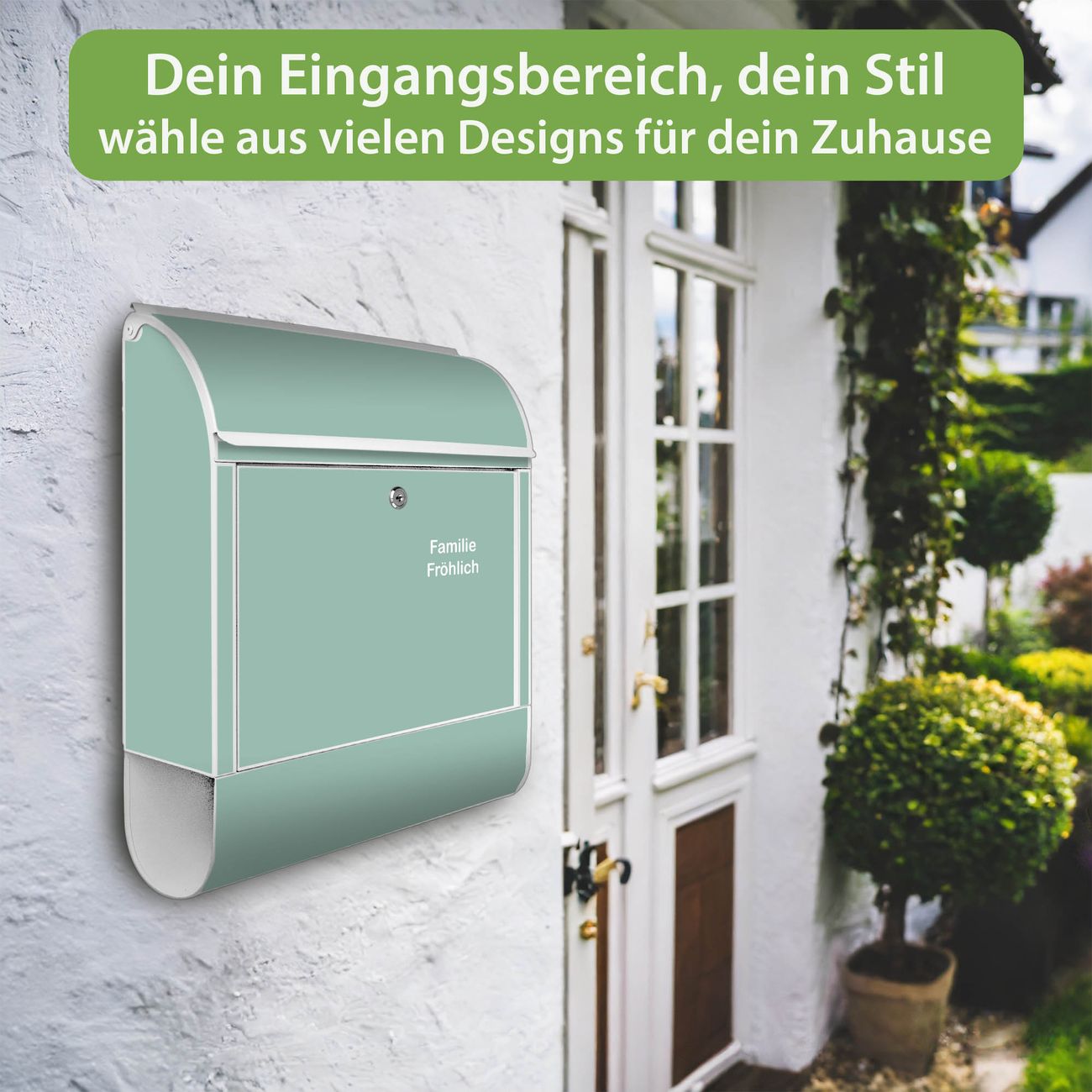 DESIGN: Der Postkasten mit Motiv Farbe Salbei hat ein sehr ansprechendes und ausgefallenes Design, damit entlocken Sie Ihren Nachbarn und dem Postboten ein Lächeln. Heben Sie Sich von der tristen grauen Masse ab, ohne auf Funktionalität zu verzichten. DETAILS: Der Postkasten besteht aus pulverbeschichtetem Stahl. Er ist 38x46x12,5cm groß. Das Motiv besteht aus einer wetter- und UV-resistenten Folie, die mit einem Schutzlaminat überzogen ist, sodass der Briefkasten zusätzlich vor Kratzern geschützt ist. Der Briefkasten wird mit Montagematerial, zusätzlich zwei Schlüssel sowie einer Bohrschablone geliefert. NUTZEN: Sie können diesen Briefkasten sowohl als Wandbriefkasten montieren oder einen passenden Ständer kaufen und als Standbriefkasten einbetonieren. Die Größe bietet genügend Platz für Sendungen aller Art, der Einwurf fasst auch größere A4 Sendungen. BANJADO: Ihr Briefkasten wird in Sachsen in einer kleinen Manufaktur von Hand veredelt. Die Motivfolie ist lösungsmittelfrei und schutzlaminiert für einen langen Halt. Wir legen großen Wert auf die Verbindung von Funktionalität und Design. Sie erhalten Handarbeit aus Sachsen.