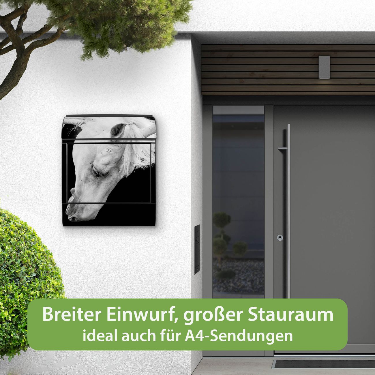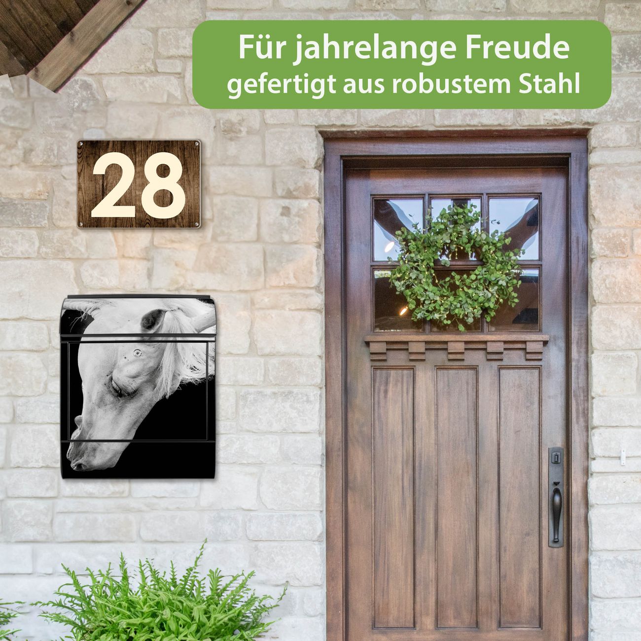 DESIGN: Der Postkasten mit Motiv Motiv Frederik hat ein sehr ansprechendes und ausgefallenes Design, damit entlocken Sie Ihren Nachbarn und dem Postboten ein Lächeln. Heben Sie Sich von der tristen grauen Masse ab, ohne auf Funktionalität zu verzichten. DETAILS: Der Postkasten besteht aus pulverbeschichtetem Stahl. Er ist 38x46x12,5cm groß. Das Motiv besteht aus einer wetter- und UV-resistenten Folie, die mit einem Schutzlaminat überzogen ist, sodass der Briefkasten zusätzlich vor Kratzern geschützt ist. Der Briefkasten wird mit Montagematerial, zusätzlich zwei Schlüssel sowie einer Bohrschablone geliefert. NUTZEN: Sie können diesen Briefkasten sowohl als Wandbriefkasten montieren oder einen passenden Ständer kaufen und als Standbriefkasten einbetonieren. Die Größe bietet genügend Platz für Sendungen aller Art, der Einwurf fasst auch größere A4 Sendungen. BANJADO: Ihr Briefkasten wird in Sachsen in einer kleinen Manufaktur von Hand veredelt. Die Motivfolie ist lösungsmittelfrei und schutzlaminiert für einen langen Halt. Wir legen großen Wert auf die Verbindung von Funktionalität und Design. Sie erhalten Handarbeit aus Sachsen.