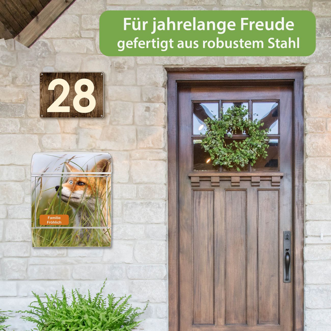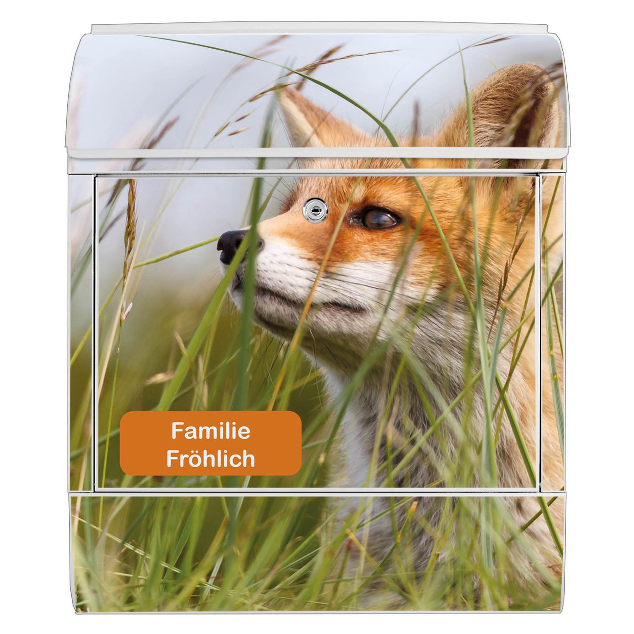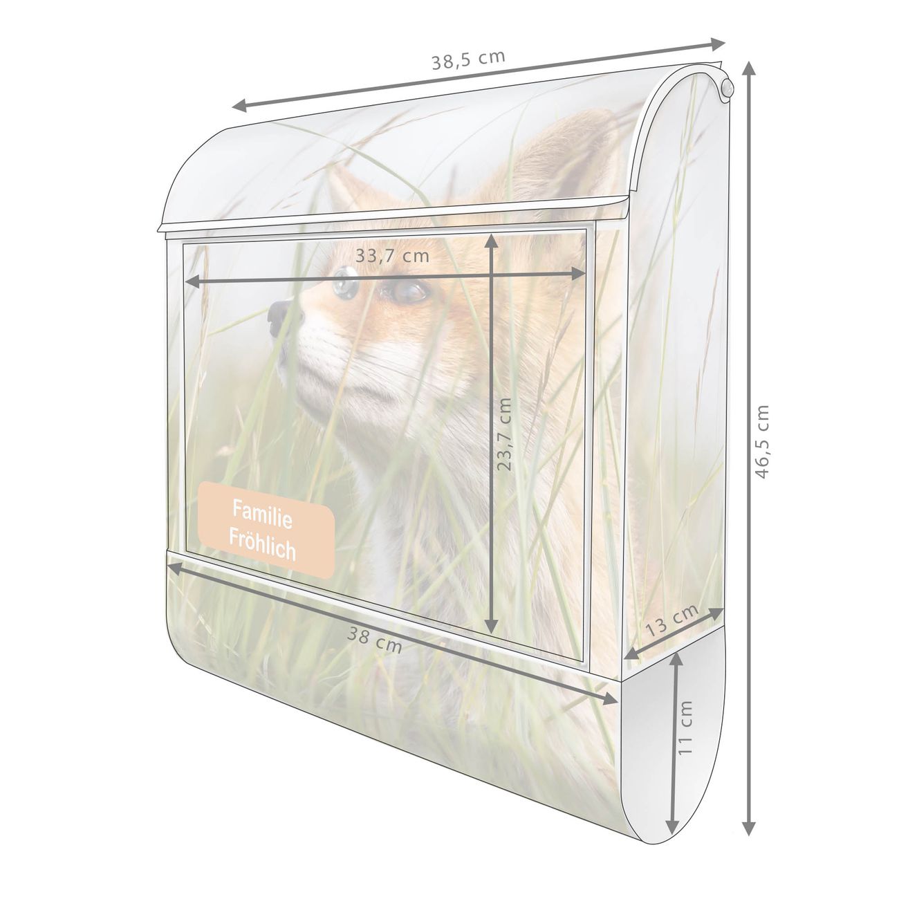 DESIGN: Der Postkasten mit Motiv Motiv Fuchs hat ein sehr ansprechendes und ausgefallenes Design, damit entlocken Sie Ihren Nachbarn und dem Postboten ein Lächeln. Heben Sie Sich von der tristen grauen Masse ab, ohne auf Funktionalität zu verzichten. DETAILS: Der Postkasten besteht aus pulverbeschichtetem Stahl. Er ist 38x46x12,5cm groß. Das Motiv besteht aus einer wetter- und UV-resistenten Folie, die mit einem Schutzlaminat überzogen ist, sodass der Briefkasten zusätzlich vor Kratzern geschützt ist. Der Briefkasten wird mit Montagematerial, zusätzlich zwei Schlüssel sowie einer Bohrschablone geliefert. NUTZEN: Sie können diesen Briefkasten sowohl als Wandbriefkasten montieren oder einen passenden Ständer kaufen und als Standbriefkasten einbetonieren. Die Größe bietet genügend Platz für Sendungen aller Art, der Einwurf fasst auch größere A4 Sendungen. BANJADO: Ihr Briefkasten wird in Sachsen in einer kleinen Manufaktur von Hand veredelt. Die Motivfolie ist lösungsmittelfrei und schutzlaminiert für einen langen Halt. Wir legen großen Wert auf die Verbindung von Funktionalität und Design. Sie erhalten Handarbeit aus Sachsen.