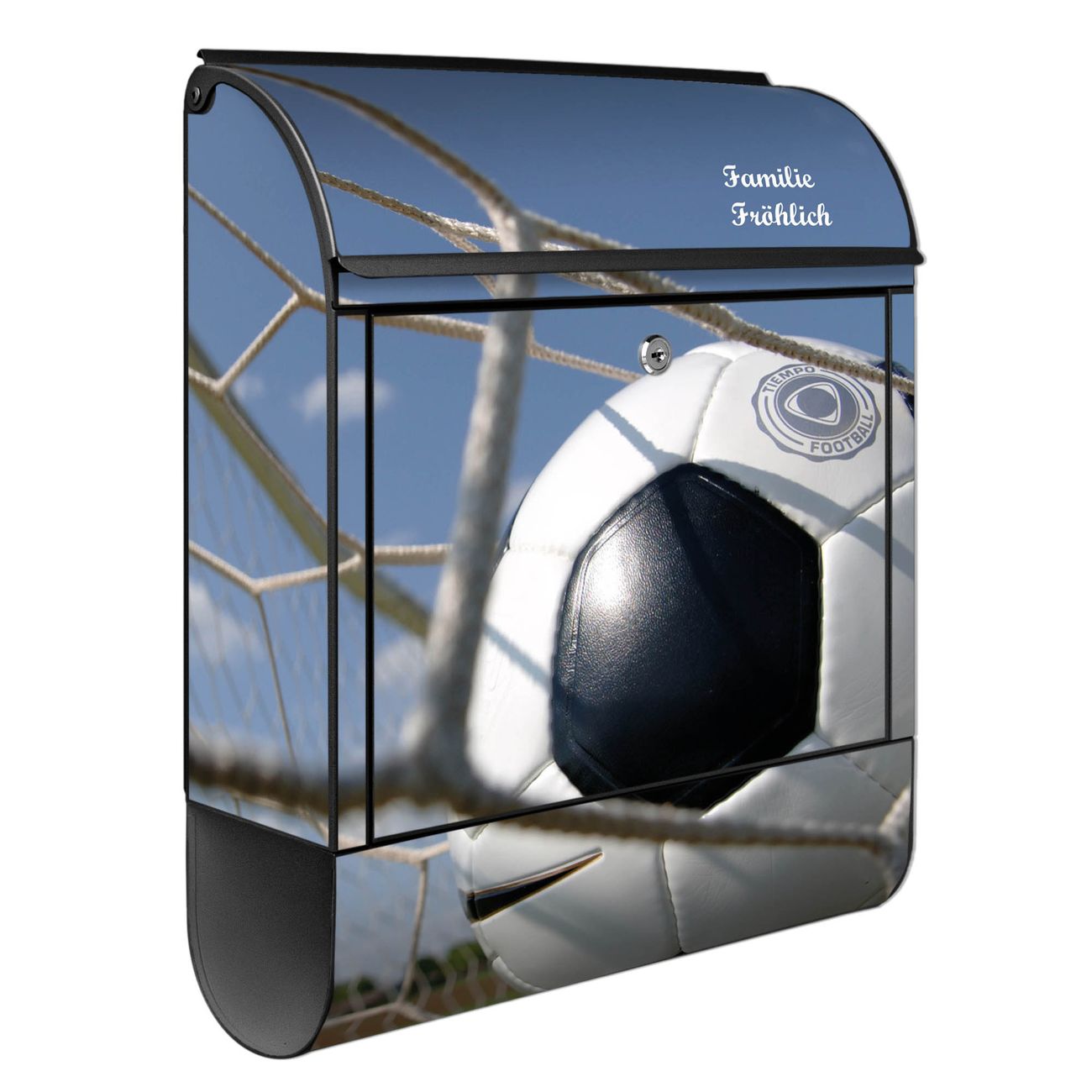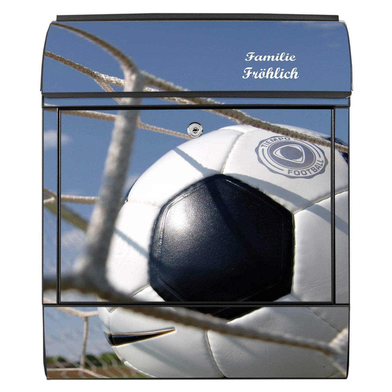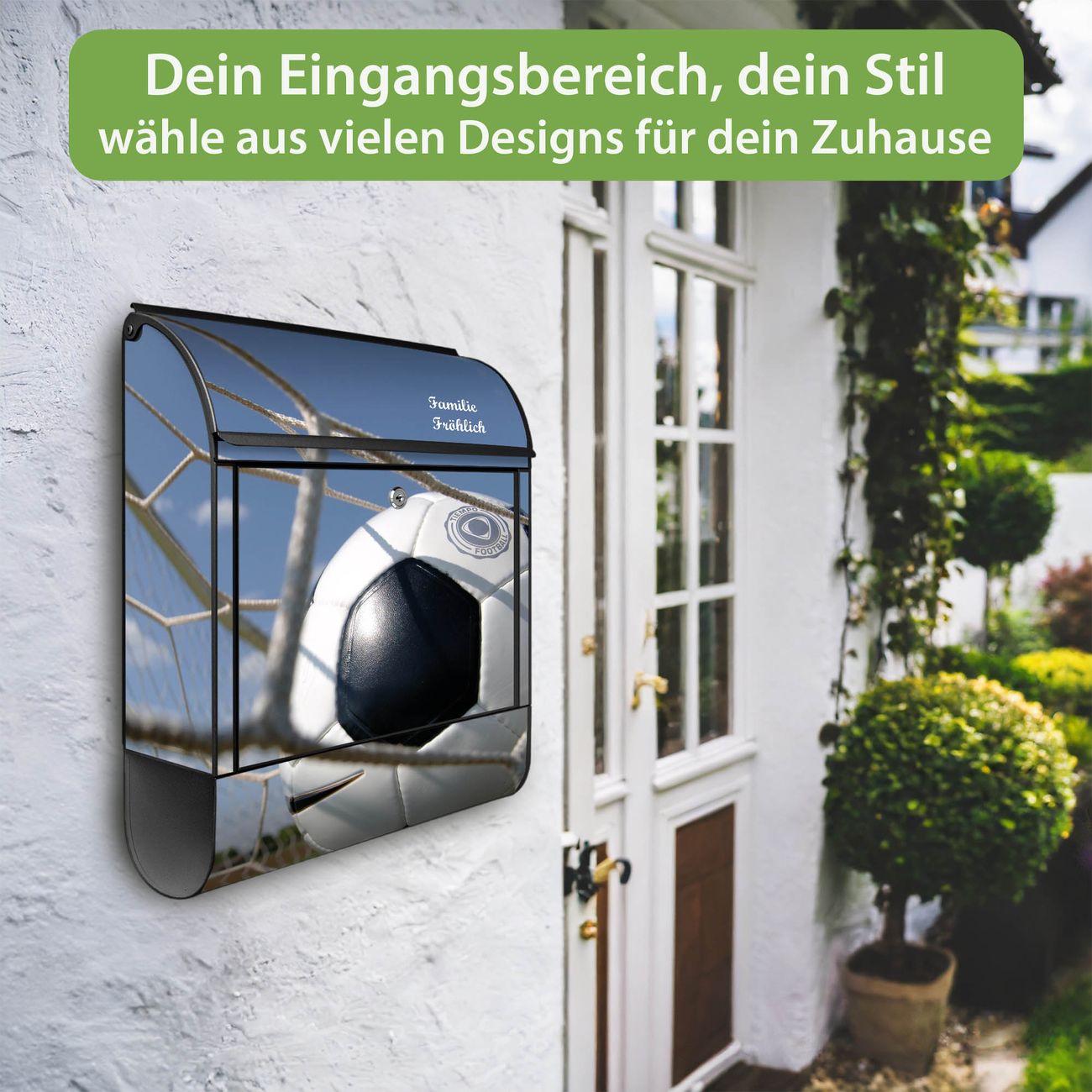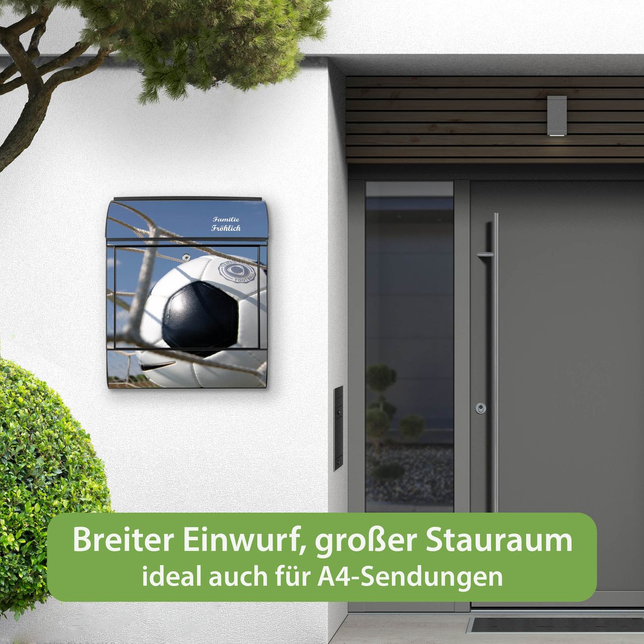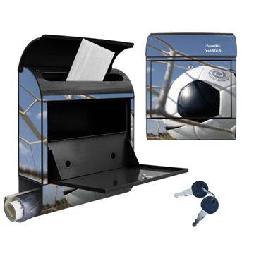 DESIGN: Der Postkasten mit Motiv Motiv Fußball hat ein sehr ansprechendes und ausgefallenes Design, damit entlocken Sie Ihren Nachbarn und dem Postboten ein Lächeln. Heben Sie Sich von der tristen grauen Masse ab, ohne auf Funktionalität zu verzichten. DETAILS: Der Postkasten besteht aus pulverbeschichtetem Stahl. Er ist 38x46x12,5cm groß. Das Motiv besteht aus einer wetter- und UV-resistenten Folie, die mit einem Schutzlaminat überzogen ist, sodass der Briefkasten zusätzlich vor Kratzern geschützt ist. Der Briefkasten wird mit Montagematerial, zusätzlich zwei Schlüssel sowie einer Bohrschablone geliefert. NUTZEN: Sie können diesen Briefkasten sowohl als Wandbriefkasten montieren oder einen passenden Ständer kaufen und als Standbriefkasten einbetonieren. Die Größe bietet genügend Platz für Sendungen aller Art, der Einwurf fasst auch größere A4 Sendungen. BANJADO: Ihr Briefkasten wird in Sachsen in einer kleinen Manufaktur von Hand veredelt. Die Motivfolie ist lösungsmittelfrei und schutzlaminiert für einen langen Halt. Wir legen großen Wert auf die Verbindung von Funktionalität und Design. Sie erhalten Handarbeit aus Sachsen.