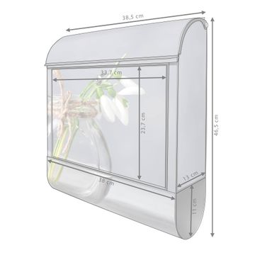 DESIGN: Der Postkasten mit Motiv Motiv Gänseblümchen im Glas hat ein sehr ansprechendes und ausgefallenes Design, damit entlocken Sie Ihren Nachbarn und dem Postboten ein Lächeln. Heben Sie Sich von der tristen grauen Masse ab, ohne auf Funktionalität zu verzichten. DETAILS: Der Postkasten besteht aus pulverbeschichtetem Stahl. Er ist 38x46x12,5cm groß. Das Motiv besteht aus einer wetter- und UV-resistenten Folie, die mit einem Schutzlaminat überzogen ist, sodass der Briefkasten zusätzlich vor Kratzern geschützt ist. Der Briefkasten wird mit Montagematerial, zusätzlich zwei Schlüssel sowie einer Bohrschablone geliefert. NUTZEN: Sie können diesen Briefkasten sowohl als Wandbriefkasten montieren oder einen passenden Ständer kaufen und als Standbriefkasten einbetonieren. Die Größe bietet genügend Platz für Sendungen aller Art, der Einwurf fasst auch größere A4 Sendungen. BANJADO: Ihr Briefkasten wird in Sachsen in einer kleinen Manufaktur von Hand veredelt. Die Motivfolie ist lösungsmittelfrei und schutzlaminiert für einen langen Halt. Wir legen großen Wert auf die Verbindung von Funktionalität und Design. Sie erhalten Handarbeit aus Sachsen.
