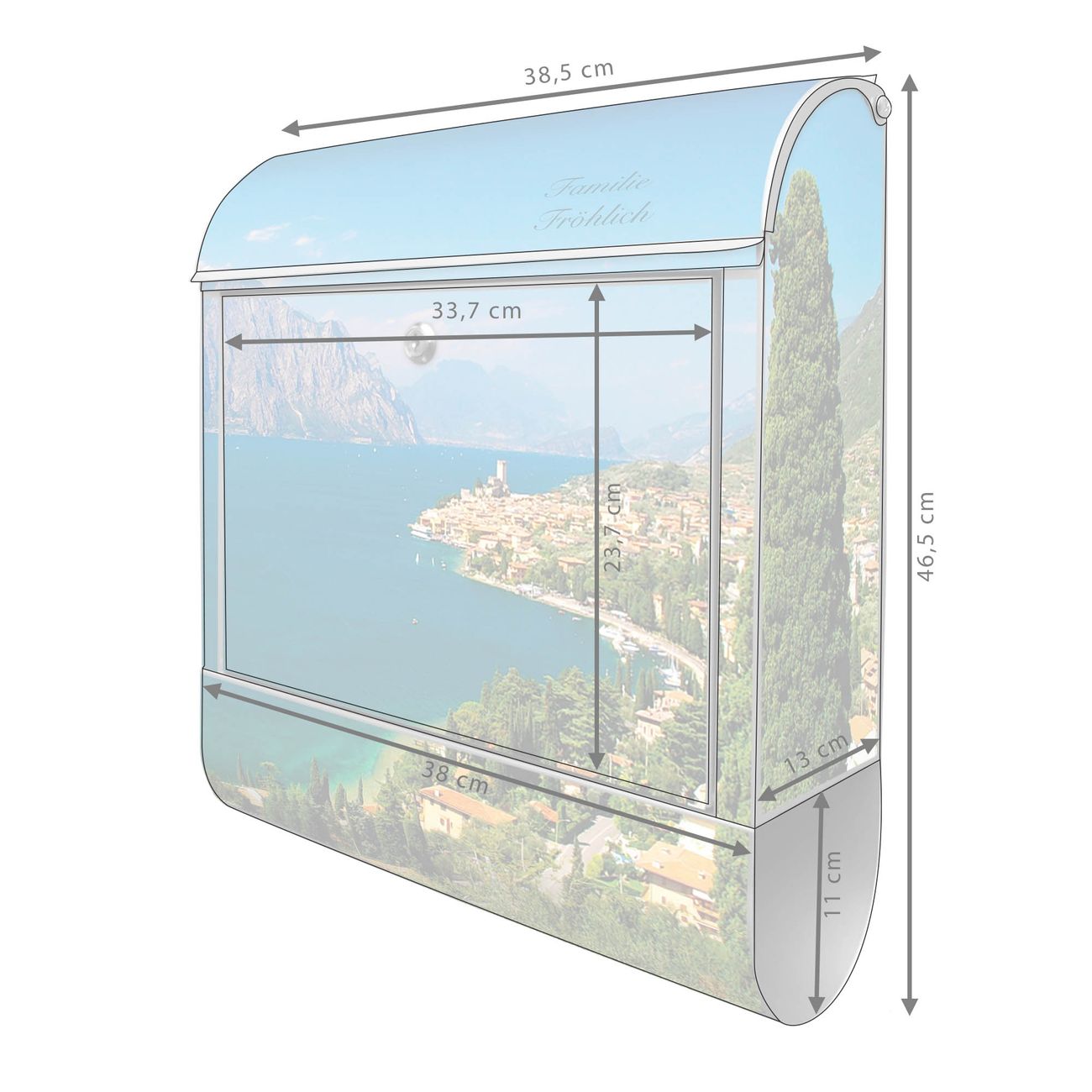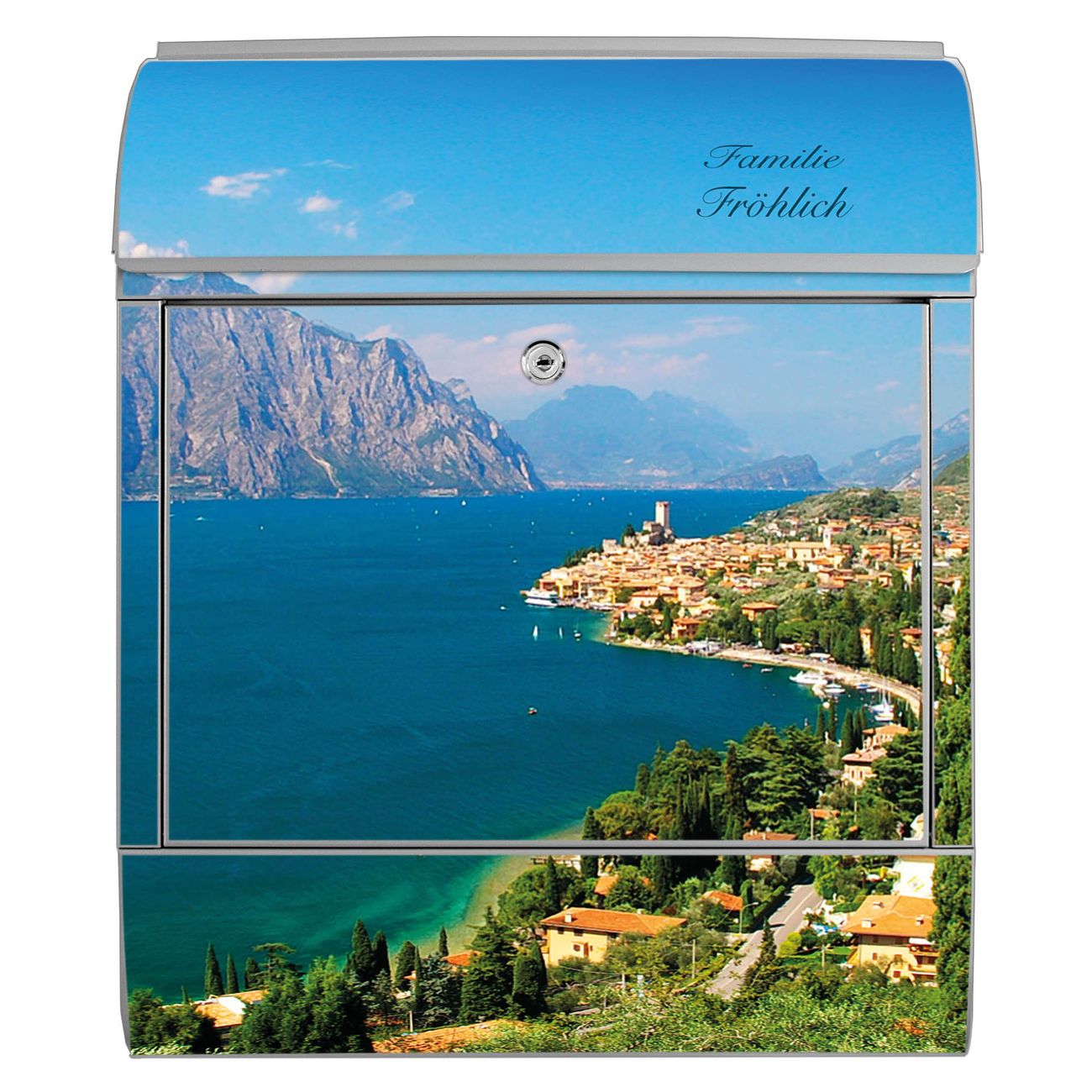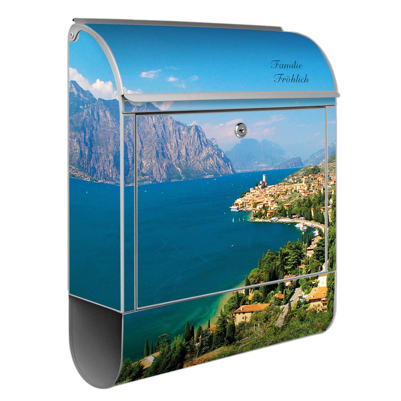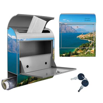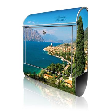 DESIGN: Der Postkasten mit Motiv Motiv Gardasee hat ein sehr ansprechendes und ausgefallenes Design, damit entlocken Sie Ihren Nachbarn und dem Postboten ein Lächeln. Heben Sie Sich von der tristen grauen Masse ab, ohne auf Funktionalität zu verzichten. DETAILS: Der Postkasten besteht aus pulverbeschichtetem Stahl. Er ist 38x46x12,5cm groß. Das Motiv besteht aus einer wetter- und UV-resistenten Folie, die mit einem Schutzlaminat überzogen ist, sodass der Briefkasten zusätzlich vor Kratzern geschützt ist. Der Briefkasten wird mit Montagematerial, zusätzlich zwei Schlüssel sowie einer Bohrschablone geliefert. NUTZEN: Sie können diesen Briefkasten sowohl als Wandbriefkasten montieren oder einen passenden Ständer kaufen und als Standbriefkasten einbetonieren. Die Größe bietet genügend Platz für Sendungen aller Art, der Einwurf fasst auch größere A4 Sendungen. BANJADO: Ihr Briefkasten wird in Sachsen in einer kleinen Manufaktur von Hand veredelt. Die Motivfolie ist lösungsmittelfrei und schutzlaminiert für einen langen Halt. Wir legen großen Wert auf die Verbindung von Funktionalität und Design. Sie erhalten Handarbeit aus Sachsen.