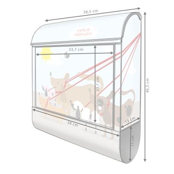 DESIGN: Der Postkasten mit Motiv Motiv Gassi Gehen hat ein sehr ansprechendes und ausgefallenes Design, damit entlocken Sie Ihren Nachbarn und dem Postboten ein Lächeln. Heben Sie Sich von der tristen grauen Masse ab, ohne auf Funktionalität zu verzichten. DETAILS: Der Postkasten besteht aus pulverbeschichtetem Stahl. Er ist 38x46x12,5cm groß. Das Motiv besteht aus einer wetter- und UV-resistenten Folie, die mit einem Schutzlaminat überzogen ist, sodass der Briefkasten zusätzlich vor Kratzern geschützt ist. Der Briefkasten wird mit Montagematerial, zusätzlich zwei Schlüssel sowie einer Bohrschablone geliefert. NUTZEN: Sie können diesen Briefkasten sowohl als Wandbriefkasten montieren oder einen passenden Ständer kaufen und als Standbriefkasten einbetonieren. Die Größe bietet genügend Platz für Sendungen aller Art, der Einwurf fasst auch größere A4 Sendungen. BANJADO: Ihr Briefkasten wird in Sachsen in einer kleinen Manufaktur von Hand veredelt. Die Motivfolie ist lösungsmittelfrei und schutzlaminiert für einen langen Halt. Wir legen großen Wert auf die Verbindung von Funktionalität und Design. Sie erhalten Handarbeit aus Sachsen.